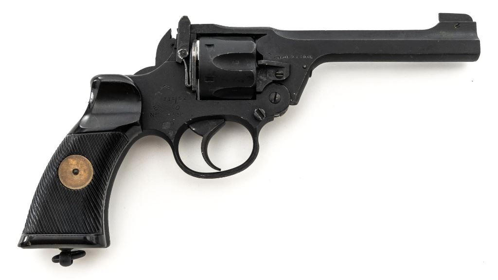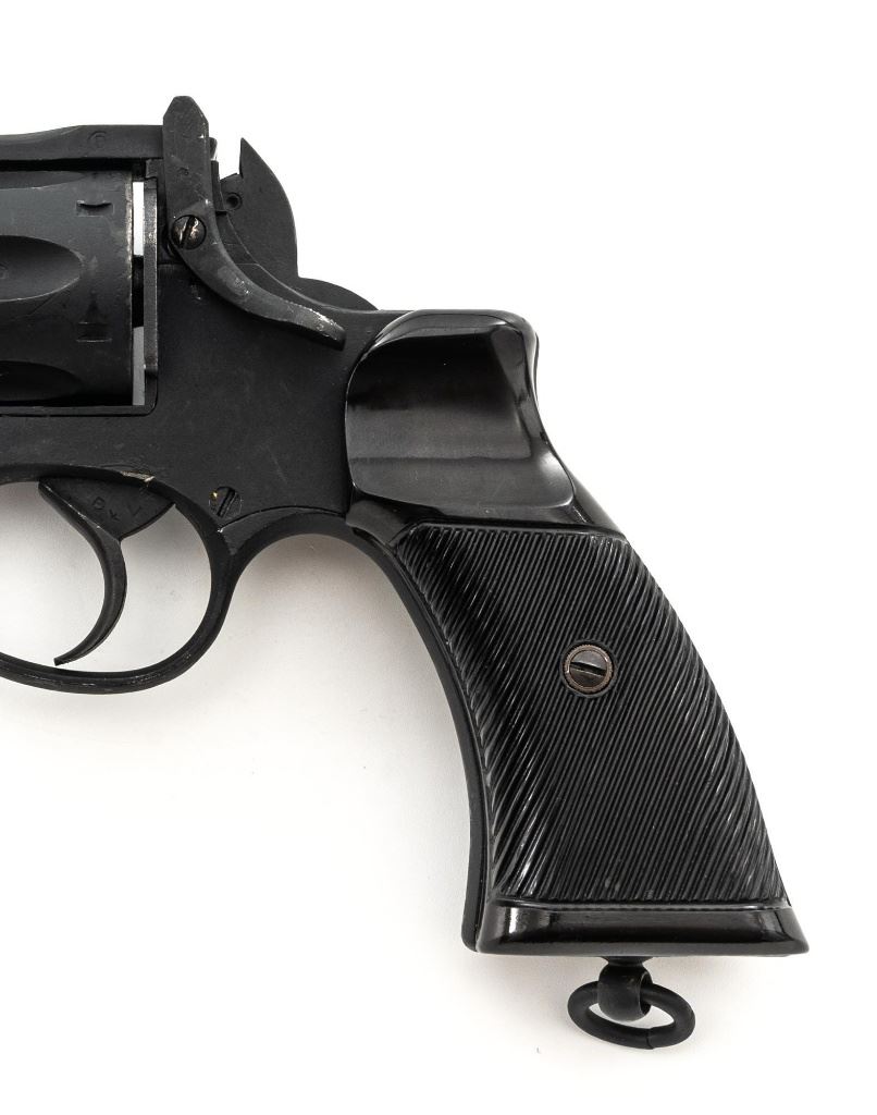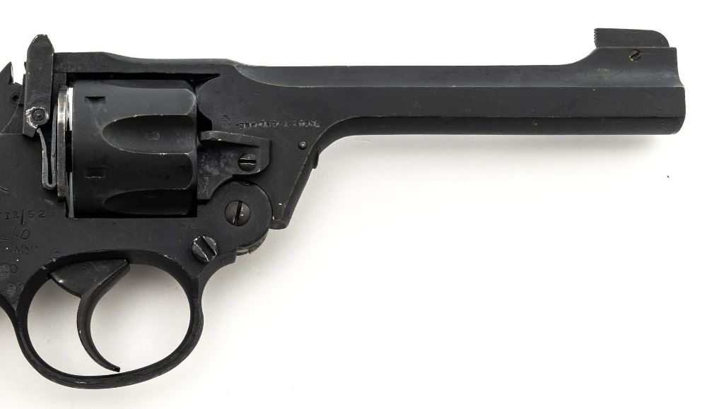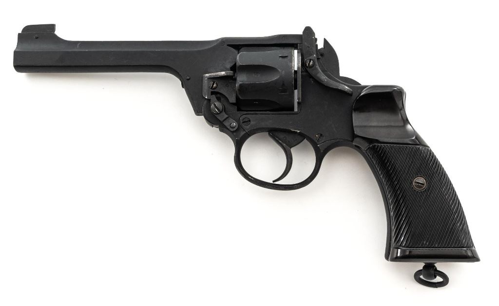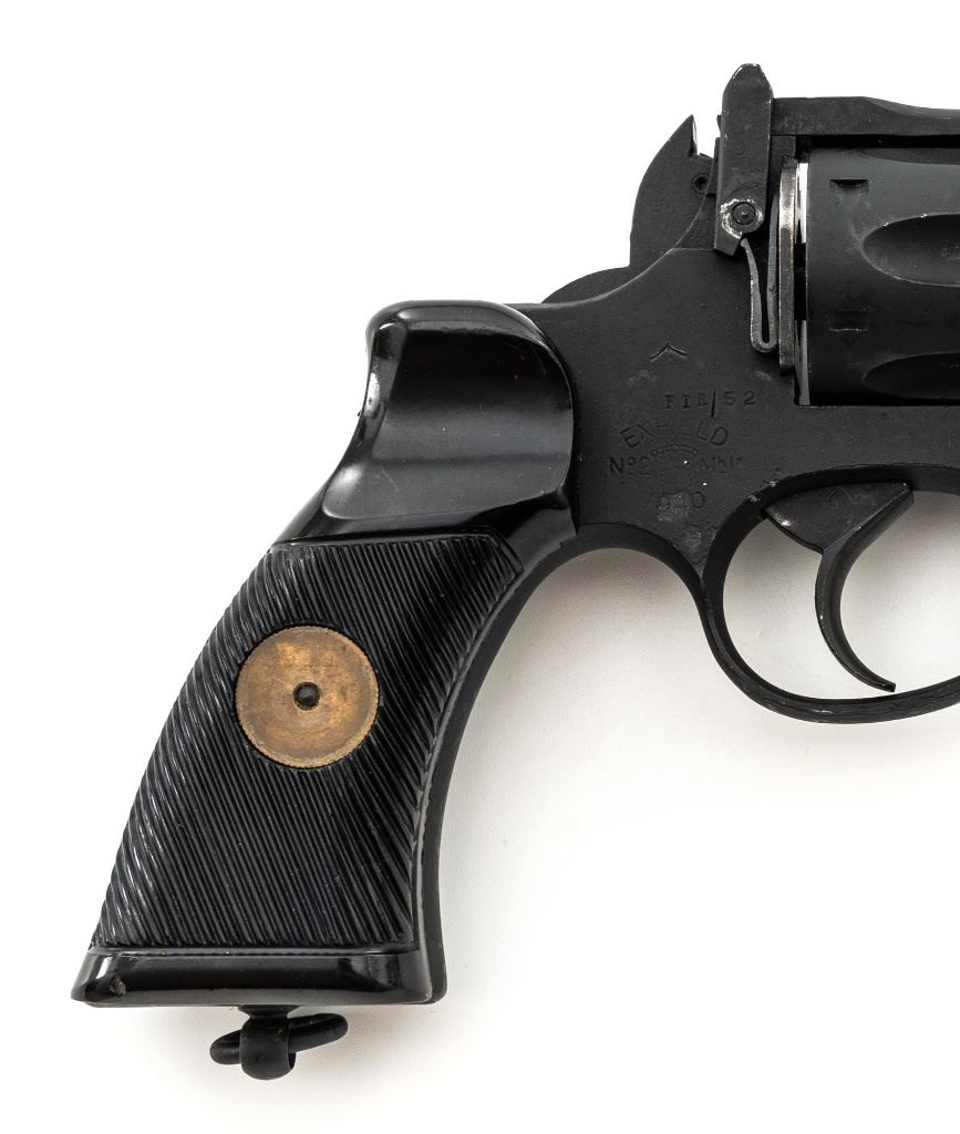 British Enfield No.2 Mk 1* Double Action Revolver, #L5605, .38 S&W cal., 5" flat sided barrel, blackened finish, grooved black plastic grips with a brass stock disc on the right side, pinned blade front sight, fixed rear sight with square-notched groove, and swiveling steel lanyard ring at bottom of the grip frame. Right side of the frame is marked "ENFIELD/No 2(crown)Mk 1*/1940". "CAL.38/(broad arrow)/(firing proof)" on top of the barrel. Pistol was arsenal reconditioned and is stamped "(broad arrow)/FTR/52" above the factory markings. Matching numbers. Import stamped on underside of the barrel, with London export proof marks on the right side. Condition overall is very good, retaining approx. 95% black refinish, showing light wear. Grips show moderate handling wear. Action locks up, cycles, and ejects smoothly. Bright bore rates excellent, with well-defined rifling. Est.:$400-$600. (C&R/PPT)