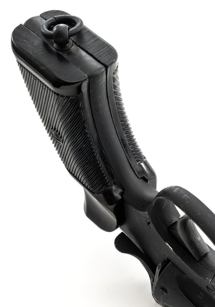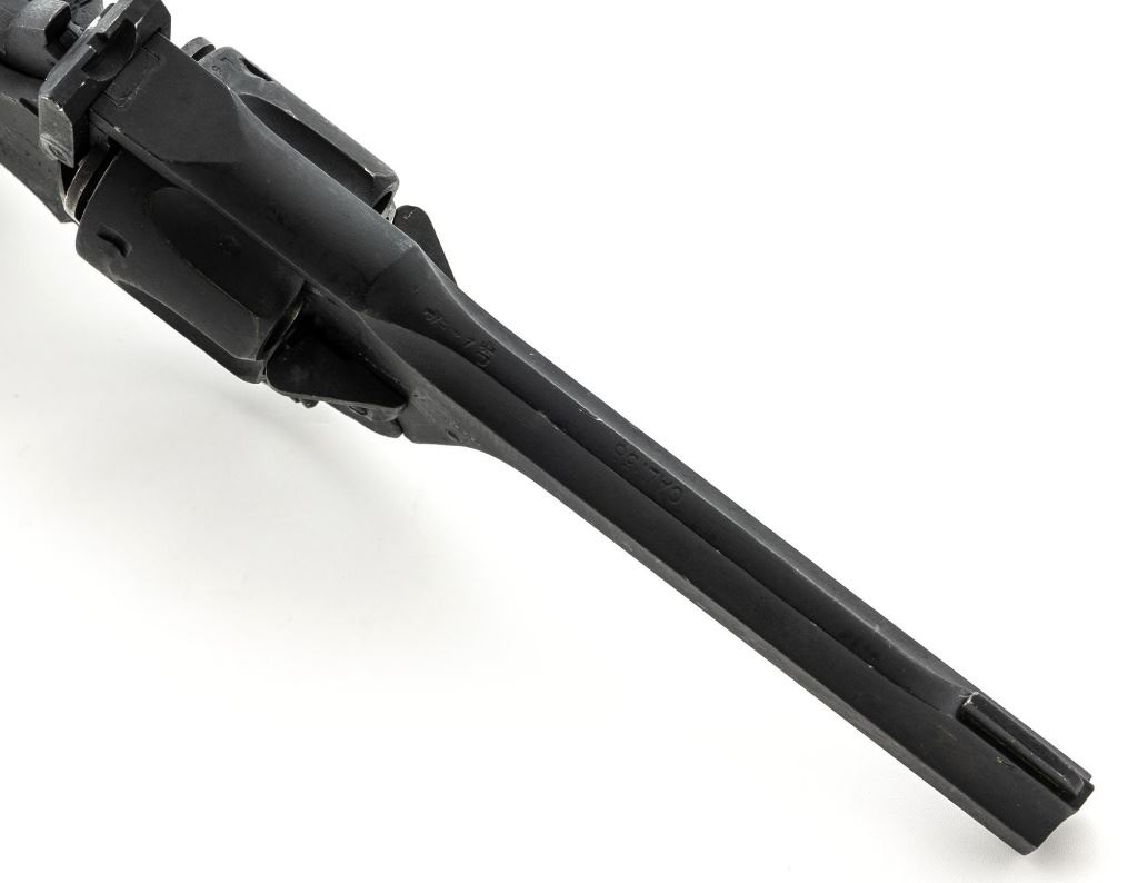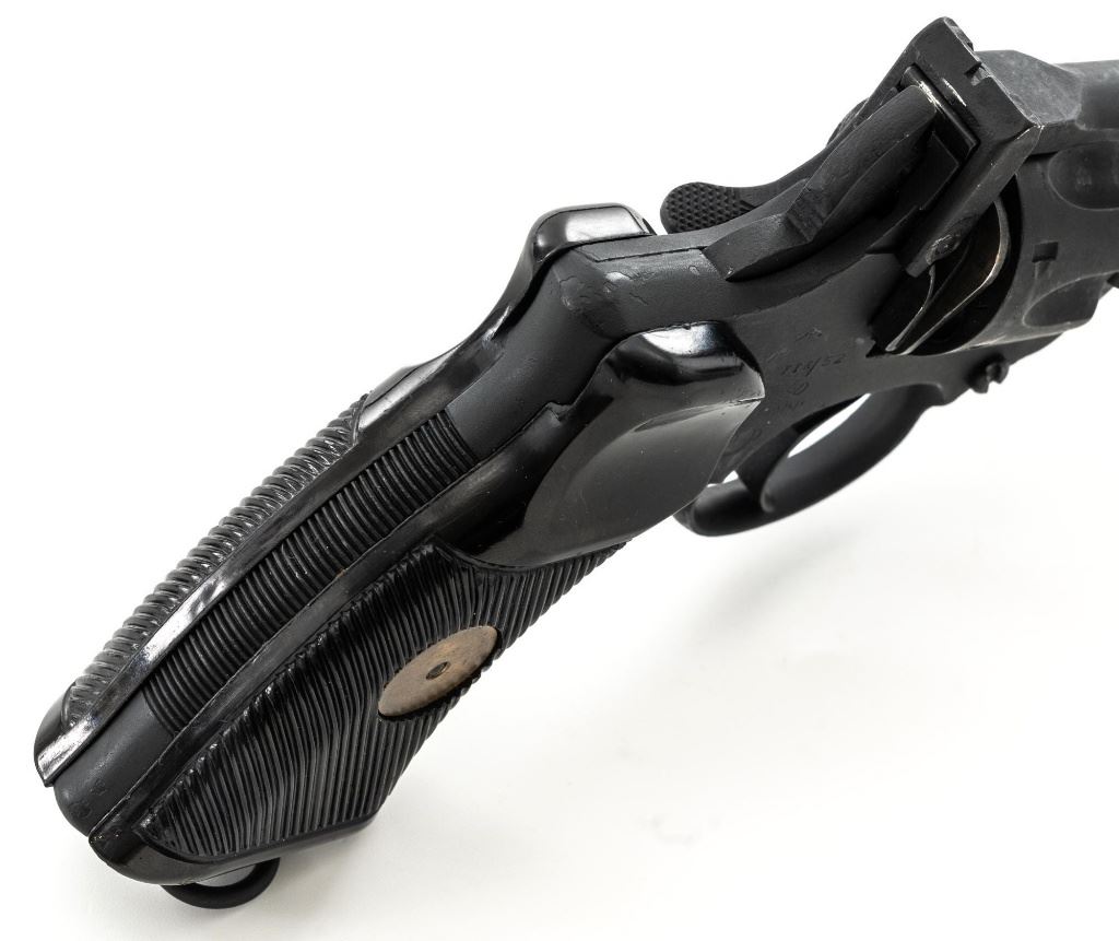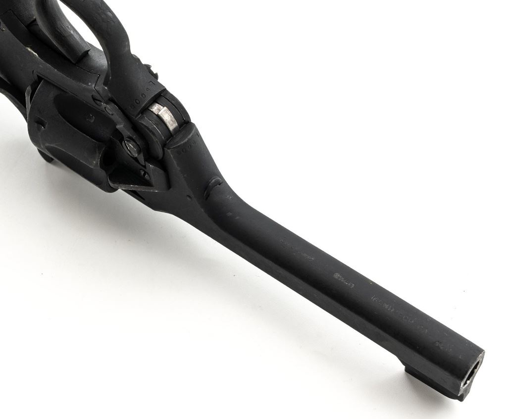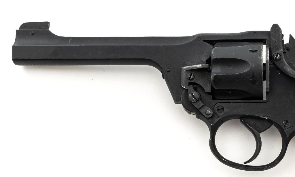 British Enfield No.2 Mk 1* Double Action Revolver, #L5605, .38 S&W cal., 5" flat sided barrel, blackened finish, grooved black plastic grips with a brass stock disc on the right side, pinned blade front sight, fixed rear sight with square-notched groove, and swiveling steel lanyard ring at bottom of the grip frame. Right side of the frame is marked "ENFIELD/No 2(crown)Mk 1*/1940". "CAL.38/(broad arrow)/(firing proof)" on top of the barrel. Pistol was arsenal reconditioned and is stamped "(broad arrow)/FTR/52" above the factory markings. Matching numbers. Import stamped on underside of the barrel, with London export proof marks on the right side. Condition overall is very good, retaining approx. 95% black refinish, showing light wear. Grips show moderate handling wear. Action locks up, cycles, and ejects smoothly. Bright bore rates excellent, with well-defined rifling. Est.:$400-$600. (C&R/PPT)