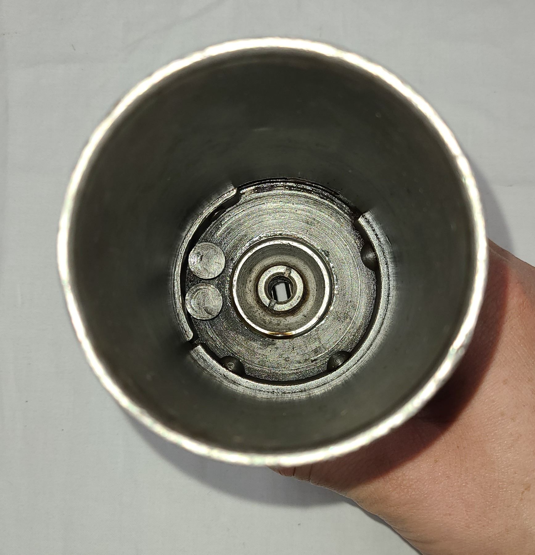 The cup clamped to the muzzle of the Lee Enfield rifle. The rifle was held at a 45 degree angle and