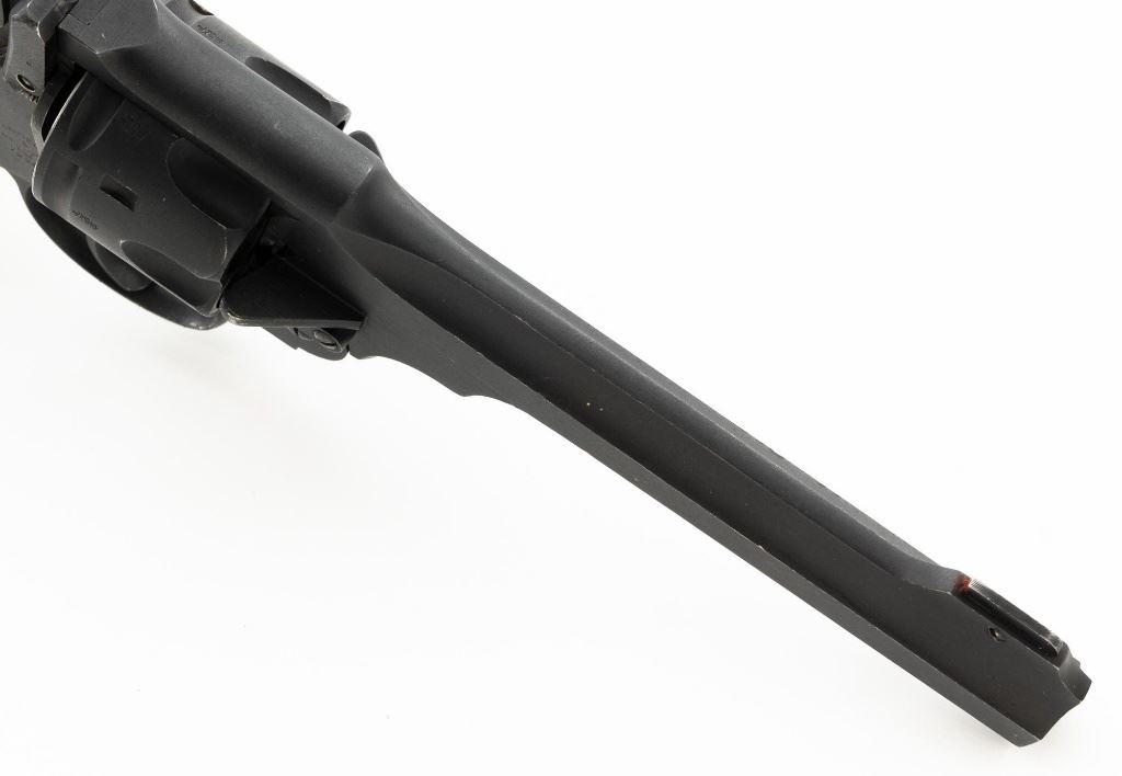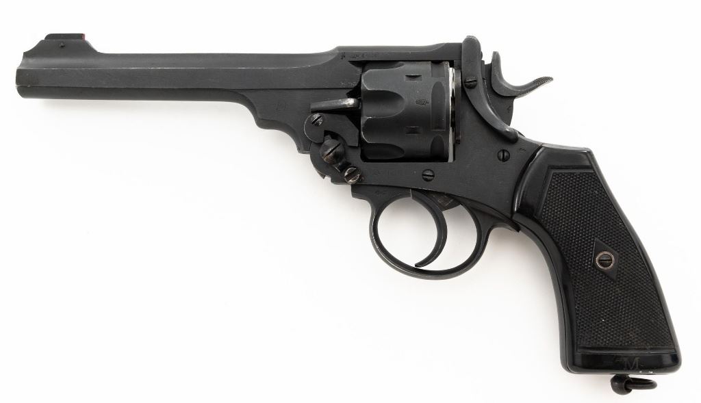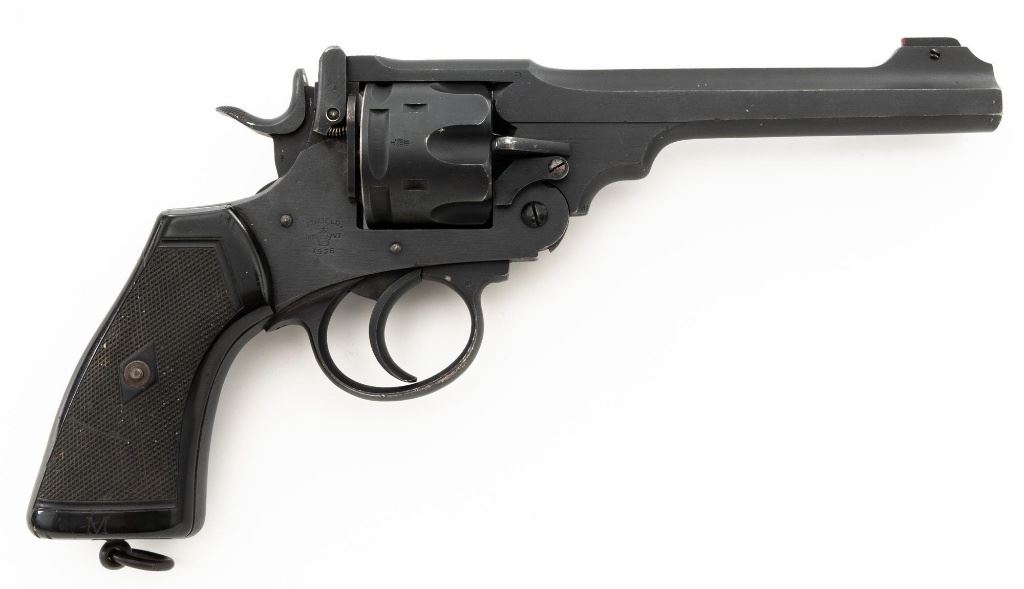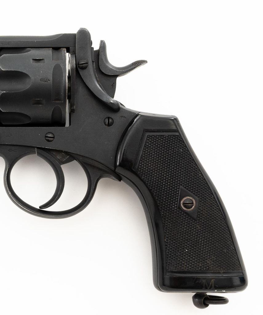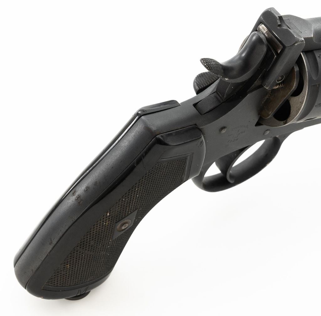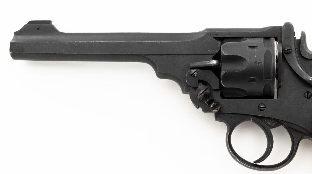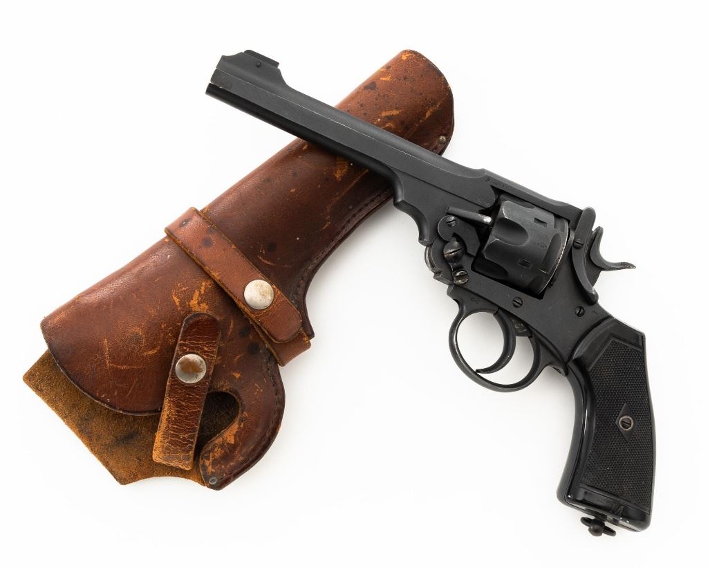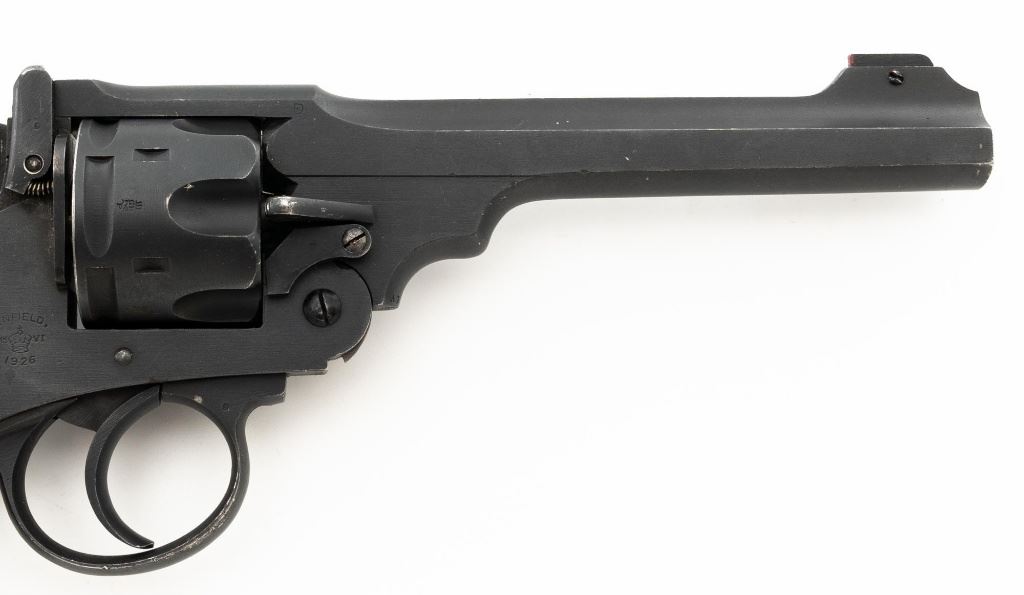 British Mk VI Enfield Double Action Revolver with Holster, #A7683, .45 ACP cal., 6" flat sided barrel, blued finish, black plastic grips marked with "M" on both sides, dovetailed blade front sight with added red paint, fixed rear sight with "U"-notched groove, and a swiveling lanyard ring. The commercial brown leather open top holster is marked "Winfield" on the rear. Holster is in good condition, with scuffs, age cracks, and some darkening to the leather. All stitching and fittings are present. Pistol was importer converted to .45 ACP cal. by machining off the rear of the cylinder. Right side of the frame is marked "ENFIELD/MK(crown)VI/1926". Marked "26(in service)/(firing proof)/(broad arrow)/(Enfield inspection stamp)" on left side of the barrel strap. Pistol was in Australian service and is stamped with "(broad arrow)D" property stamps on left side of the barrel and frame. Rack number "5/131" is stamped on the rear grip strap. Matching numbers on frame and barrel; cylinder does not match. No visible import marks. Condition overall is fine, retaining over 95% reblued finish, with light wear around the muzzle. Grips are fair, showing handling marks and wear to the checkering. action locks up, cycles, and ejects smoothly. Bore is bright with very good rifling. Chambers are clean and bright. Est.: $500-$700. (C&R/PPT)