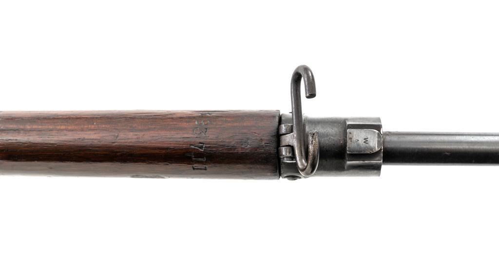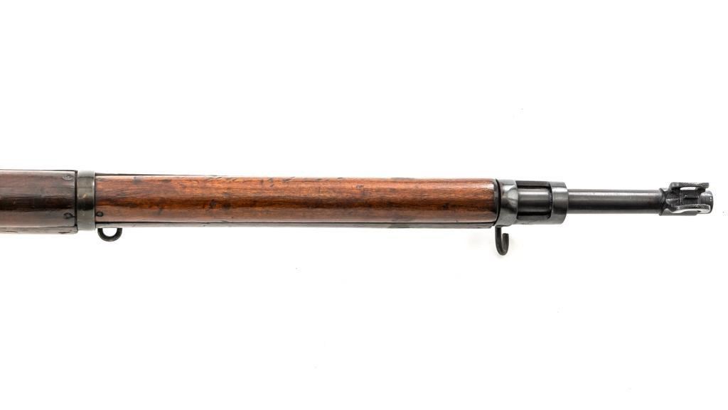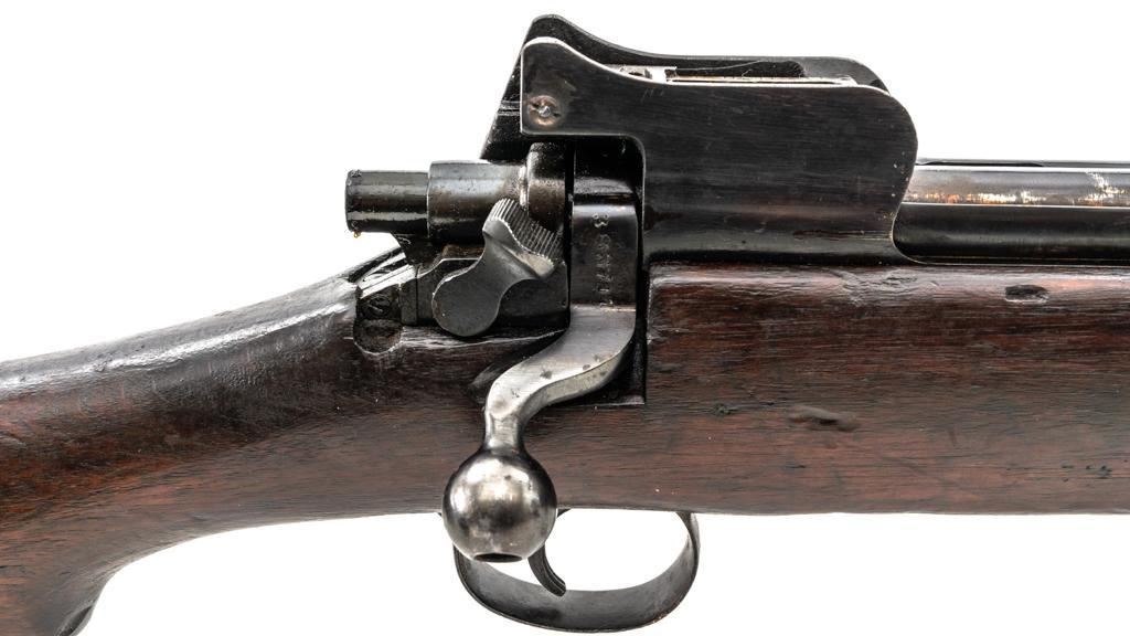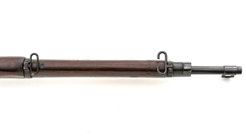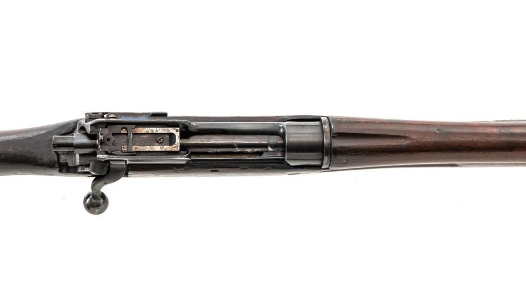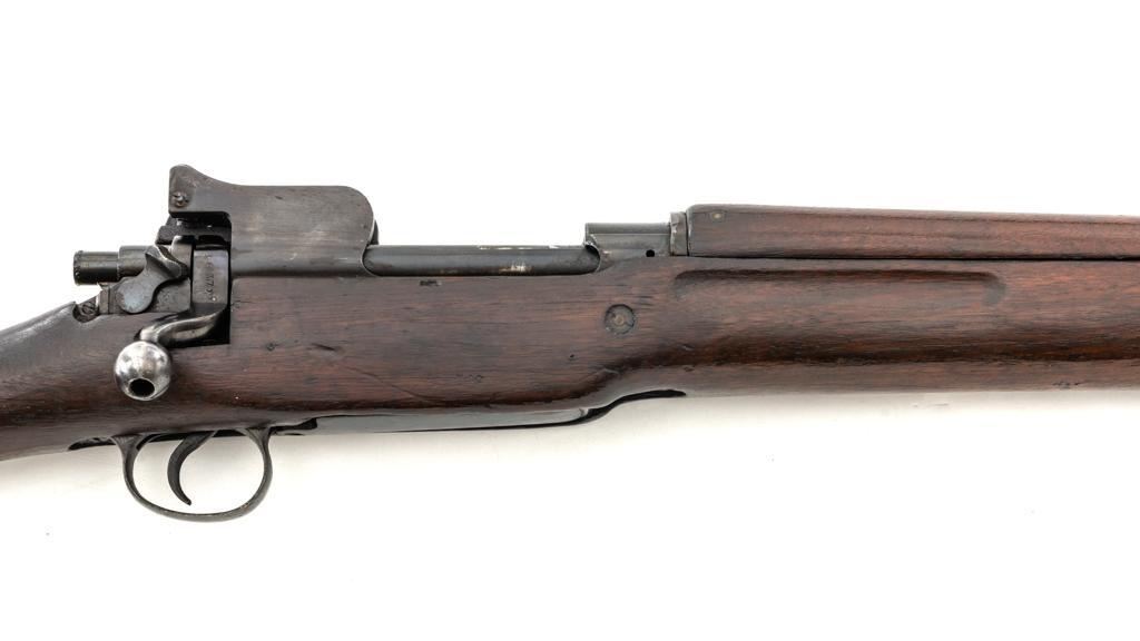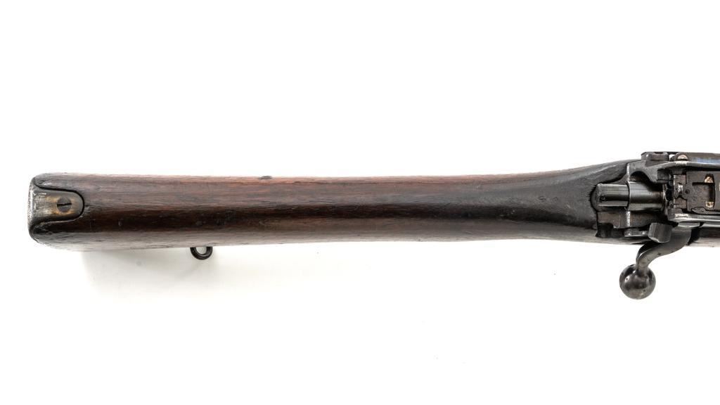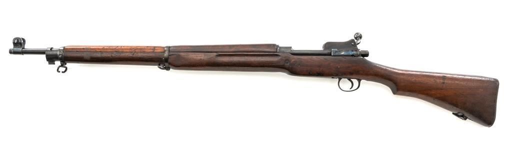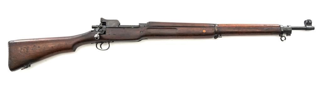 British Pattern 1914 Bolt Action Rifle, #383711, .303 British cal., 26"barrel, blued finish, walnut stock and handguard, dovetailed blade front sight with protectors, and adjustable folding leaf rear sight with aperture and battle sight, graduated to 1650 yards. Rifle was made by the Remington Arms Co. under contract and is very faintly marked "RE" within a circle. There is a very faint roundel stamp on right side of the buttstock that appears to read "IR*", for Mark I Remington with enlarged front bolt lugs. Tip of the forend is stamped with a "2". Matching number stamped on top of the bolt handle. Import stamped "MADE IN U.S.A." on right side of the receiver. Condition overall is very good. Metal has been polished and reblued, now retaining approx. 90%-92% blue, showing operating wear to the bolt body, pitting and patina to the buttplate. Dark wood has been sanded and refinished, now in very good condition, with scattered handling marks and impressions. Long range dial sight and pointer have been removed, with a piece of wood and dowel now spliced in place. Brass marking disc has been removed from right side of the buttstock and a wooden dowel fitted in its place. Action operates smoothly. Bore rates fair to good overall with clear rifling. Est.: $400-$600. (C&R)