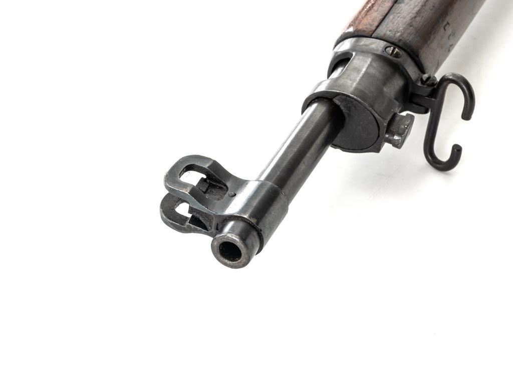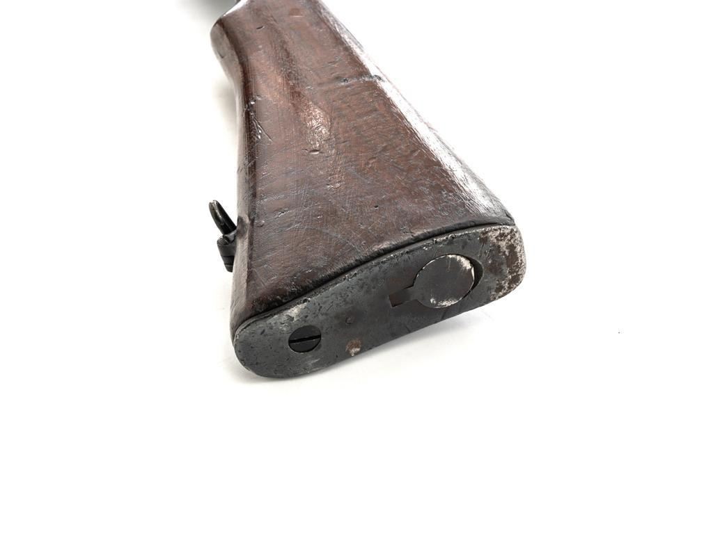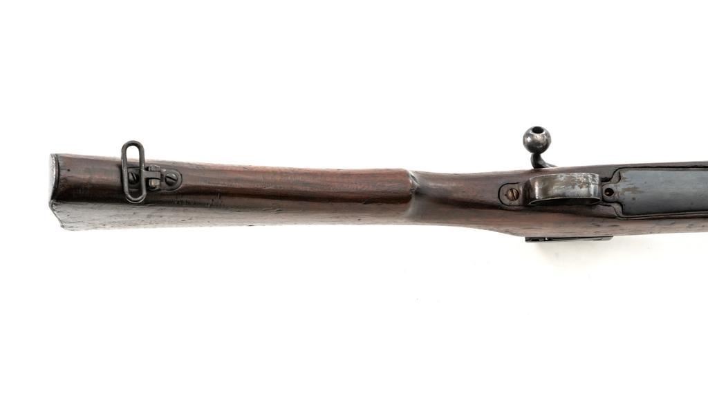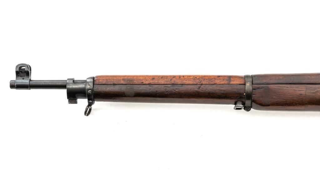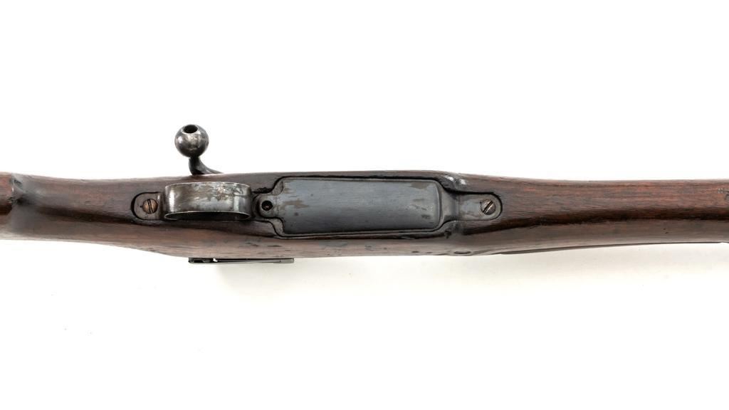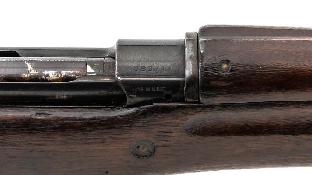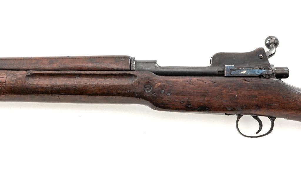 British Pattern 1914 Bolt Action Rifle, #383711, .303 British cal., 26"barrel, blued finish, walnut stock and handguard, dovetailed blade front sight with protectors, and adjustable folding leaf rear sight with aperture and battle sight, graduated to 1650 yards. Rifle was made by the Remington Arms Co. under contract and is very faintly marked "RE" within a circle. There is a very faint roundel stamp on right side of the buttstock that appears to read "IR*", for Mark I Remington with enlarged front bolt lugs. Tip of the forend is stamped with a "2". Matching number stamped on top of the bolt handle. Import stamped "MADE IN U.S.A." on right side of the receiver. Condition overall is very good. Metal has been polished and reblued, now retaining approx. 90%-92% blue, showing operating wear to the bolt body, pitting and patina to the buttplate. Dark wood has been sanded and refinished, now in very good condition, with scattered handling marks and impressions. Long range dial sight and pointer have been removed, with a piece of wood and dowel now spliced in place. Brass marking disc has been removed from right side of the buttstock and a wooden dowel fitted in its place. Action operates smoothly. Bore rates fair to good overall with clear rifling. Est.: $400-$600. (C&R)