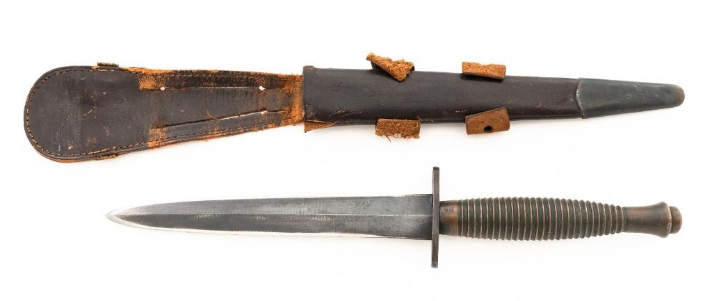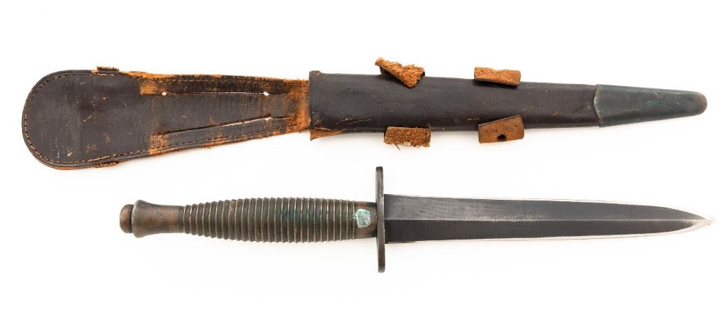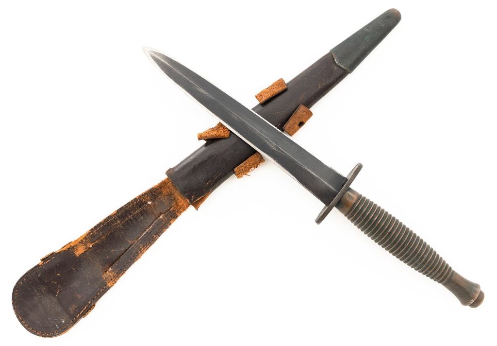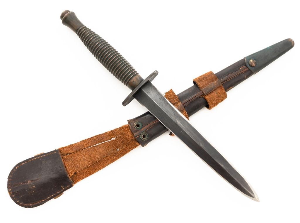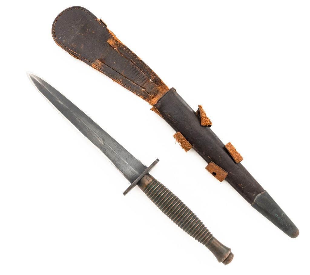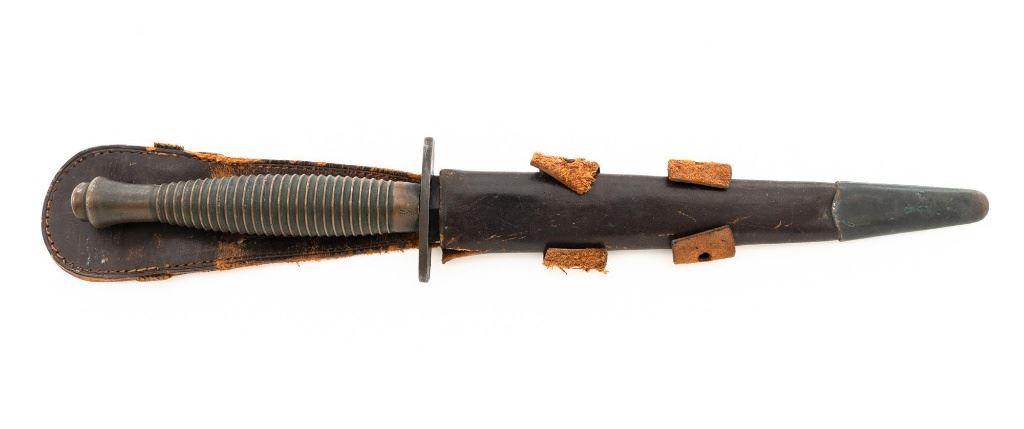 British Third Pattern Fairbairn Sykes Commando Knife with Sheath, 6.5" double edged blued blade, 11.25" overall, oval crossguard, ringed alloy copper plated grip with flat pommel. Marked with a "(Broad Arrow) 13"inspection stamp on the lower grip and with a "2" mold mark on the upper grip. Condition is good, the point and sides of the blade have been honed to a sharp edge. Now showing scratches, toning, and a few small spots of patina. Handle has a worn spot with two small dents behind the crossguard, otherwise good with light wear and toning. The blade and crossguard fit tightly. Brown leather sheath has four securing tabs, copper rivets, and a blackened brass locket. Sheath is fair, showing general age and wear. Elastic strap is missing above the belt slots and the hanger shows wear and finish loss. Torn on the right side and the body has impressions and handling marks. Est.: $200-$300.