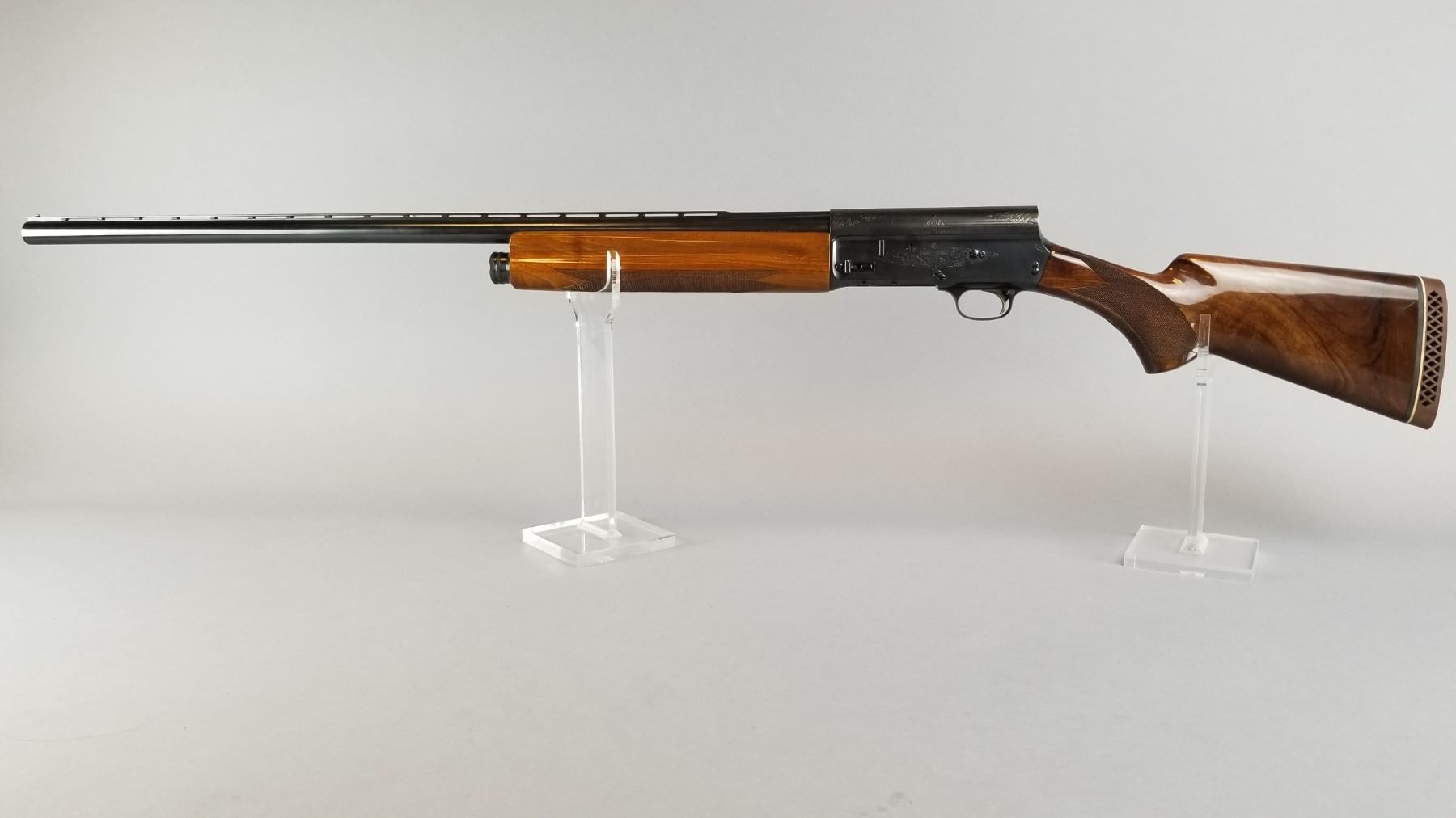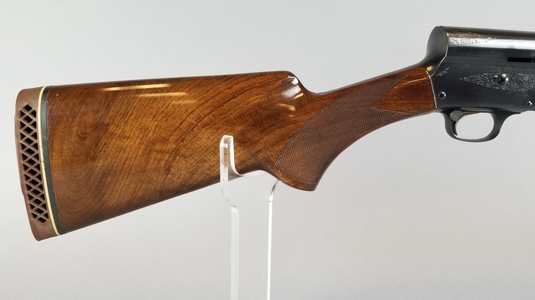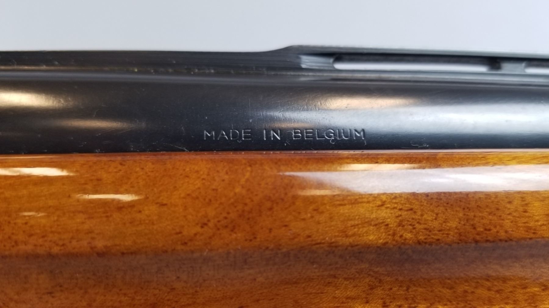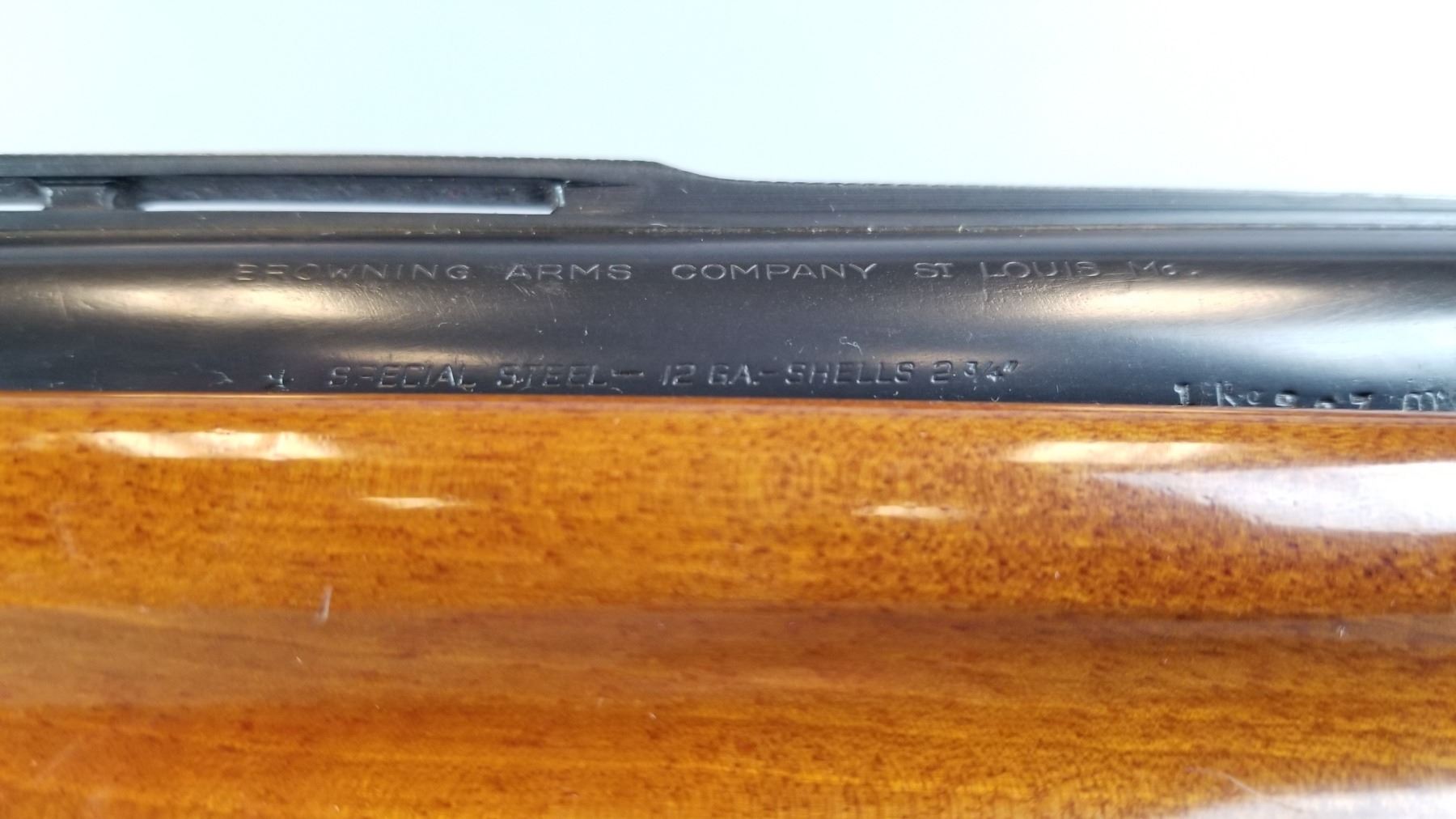 Belgian made A5. Barrel marked as full choke. St. Louis barrel address. Serial number dates the gun to 1956 production. Condition: Numerous minor handling marks and dings throughout the stock and forend. Edge wear on the vent rib. Maker: Browning Model: A5 Caliber/Gauge: 12ga SN: G-12033 Barrel: 29.5" Type: Shotgun NICS Required?: YES