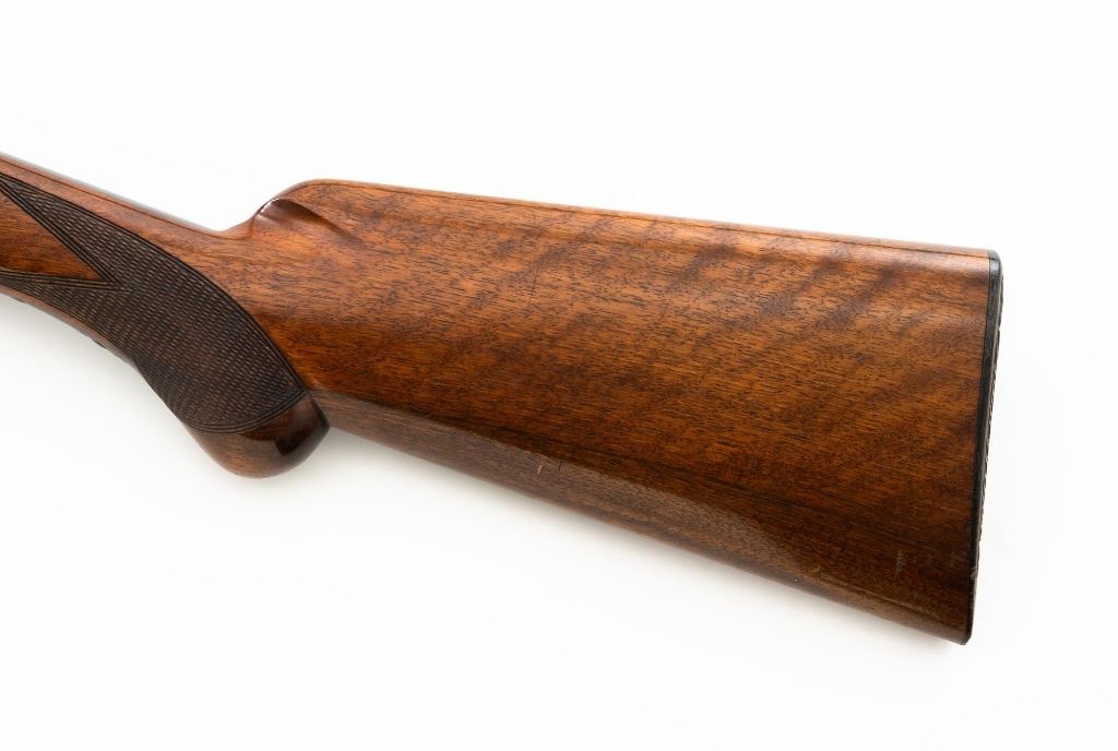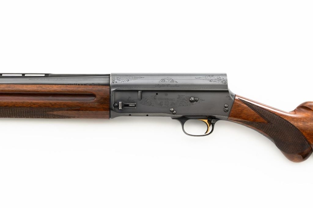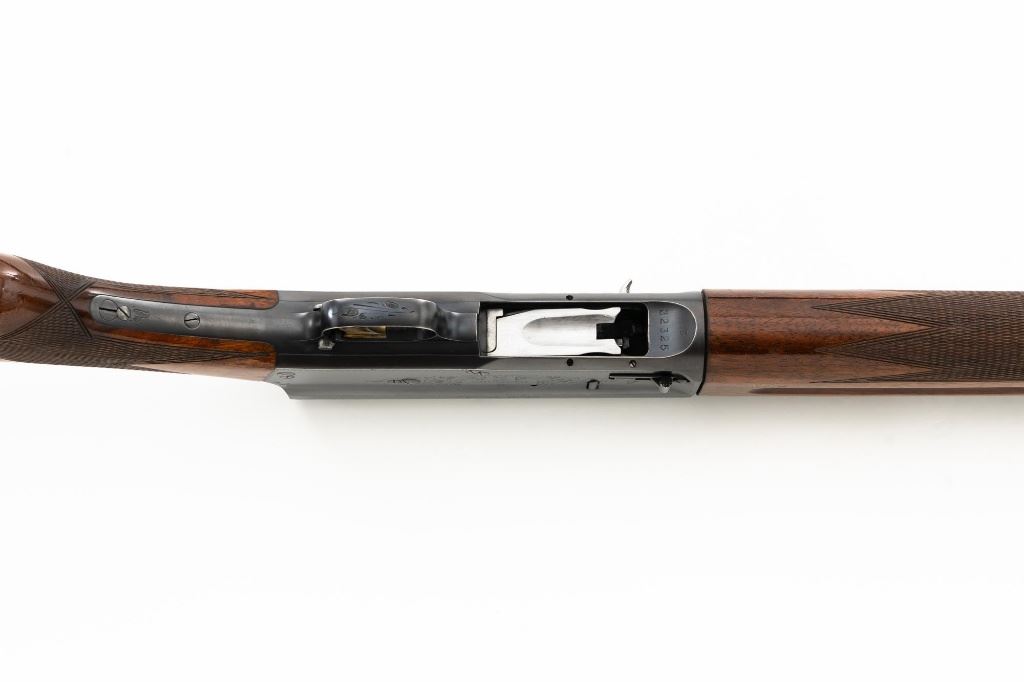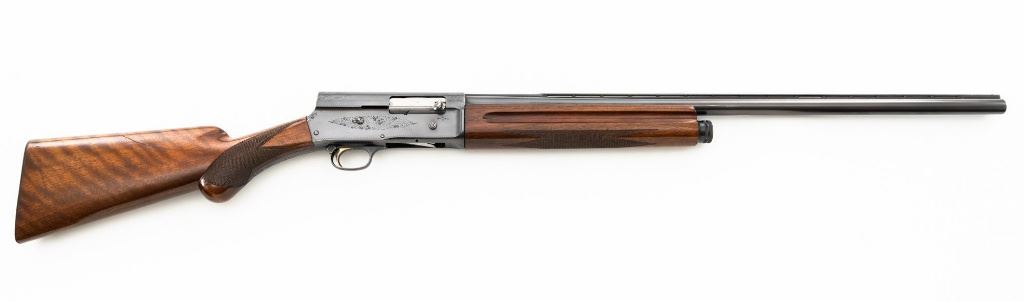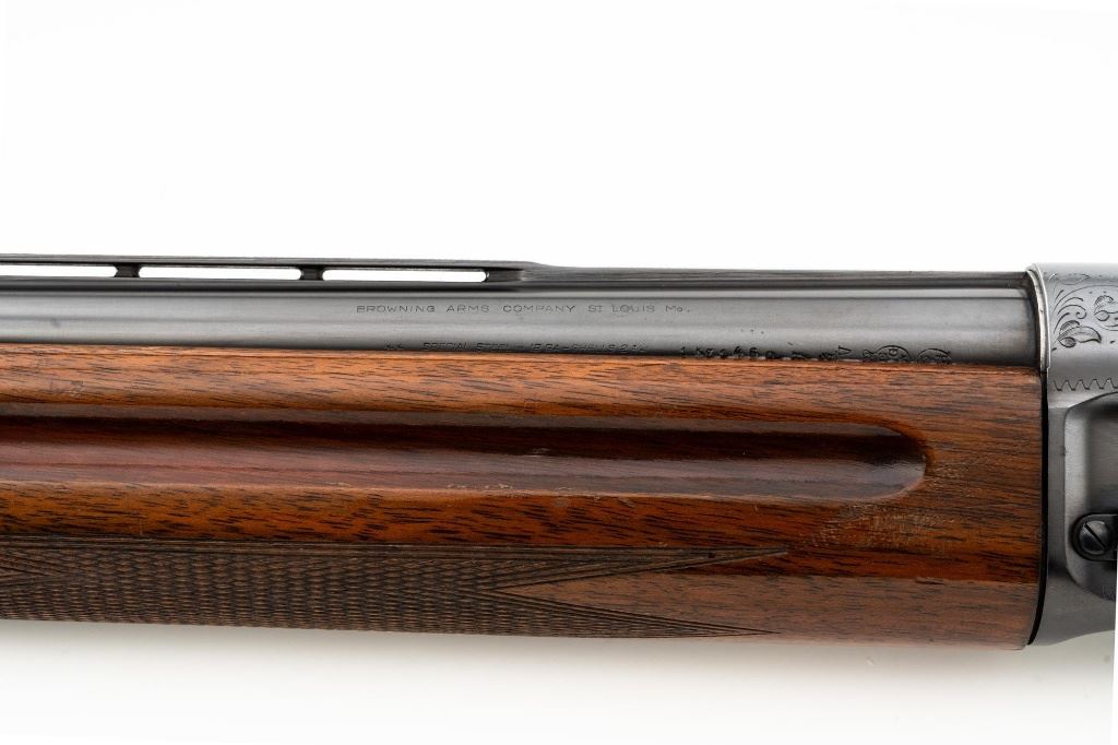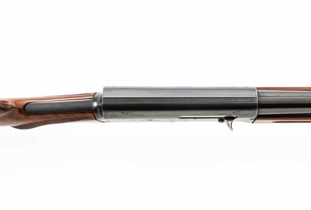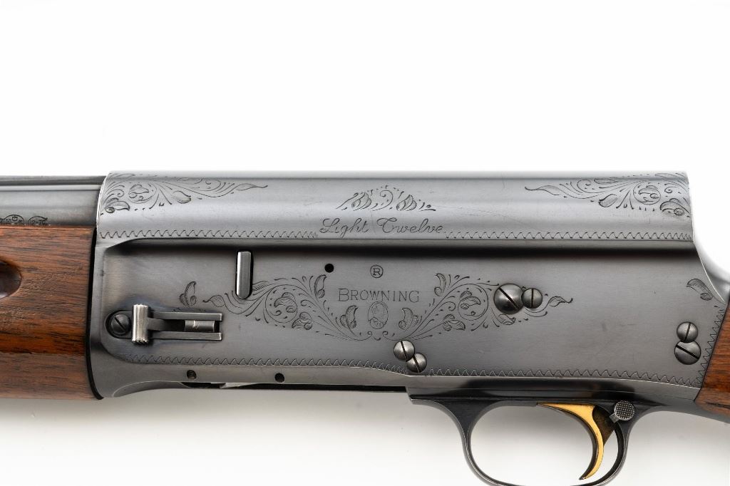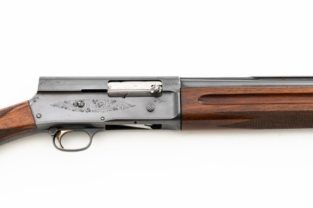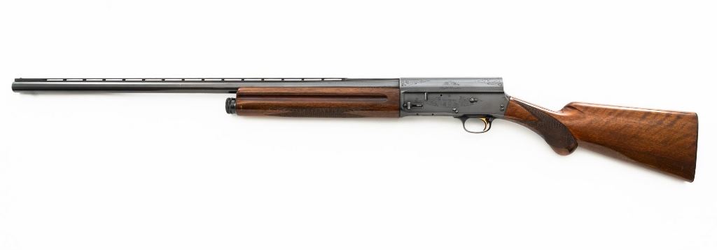 Browning Auto-5 "Light 12" Model Semi-Automatic Shotgun, #8G32325, 12 ga., 27-1/2" vent rib barrel has a 2-3/4" chamber and is choked Mod. The action is the standard version originally improved. Slender, finger-groove forend and round knob long tang (RKLT) pistol grip buttstock are oil-finished "B" grade walnut, with hand checkering at 22 LPI, and an original "FN/Browning Automatic" buttplate. Mfgd in Belgium, in 1958. Condition is very good, with moderate handling marks to wood and nominal wear to the action, which closes very tight and functions correctly; bore is mirror bright. Est.: $700-$900. (C&R)