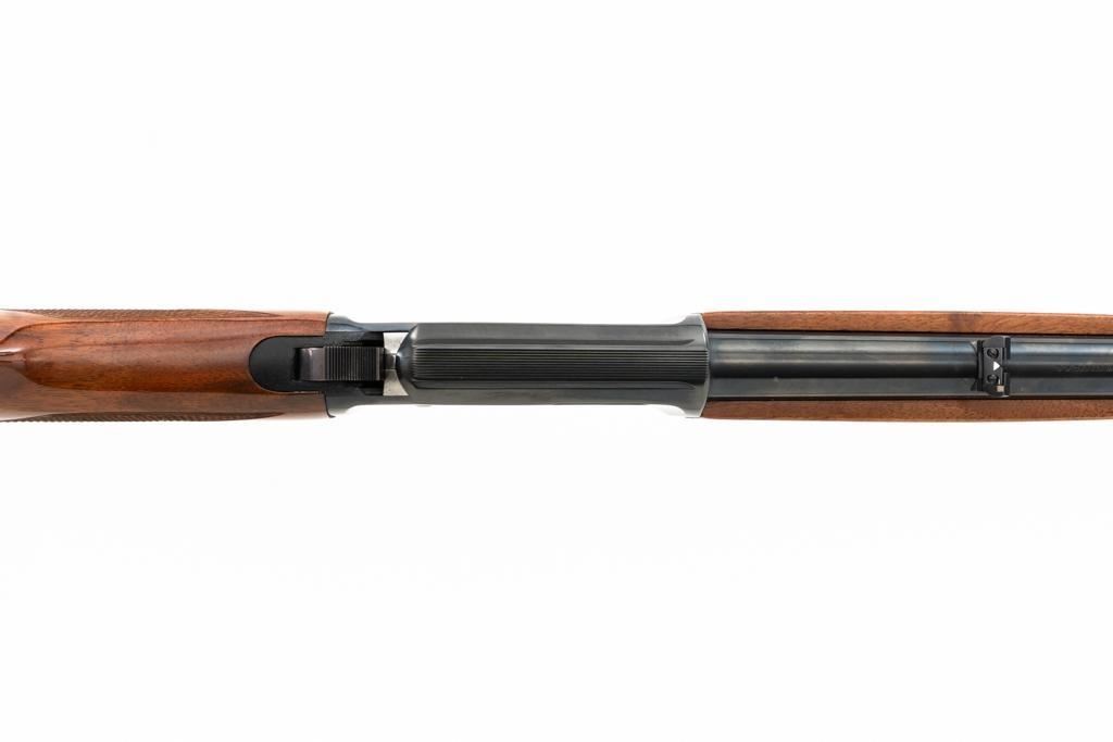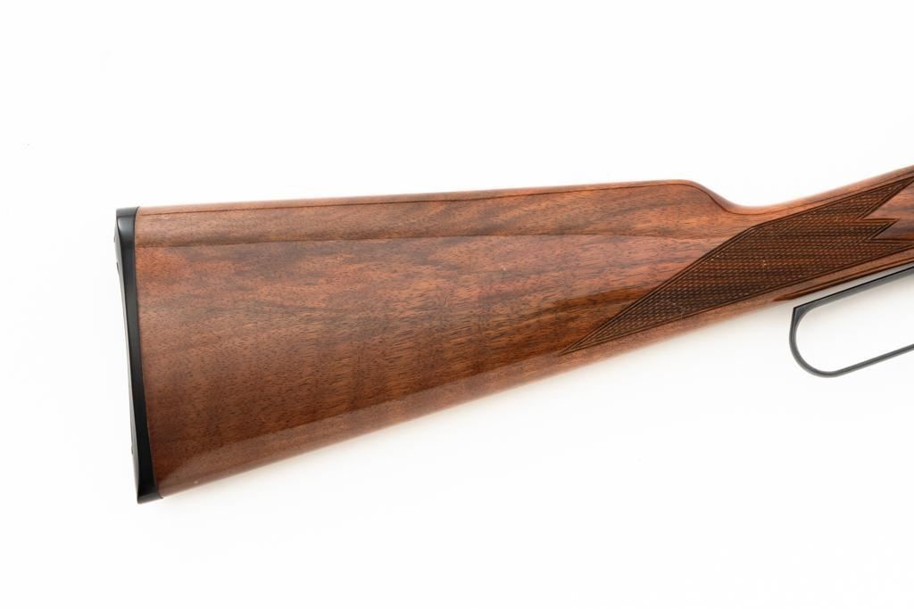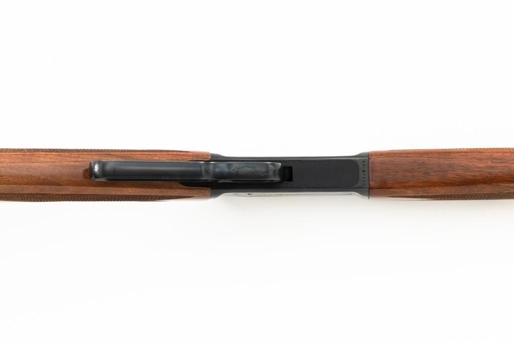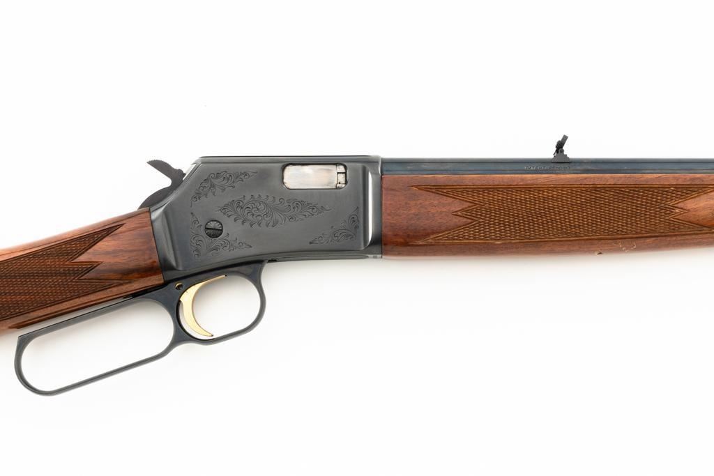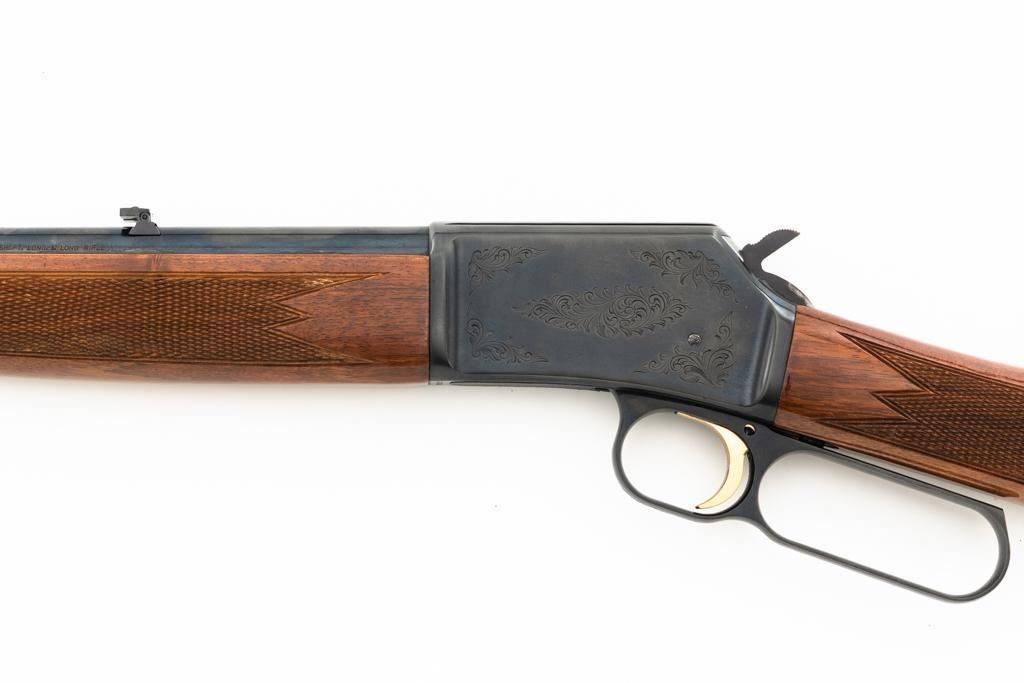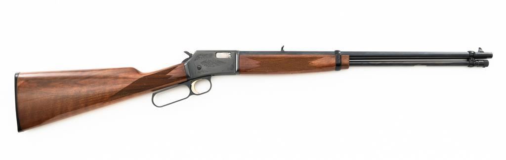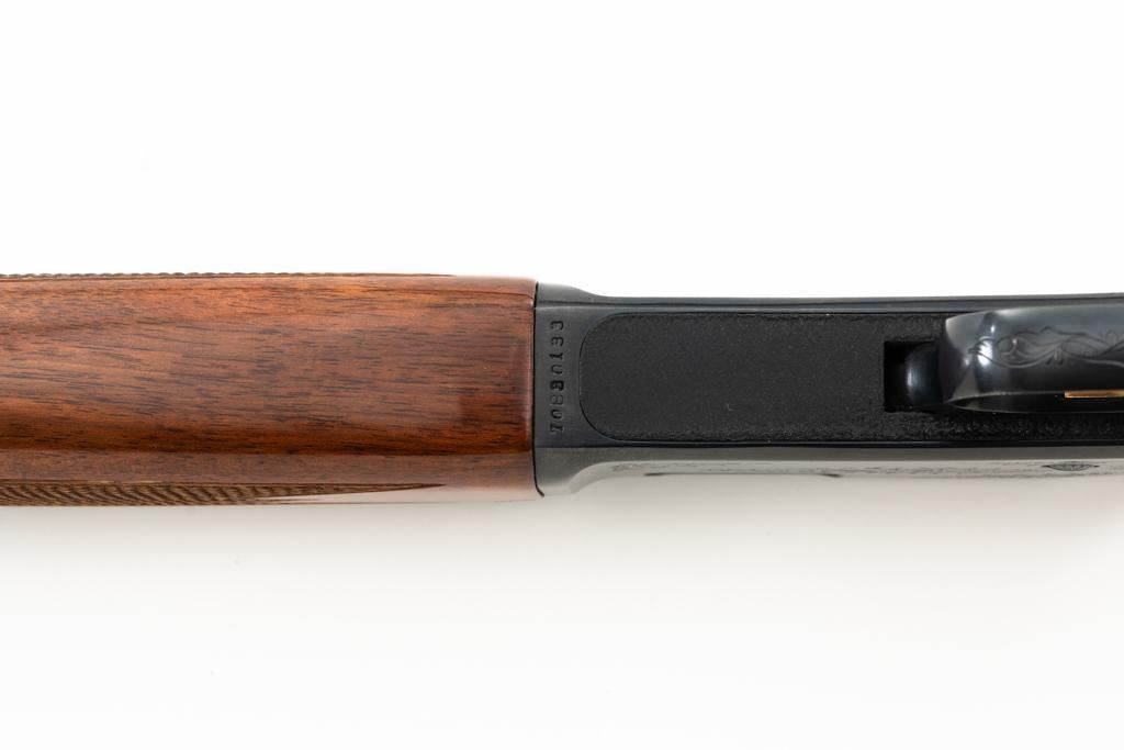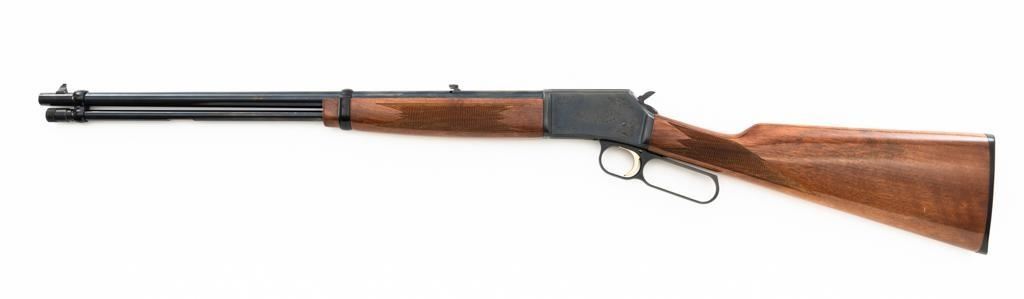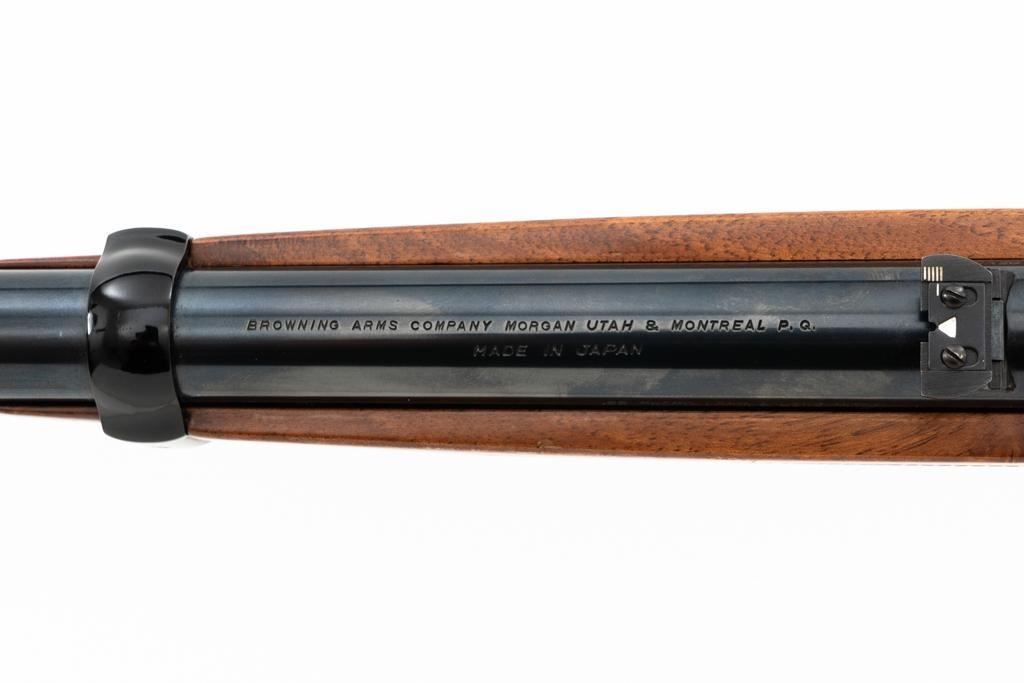 Browning BL-22 Grade II Lever Action Rifle, #70B80133, .22 S-L-LR cal., 20" barrel, blue finish with factory scroll engraving on the receiver, gloss-finished checkered American walnut stock and forend, with dovetailed blade front and folding semi-buckhorn rear sight. Stock ends with a plastic Browning buttplate, providing a 13.5" LOP. Barrel is marked "BROWNING ARMS COMPANY ST LOUIS Mo. & MONTREAL P.Q. / MADE IN JAPAN". Mfgd 1970. Rifle is in excellent overall condition, showing little use, with only light handling marks, retaining approx. 99% factory blue. Stock is in near excellent condition, with light impressions and storage marks. Action is crisp and functions smoothly. Bore is mirror bright with excellent rifling. Est.: $600-$800. (C&R)
