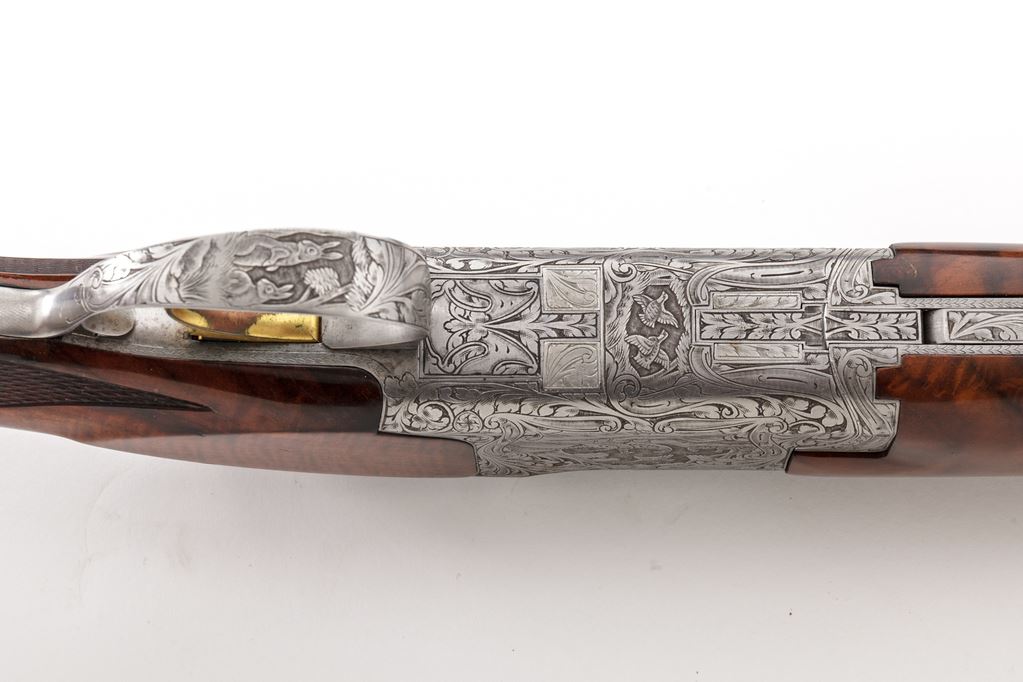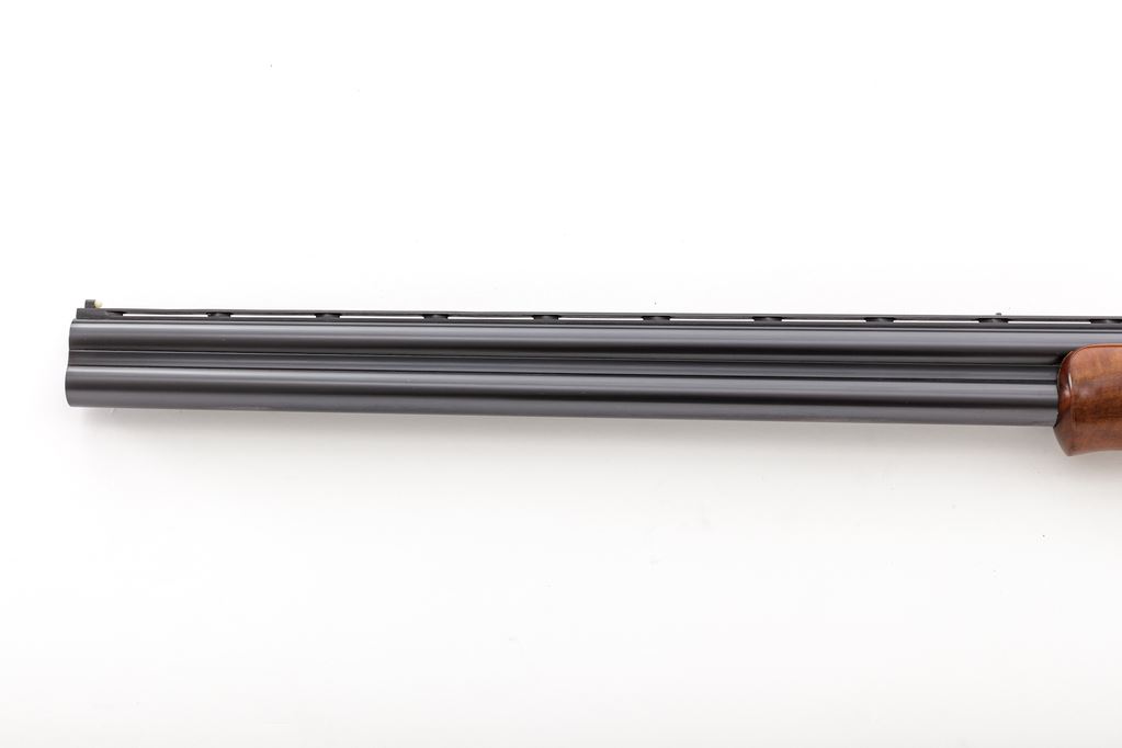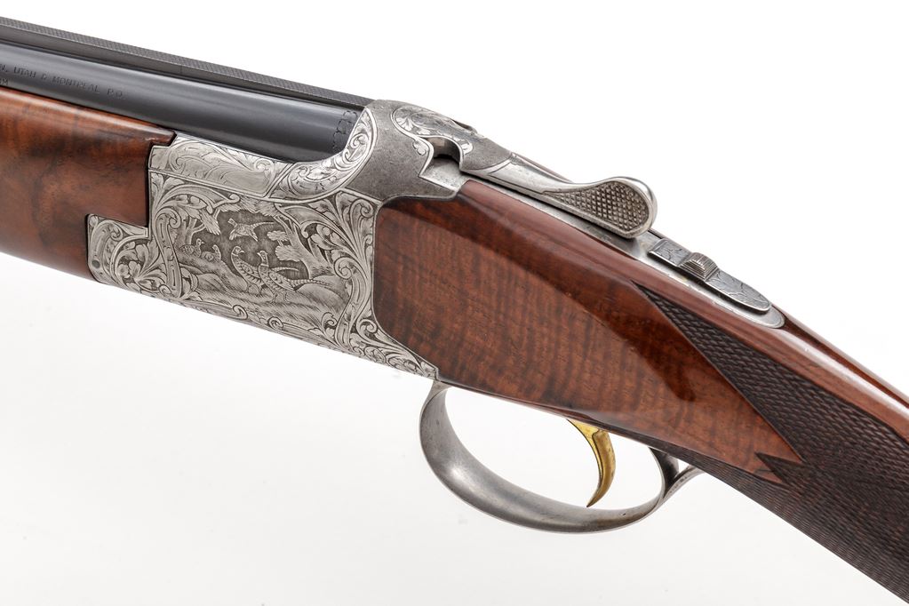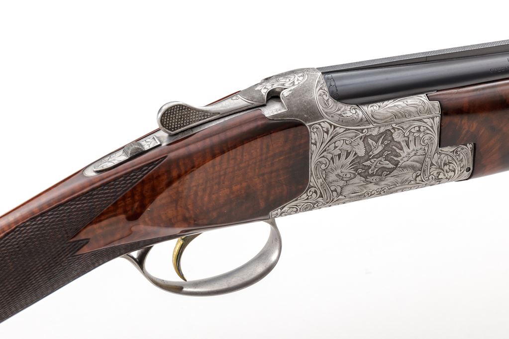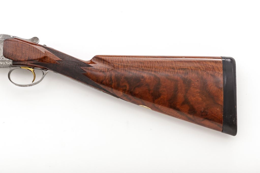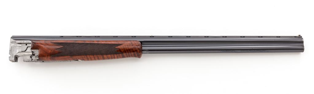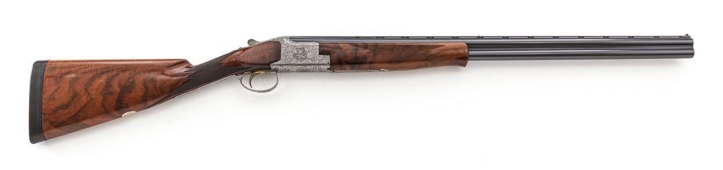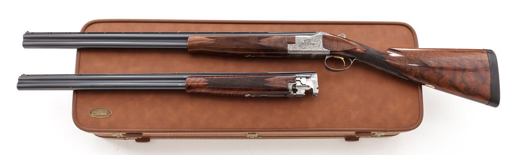 Browning Superposed Diana Grade Superlight 2-Barrel Over/Under Set, #6731V76. Both pairs of barrels are 26-1/2" 20 ga. vent rib with 2-3/4" chambers; the first pair are choked Mod./Full, and the second pair are choked IM./Mod.; both pair are serial numbered to the gun. The Superposed action features a single selective trigger, non-auto safety and auto ejectors. Greyed receiver features game scene engraving of pheasant, duck, rabbit and quail surrounded by floral scenes, done by FN Engraver "M. Bodson". Slender forends and straight-grip buttstock are of very nice European walnut, with extensive checkering and a Pachmayr Old English pad fitted. The gun and both barrels are contained in a Browning hard case. Mfg'd 1976. LOP 14-1/16"; drop at comb 1-3/8"; drop at heel 1-11/16". Condition is very good to near excellent, with numerous small handling marks to wood and some wear to the action, which still locks tight and functions correctly. The second barrel set has two small dents on the top rib. The first dent is on the 5th section from the front and the second dent is on the 2nd section from the rear. This barrel set also has numerous scratches and bluing wear, mainly present on the left side of the barrels. Est.: $7,000-$8,500. (Modern)(Don Koll collection)