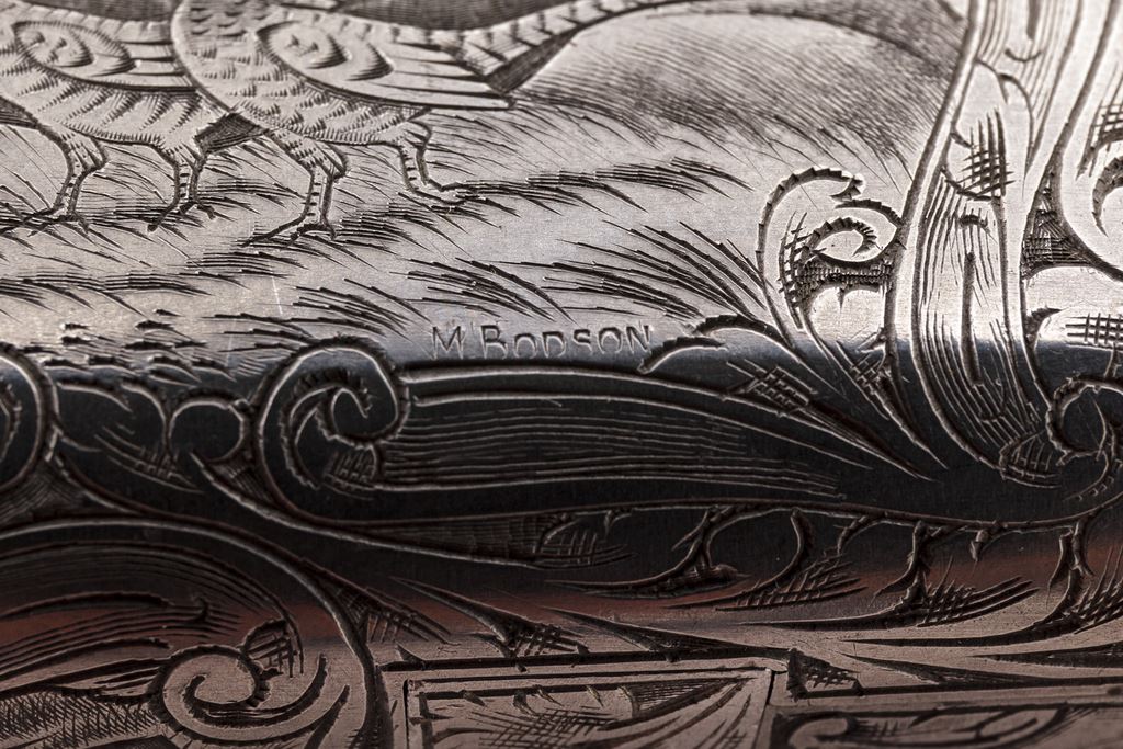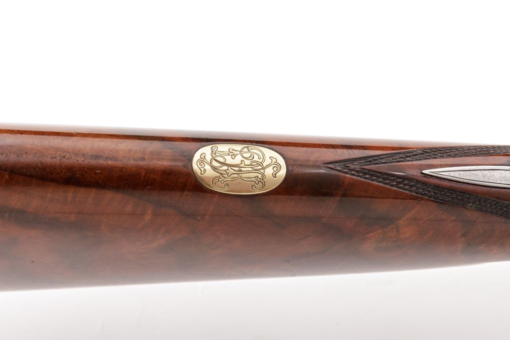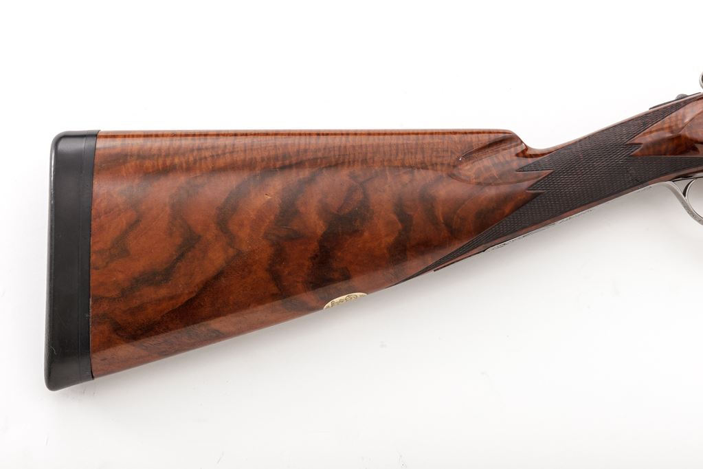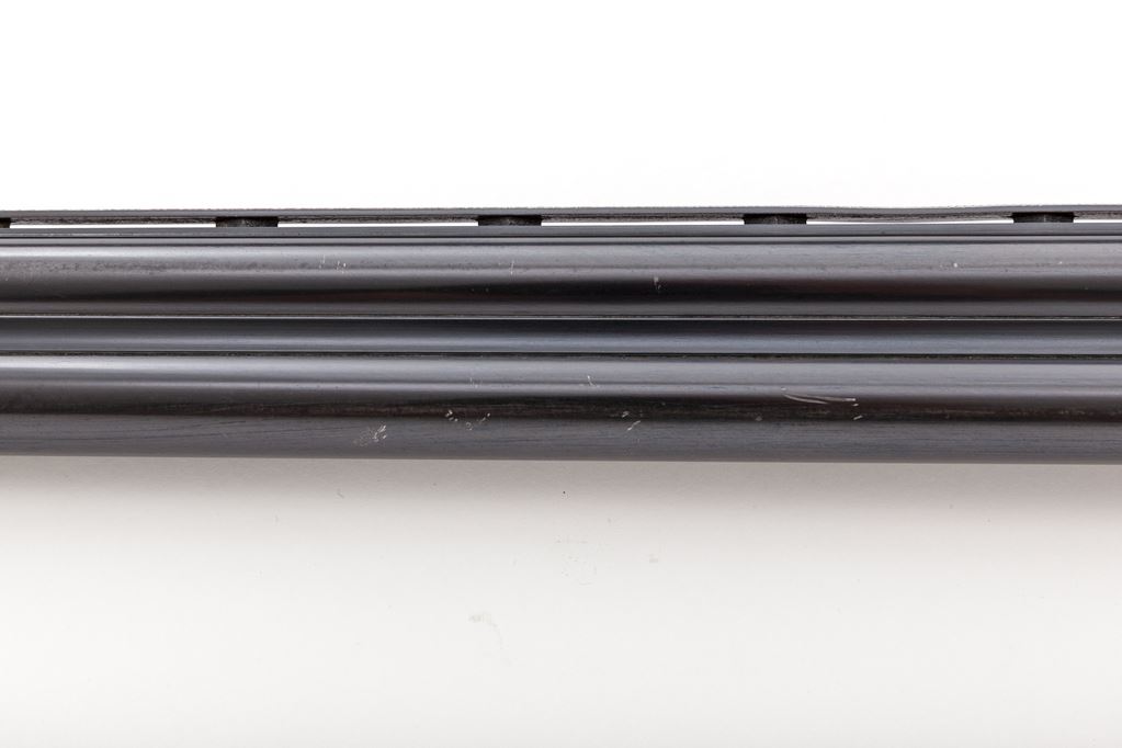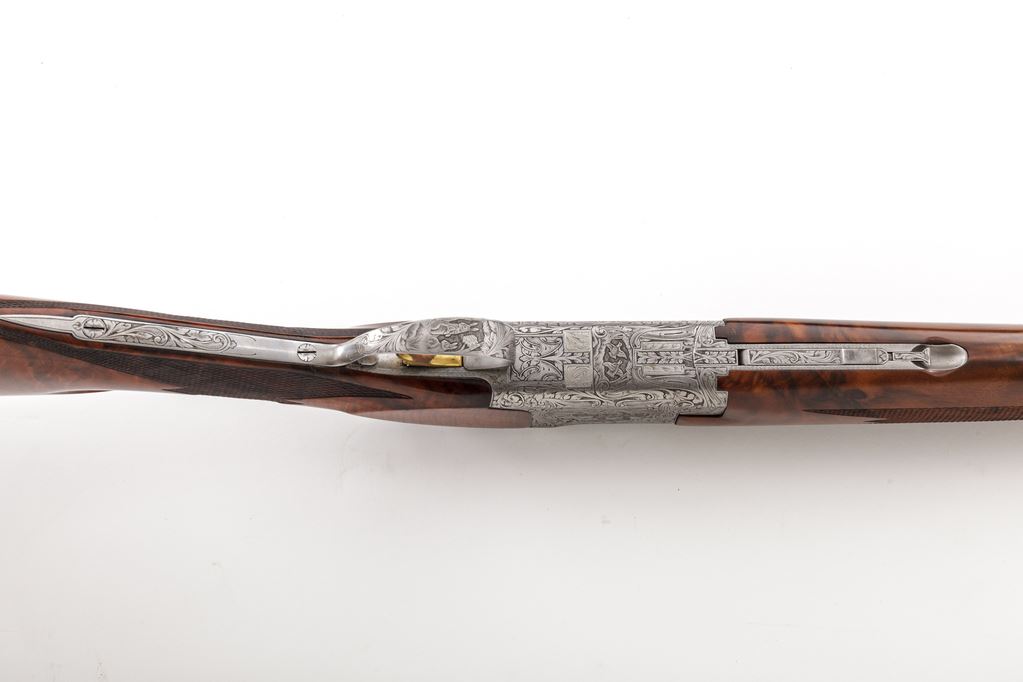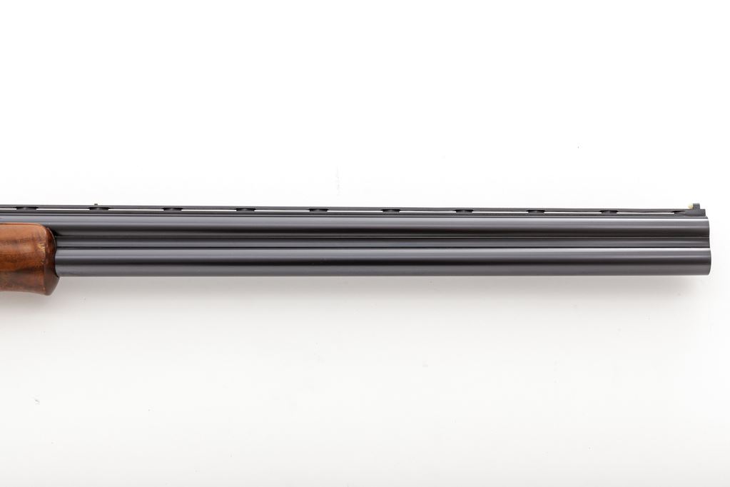 Browning Superposed Diana Grade Superlight 2-Barrel Over/Under Set, #6731V76. Both pairs of barrels are 26-1/2" 20 ga. vent rib with 2-3/4" chambers; the first pair are choked Mod./Full, and the second pair are choked IM./Mod.; both pair are serial numbered to the gun. The Superposed action features a single selective trigger, non-auto safety and auto ejectors. Greyed receiver features game scene engraving of pheasant, duck, rabbit and quail surrounded by floral scenes, done by FN Engraver "M. Bodson". Slender forends and straight-grip buttstock are of very nice European walnut, with extensive checkering and a Pachmayr Old English pad fitted. The gun and both barrels are contained in a Browning hard case. Mfg'd 1976. LOP 14-1/16"; drop at comb 1-3/8"; drop at heel 1-11/16". Condition is very good to near excellent, with numerous small handling marks to wood and some wear to the action, which still locks tight and functions correctly. The second barrel set has two small dents on the top rib. The first dent is on the 5th section from the front and the second dent is on the 2nd section from the rear. This barrel set also has numerous scratches and bluing wear, mainly present on the left side of the barrels. Est.: $7,000-$8,500. (Modern)(Don Koll collection)