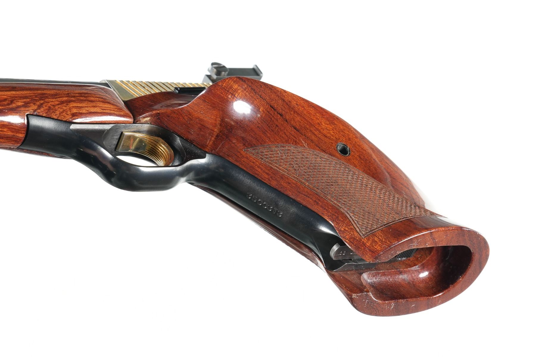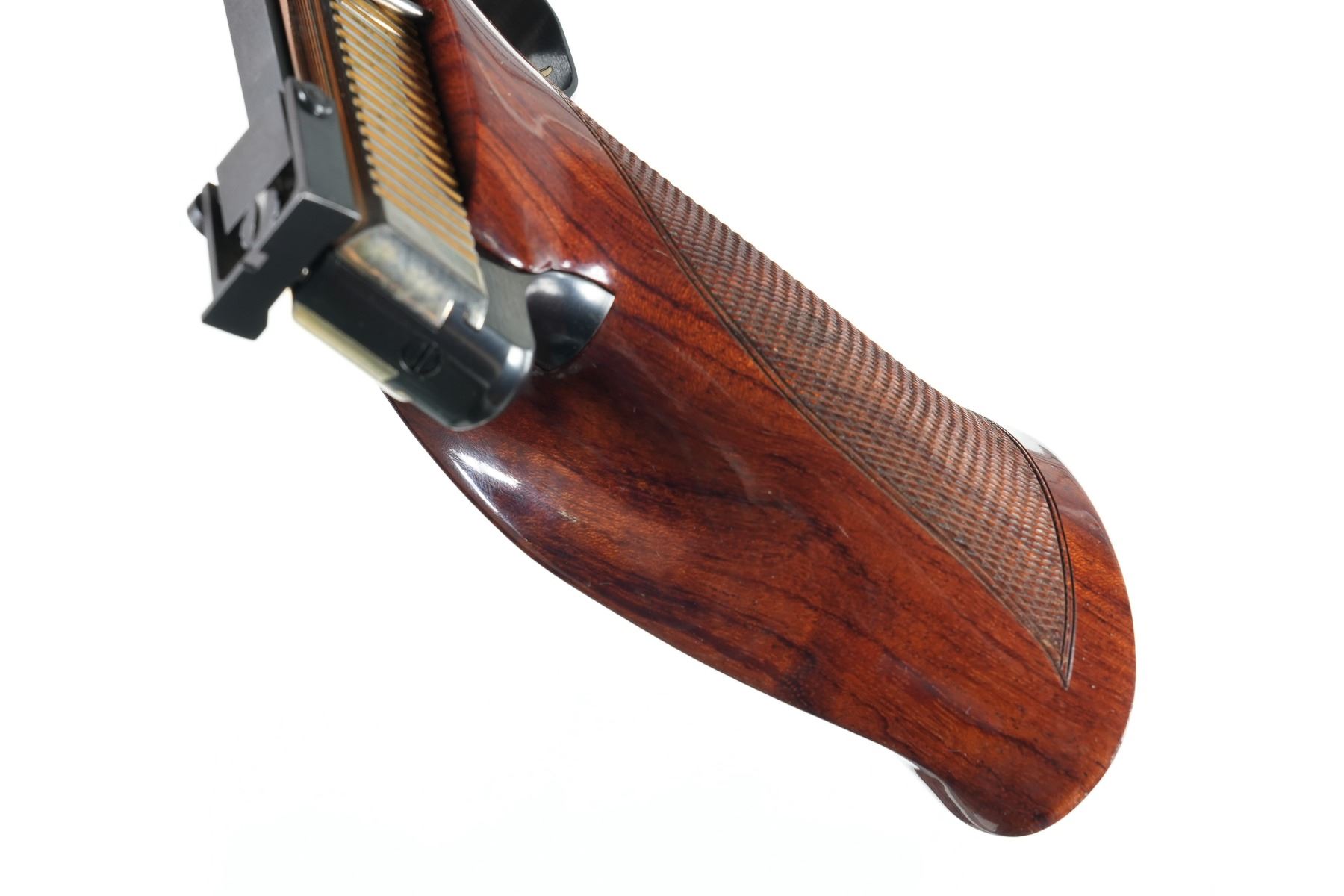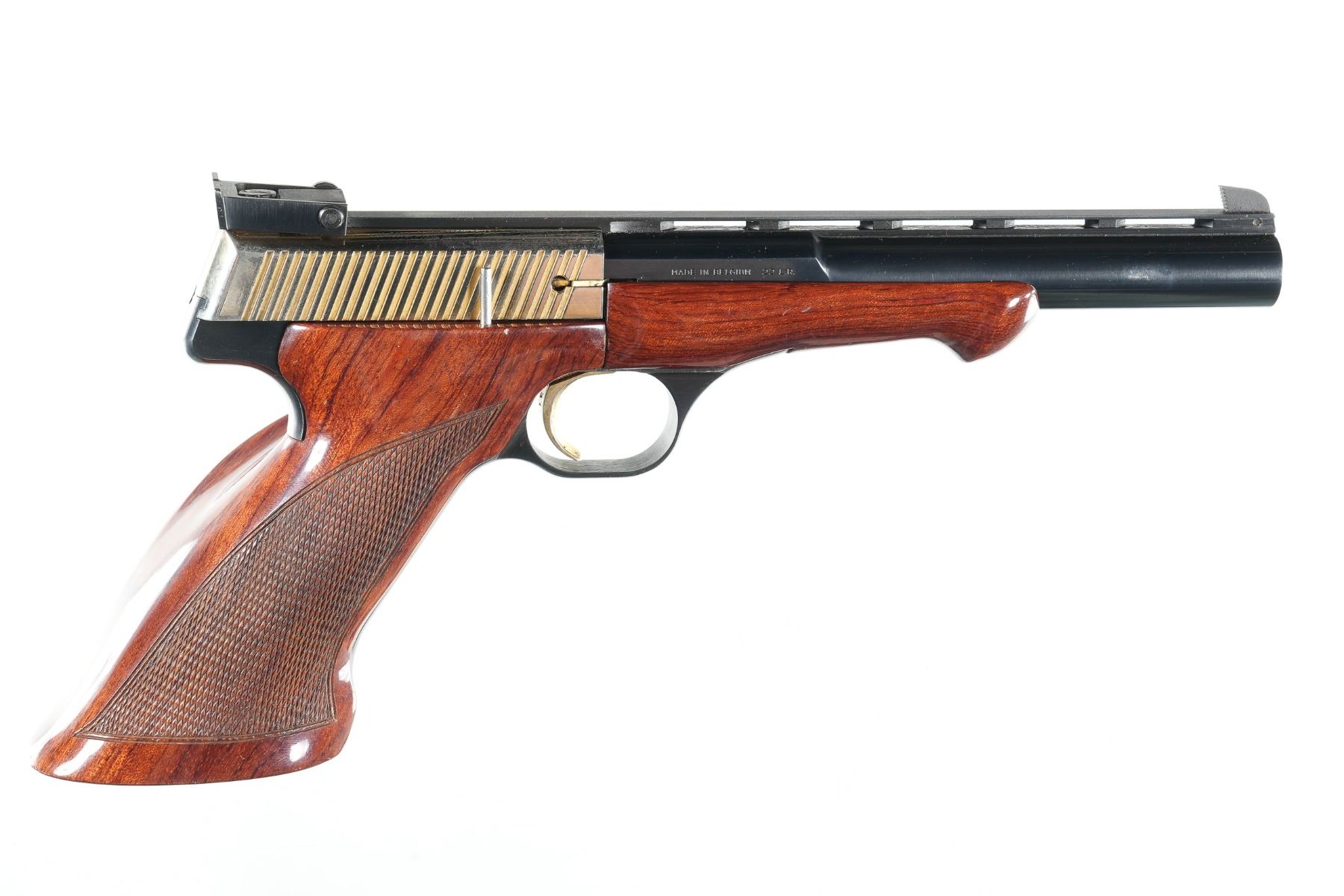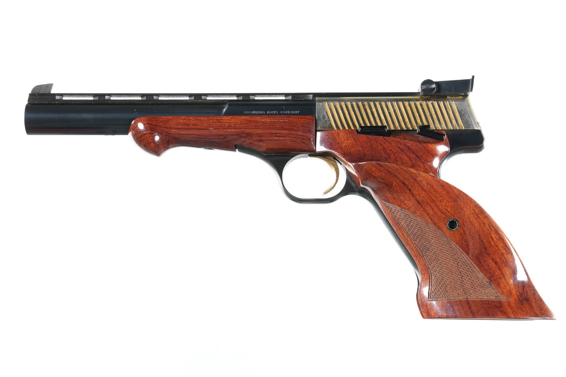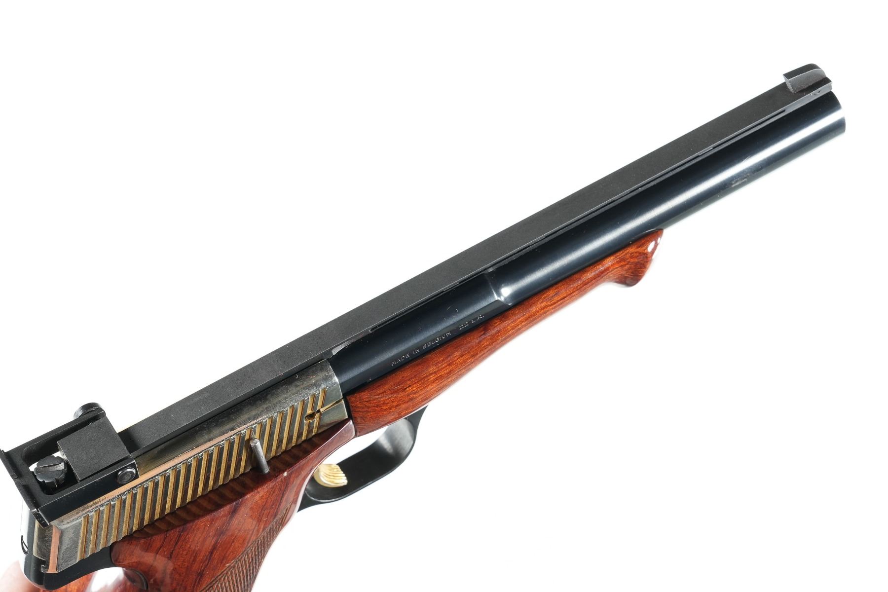 .22 lr Serial # 35003T3 Manufactured in 1963. Includes case, two barrel weights, weight adapter and cartridge block. Condition Very fine with custom gold embellished slide assembly and some light wear at thumb rest. Mechanically excellent Barrel 6 3/4" C&R