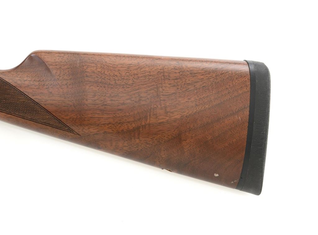 Browning Model 1885 High Wall Single Shot Falling Block Rifle, #05115NP371, .45-70 cal., 28" octagon barrel, with blue finish. Checkered English walnut two-piece straight grip stock with Schnabel forend, sling swivel stud, ending with a solid black rubber Decelerator recoil pad, providing a 13.25" LOP. Rifle features a globe style front sight with insert, rear sight has been removed and filled with a dovetailed blank. Additionally, there are two sight block holes on the barrel that are filled with plug screws. Receiver is drilled and tapped. Vernier style adjustable sight is located on the tang. Factory markings are clear, with "MADE IN JAPAN" on right side of the barrel. Mfgd 1998. Rifle is in near excellent overall condition, with intermittent marks and a few scratches consistent with field use. Stock is also in near excellent condition, with small marks on the forend, buttstock is missing the sling swivel stud, and there are a few light dents at the toe. Action is crisp, locking up securely. Bore is near excellent with well-defined rifling. Est.: $1,000-$1,500. (Modern)