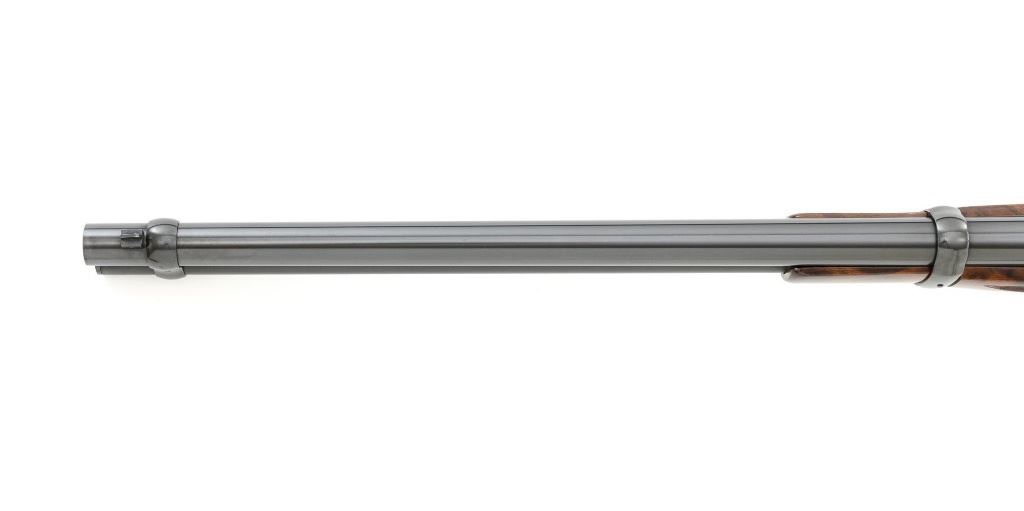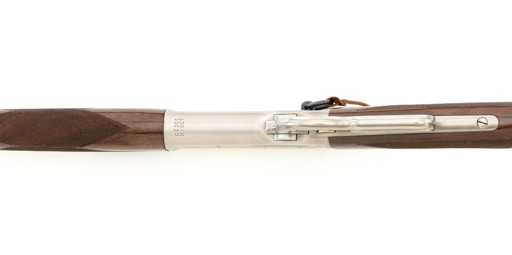 Browning Model 1886 Limited Edition High Grade Lever Action Saddle Ring Carbine, #02301NY6C7, .45-70 cal., 22" round barrel, blue finish on the barrel and magazine, and engraved French gray receiver. Receiver is finely engraved with games scenes on both sides. Left side depicts a couple of gold inlaid Mule Deer in the wild. Right side with gold inlaid Grizzly Bears. Lower left side is signed by the engraver "T. MOR". Gloss-finished, finely checkered, deluxe walnut straight grip stock and forend, ending with a smooth blue steel crescent buttplate, providing a 13.4" LOP. Carbine also features a pinned blade front sight, ladder rear sight, gold colored trigger, and blue steel saddle ring with leather thong. Factory markings are clear, with "MADE IN JAPAN" on the left side of the barrel, and "1 of 3000" on top of the barrel. Tang is marked "BROWNING MODEL 1886". Mfgd for only two years, 1992-93. Carbine is in excellent overall condition, retaining approx. 99%+ factory finish, with light handling marks only. Stock is in excellent condition with only minor storage marks. Action is crisp. Bore is mirror bright with excellent rifling, and appears to be unfired. Est.: $2,000-$3,000. (Modern)