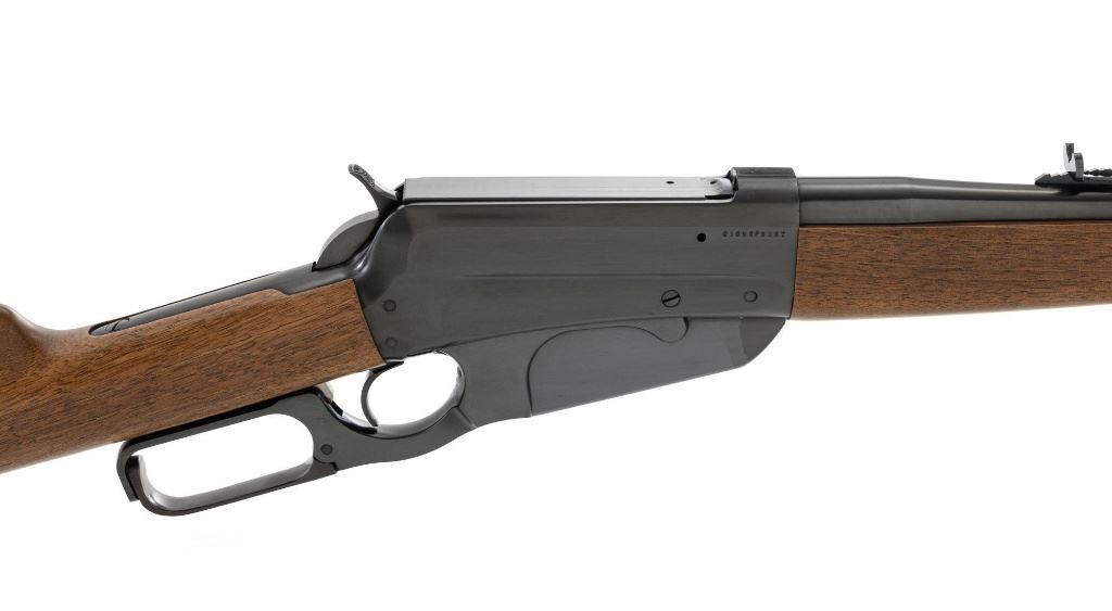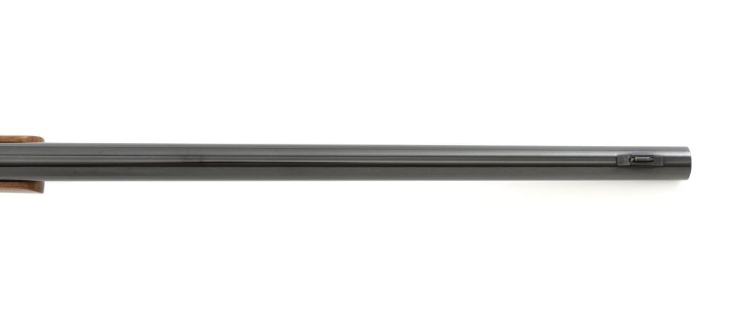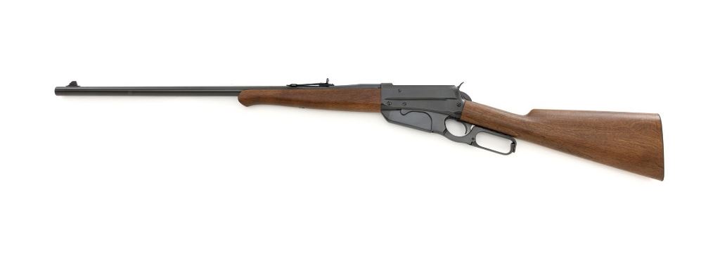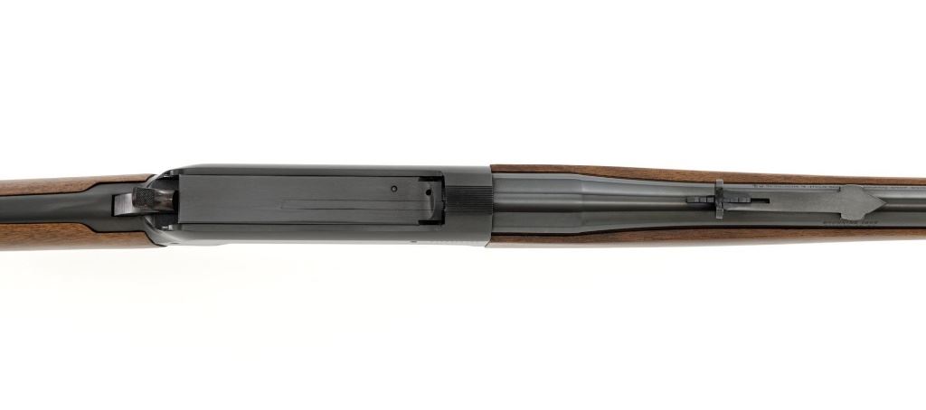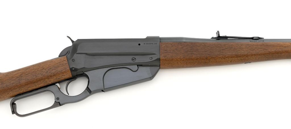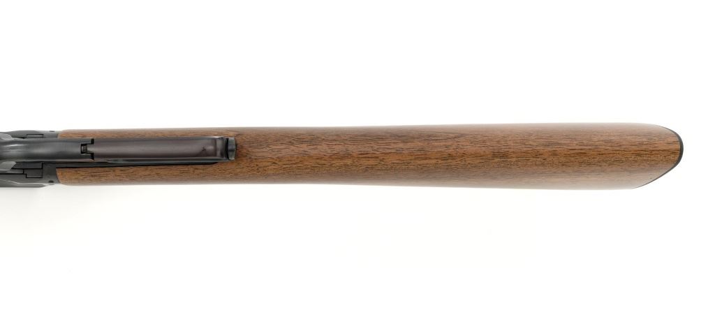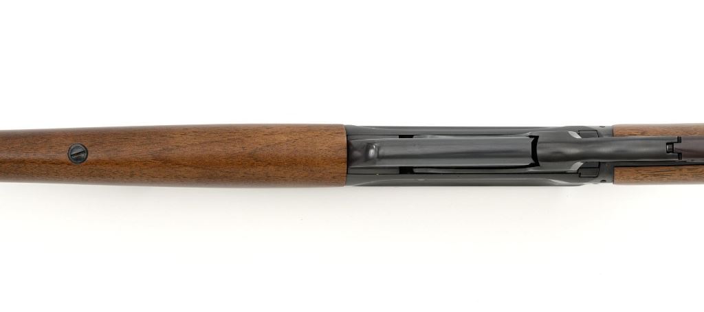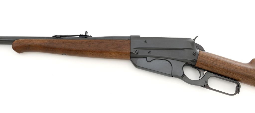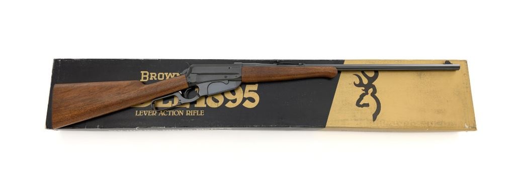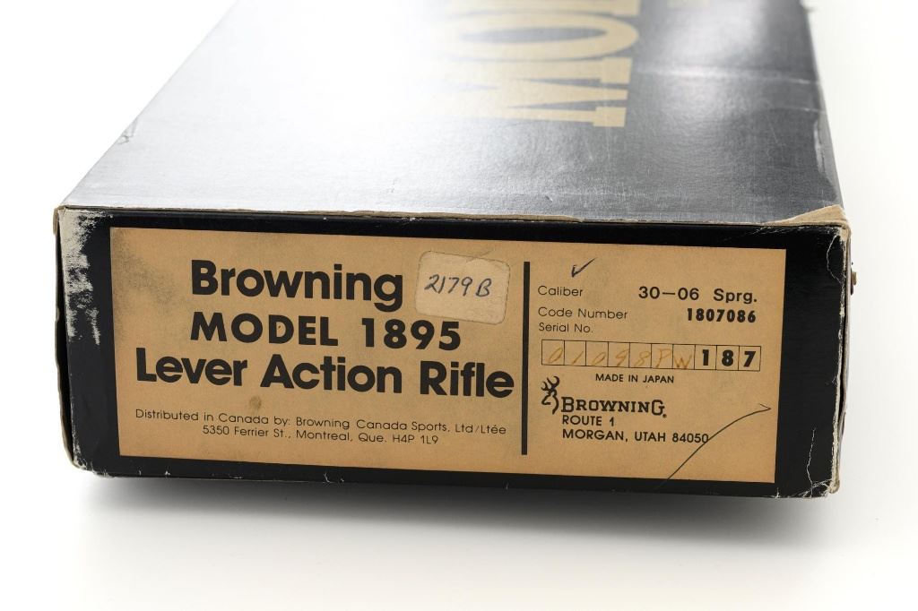 Browning Model 1895 Limited Edition Grade I Lever Action Rifle, #01098PW187, .30-06 cal., 24" barrel, with blue finish. Smooth walnut straight grip stock and Schnabel forend; buttstock ends with a matte blue steel shotgun buttplate, providing a 13.4" LOP. Sights include a brass tipped blade front and buckhorn rear. Marked "MADE IN JAPAN" on left side of the barrel. Includes factory cardboard box with matching end label, Browning brochure, and associated packaging materials. Rifle is in excellent overall condition, retaining approx. 99% factory finish, with intermittent light handling to the wood and metal. Action is crisp. Bore is mirror bright with excellent rifling, showing little use. Mfgd in only 1984, production on the Grade I was limited to 6,000 rifles in .30-06, with another 2,000 produced in .30-40 Krag. These rifles are long out of production and desirable in this high condition. Est.: $1,000-$1,500. (Modern)