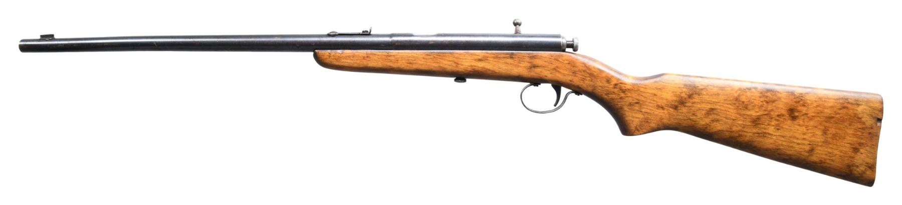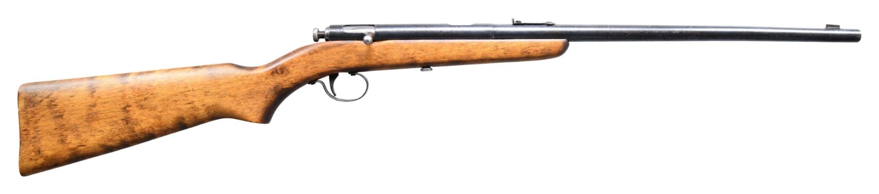 RIFLE. Cal. 22 S & L. NSN. Bbl. 16". No. 47 single shot bolt action rifle mfg. by C.J. Hamilton & Son. Top of the receiver exhibits markings stipulating Hamilton's mfg. and patent information, as well as the model and cal. designations. Metal components exhibit a blue finish overall, save for on the bolt, which is polished in-the-white. 1-piece plain wood pistol grip buttstock. Fixed blade front sight, with V-notch rear sight. CONDITION: metal components retain large amounts of their original factory finish, exhibiting light to mild wear, scattered superficial handling marks, and light surface oxidation overall. Bright bore, retaining strong rifling throughout. Stock shows scattered marks and minor impressions from handling and storage, with a chip present on the left side of the butt. (25-2035/MLW). CURIO. $75-150.