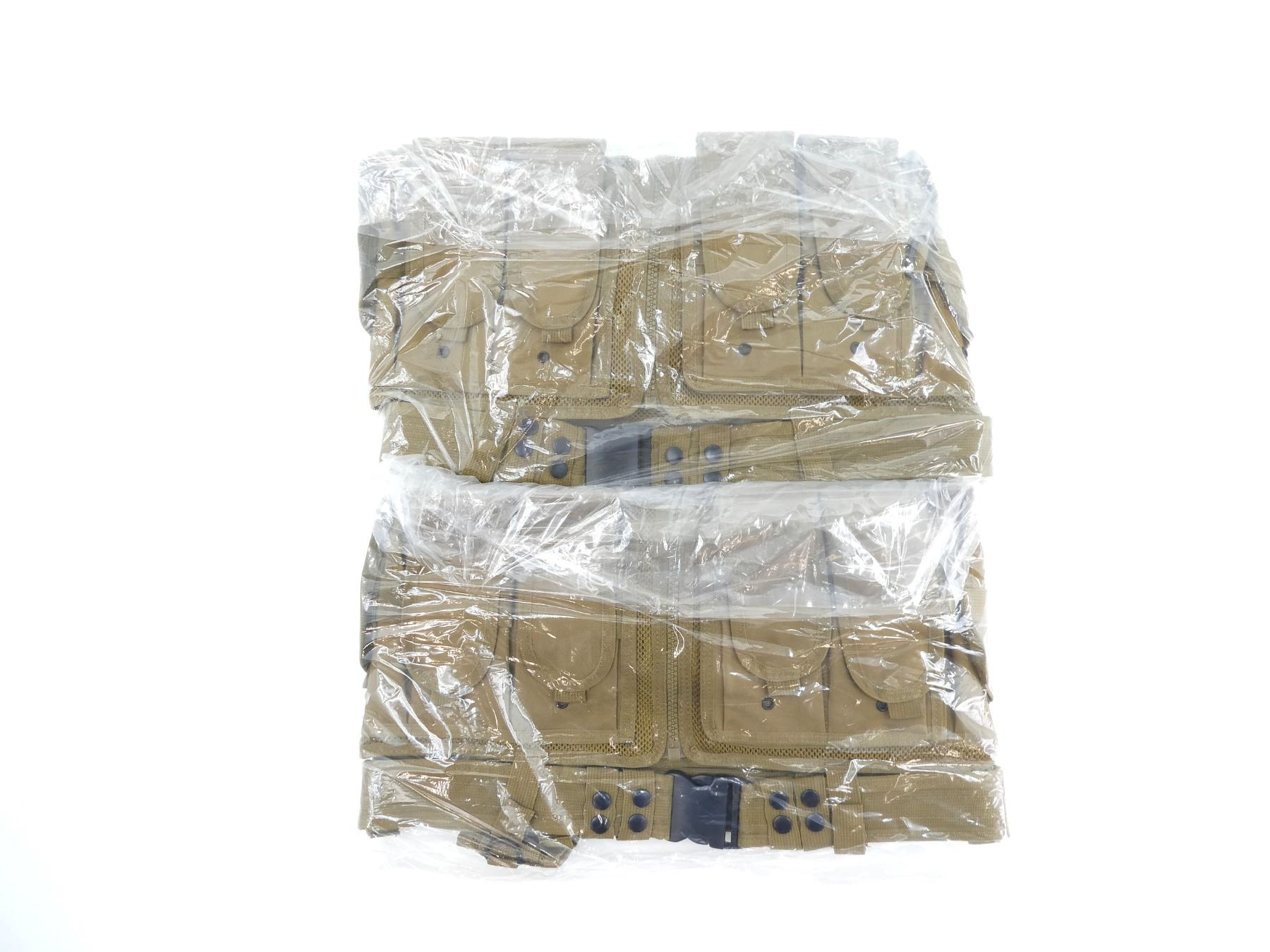 LOT INCLUDES; (2) COYOTE BROWN, POLYESTER CONSTRUCTION, ADJUSTABLE WITH SIX LARGE RIFLE MAGAZINE POUCHES, TWO SMALL UTILITY POUCHES & TWO MAP POUCHES ON THE INSIDE, WITH ZIP CLOSURES, ADJUSTABLE, NEW OLD STOCK, WITH ORIGINAL TAGS. SEE PHOTOS.