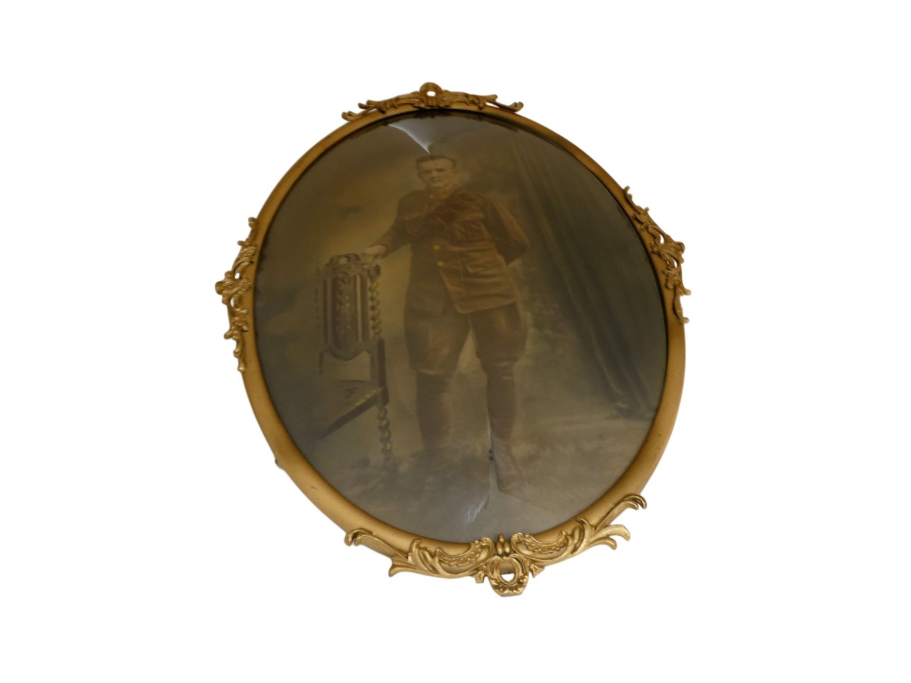 (1) HAND DRAW / PAINTED PORTRAIT OF A CANADIAN OR BRITISH SOLDIER, UNDER GLASS, NO ARTIST NAME / SIGNATURE, VINTAGE GOLD PAINTED METAL OVULAR FRAME, NO VISIBLE MARKINGS, APPROX. 21.5" X 15.5". SEE PHOTOS. *NO GUARANTEE ON GLASS FOR SHIPPING*