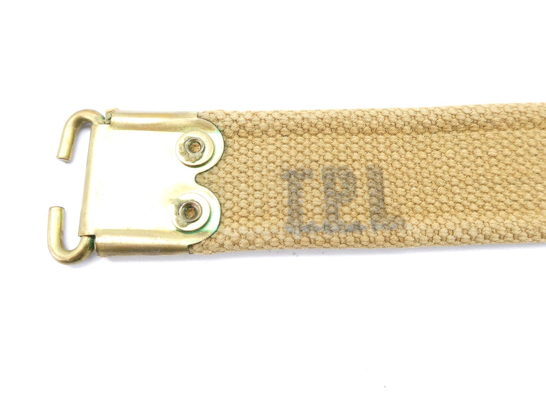 (1) TAN P37 WEB CANVAS SLING WITH BRASS FITTINGS, MARKED: "T.P.L." & OVERALL LENGTH APPROX. 45", ADJUSTABLE. SEE PHOTOS.