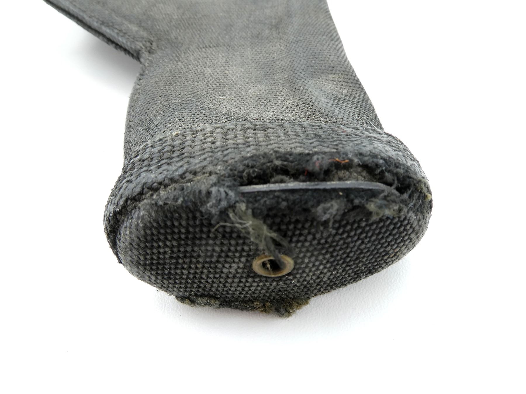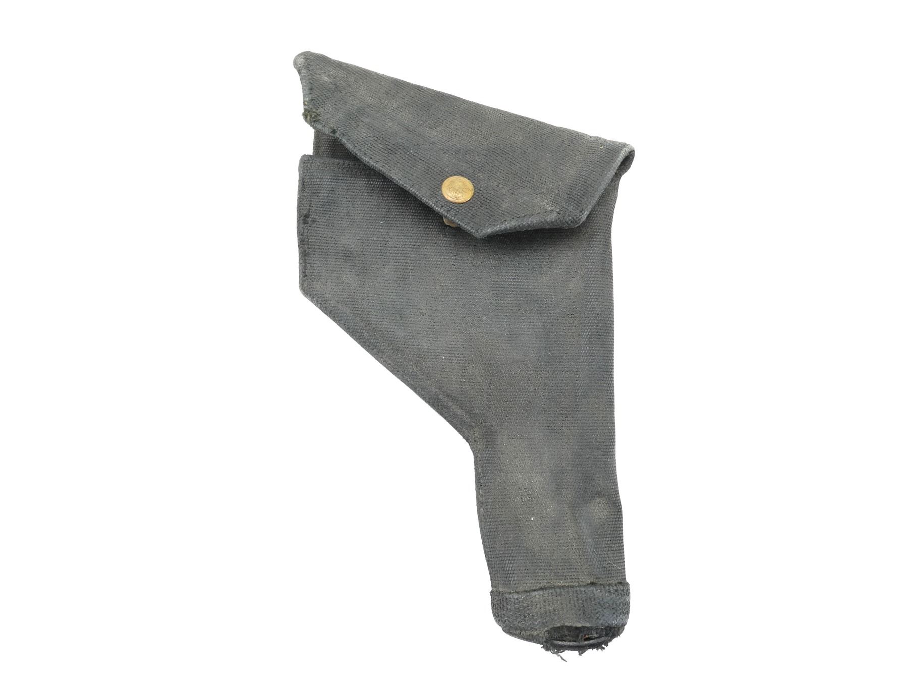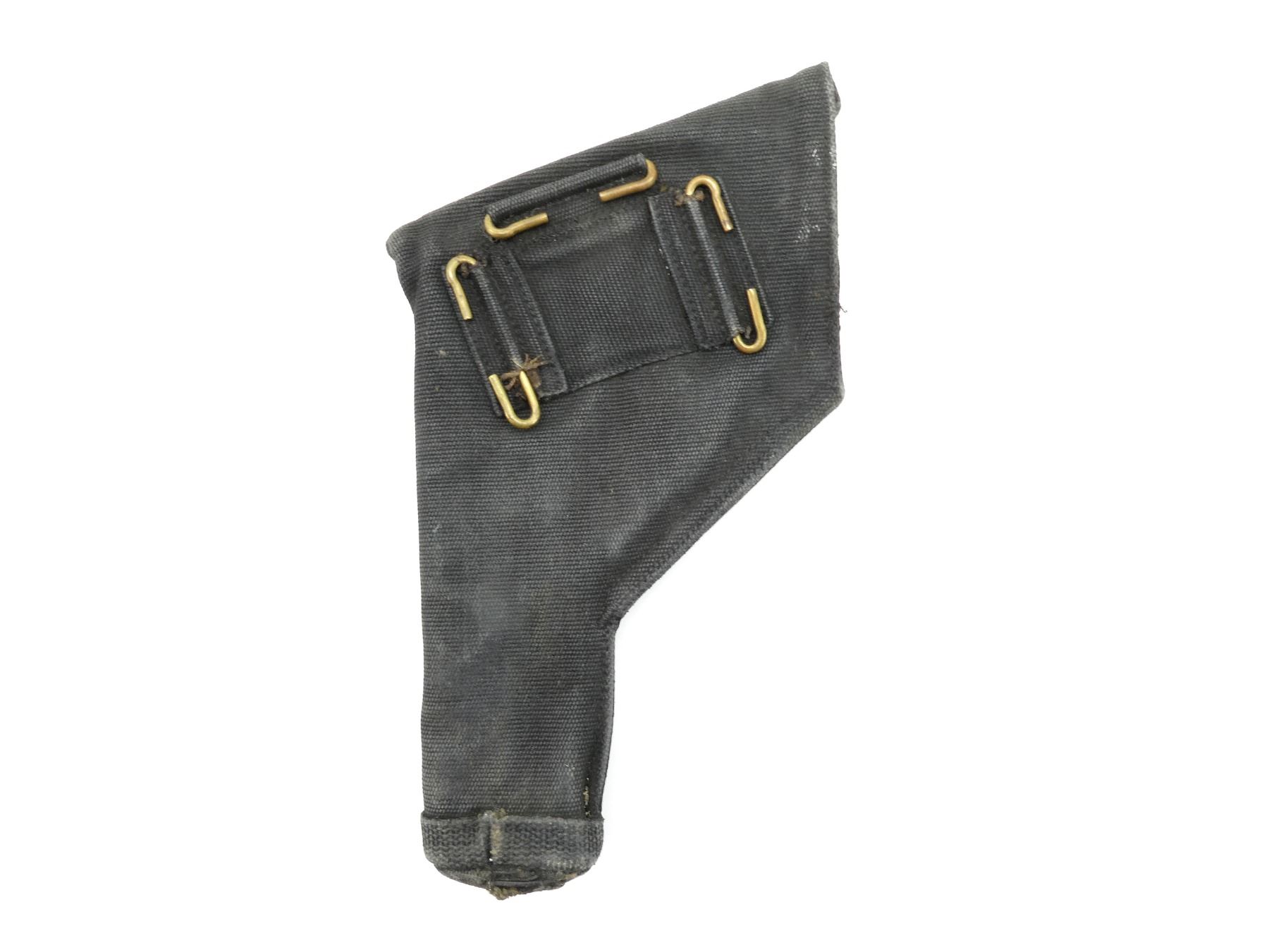 (1) FITS .38 S&W AND ENFIELD NO.2 MKI REVOLVERS, BLACKENED P37 WEB CANVAS HOLSTER WITH BRASS FITTINGS / BELT HOOKS, NO VISIBLE MARKINGS, SHOWS AGE / WEAR / TEAR. SEE PHOTOS.