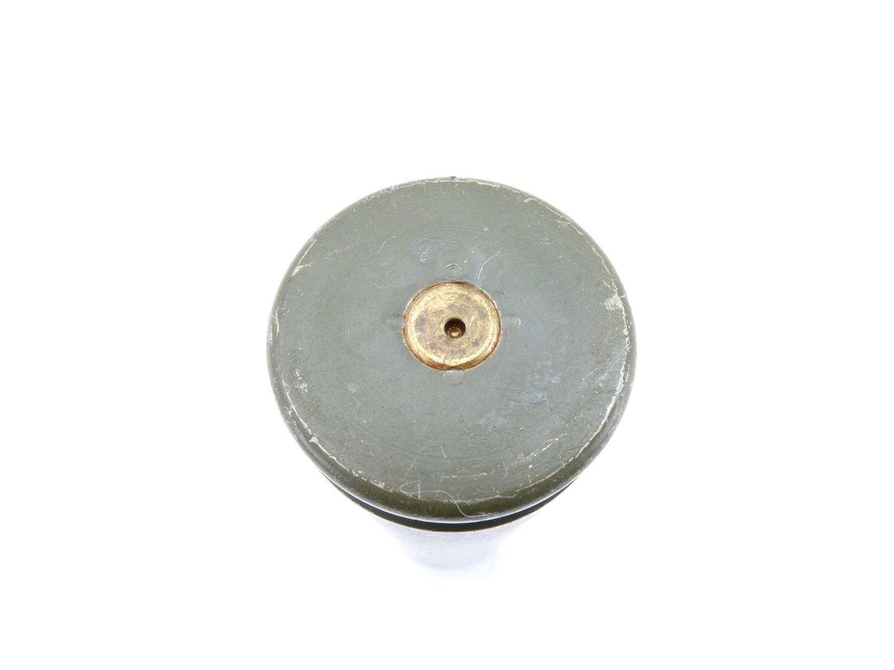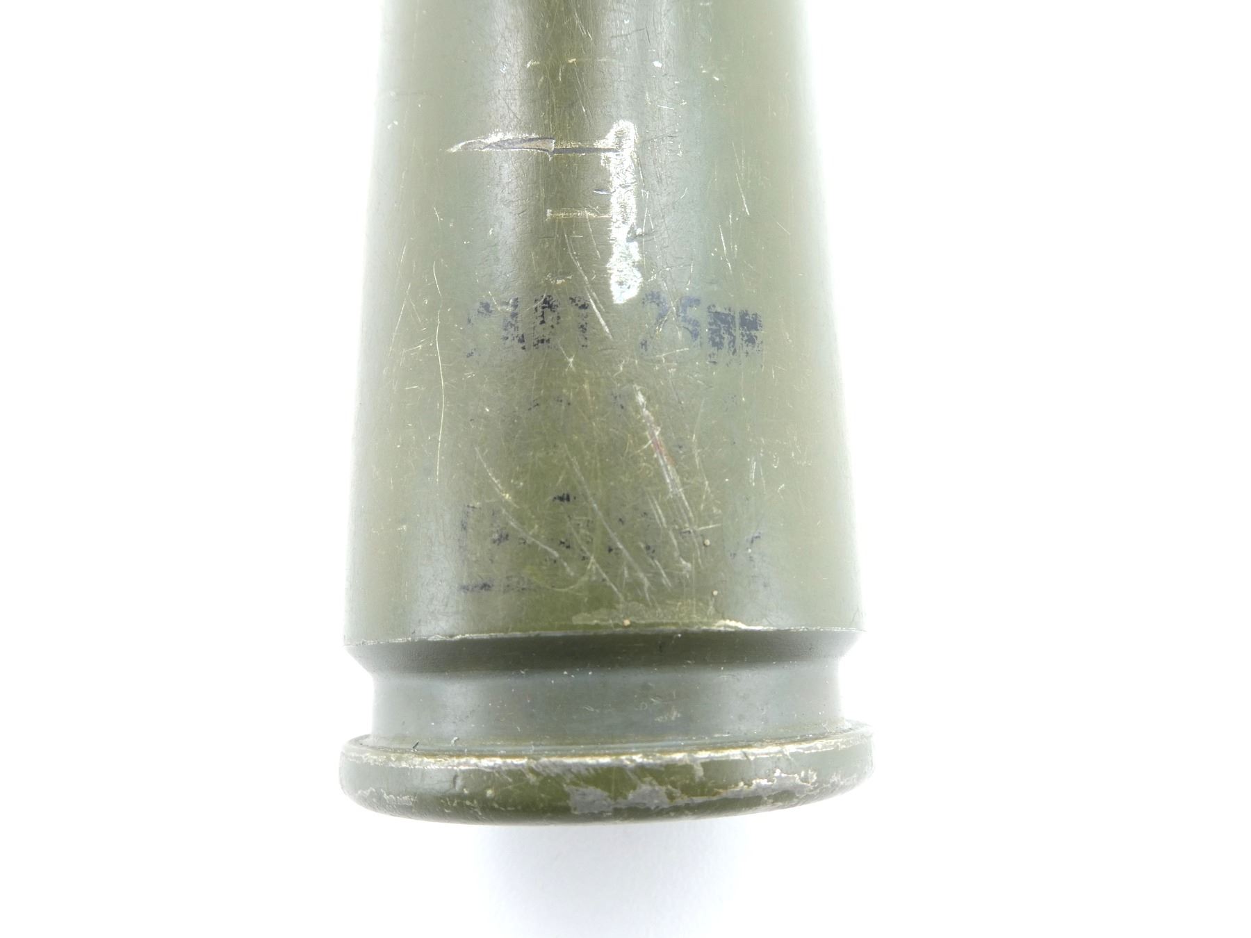 (1) GREEN PAINTED STEEL CASING, FIRED PRIMER, NO PROJECTILE, FAINTLY MARKED: "CART 25MM" ETC., APPROX. 1.5" DIA & OVERALL LENGTH APPROX.5 3/8". SEE PHOTOS.