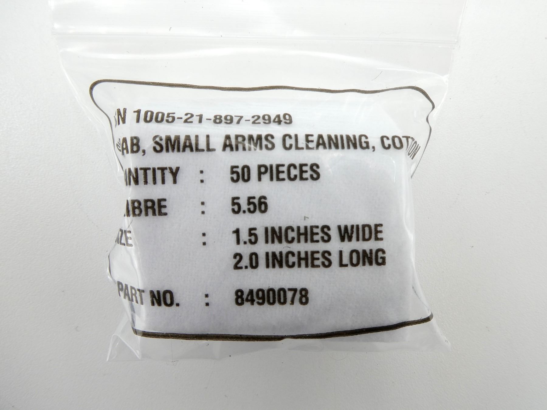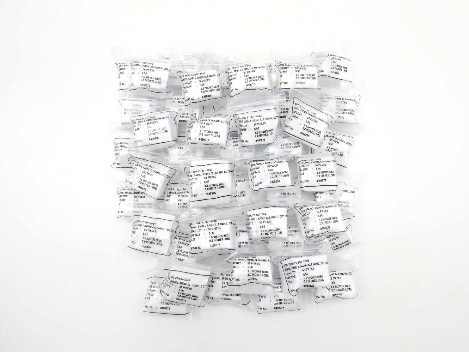 LOT INCLUDES; APPROX. (47) PACKAGES OF 50 COTTON SWABS, PACKAGING MARKED: "NSN 1005-21-897-2949, SWAB, SMALL ARMS CLEANING, COTTON, QUANTITY: 50 PIECES, CALIBER: 5.56" ETC. SEE PHOTOS.