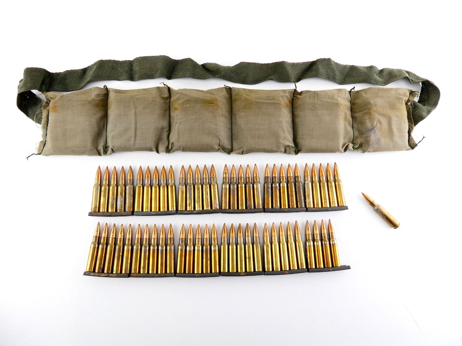 LOT INCLUDES; APPROX. (60) RNDS, FMJ, (12) STRIPPER CLIPS, (1) GREEN BANDOLIER.