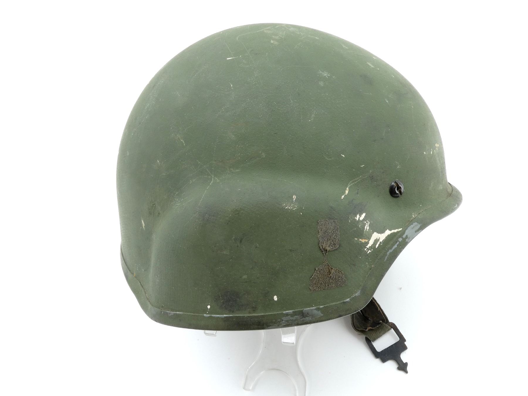 LOT INCLUDES; (1) GREEN PAINTED KEVLAR HELMET, LINED WITH REMOVEABLE PADDING, MARKED: "HELMET, SOLDIER, CG634, SMALL, NSN 8470-21-912-7604" ETC., SIZE SMALL, NYLON CHIN STRAP WITH METAL / PLASTIC FITTINGS, SHOWS AGE / WEAR & (1) GREEN CAMO HELMET COVER, MARKED: "HELMET COVER, MEDIUM, NSN 8470-21-912-7622" ETC., SIZE MEDIUM. SEE PHOTOS.