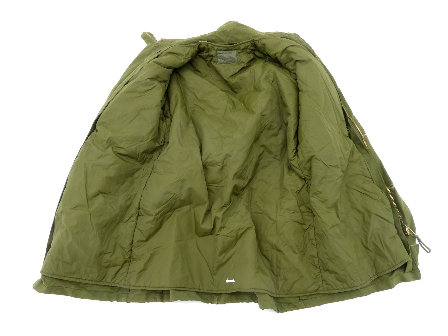 LOT INCLUDES; (1) GREEN CANVAS / NYLON COLD WEATHER PARKA WITH REMOVEABLE LINER ATTACHED, SIZE 7342 (MED-TALL_, VARIOUS LABELS / MARKINGS, BUTTON / ZIPPERED-FRONT (WORKS), SHOWS SLIGHT WEAR & (1) GREEN NYLON COMBAT PARKA LINER, SIZE 6740 (MED-TALL), VARIOUS LABELS / MARKINGS, SNAP ATTACHMENTS, SHOWS WEAR. SEE PHOTOS.