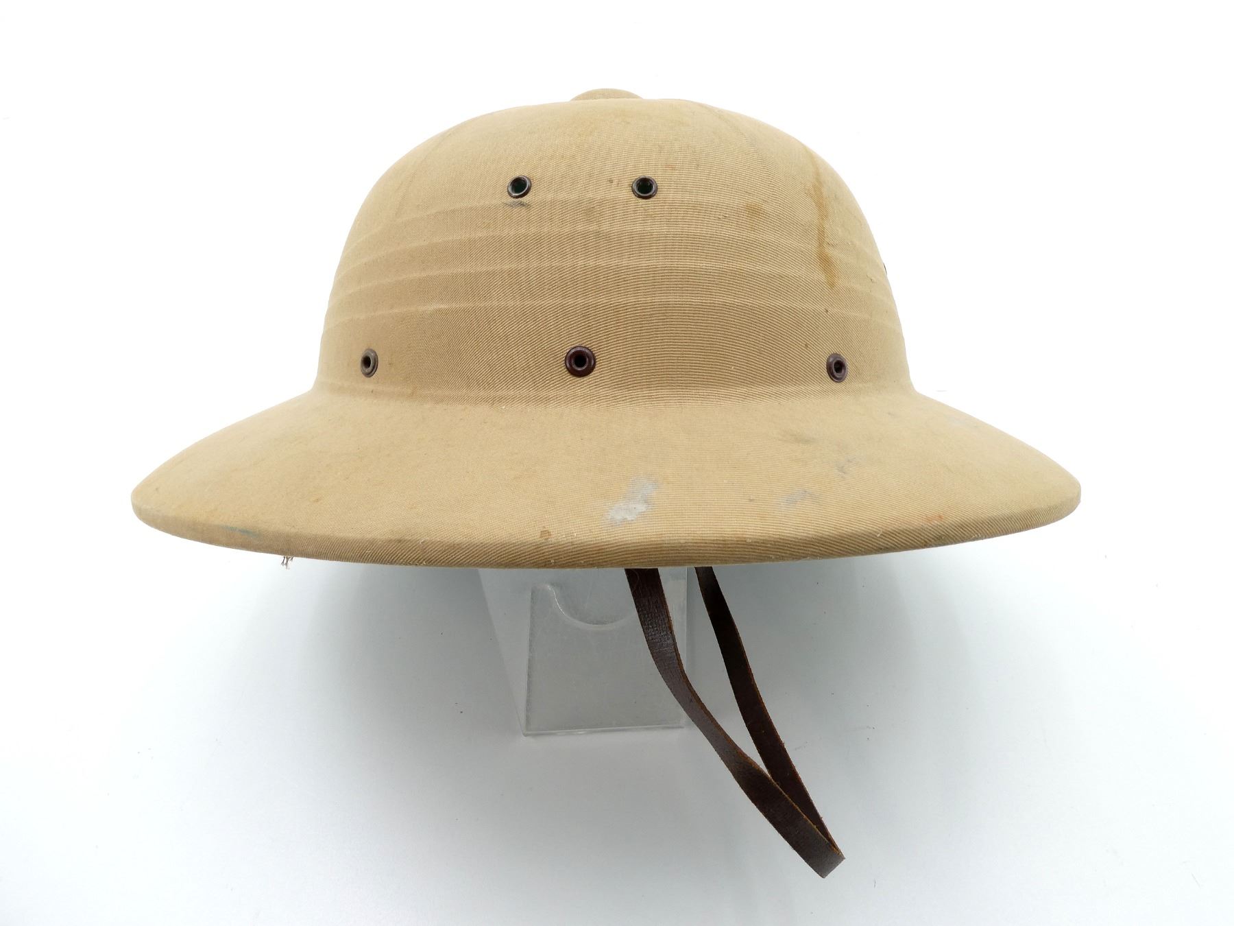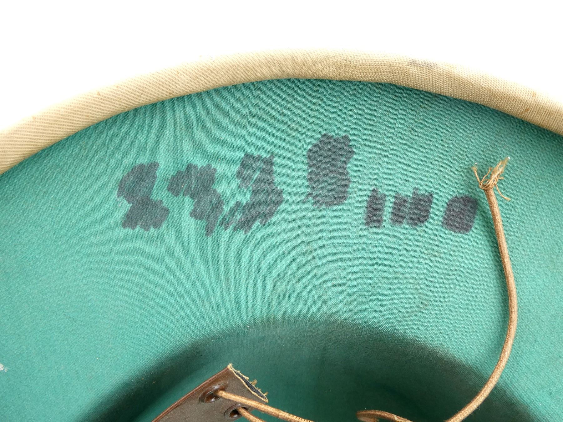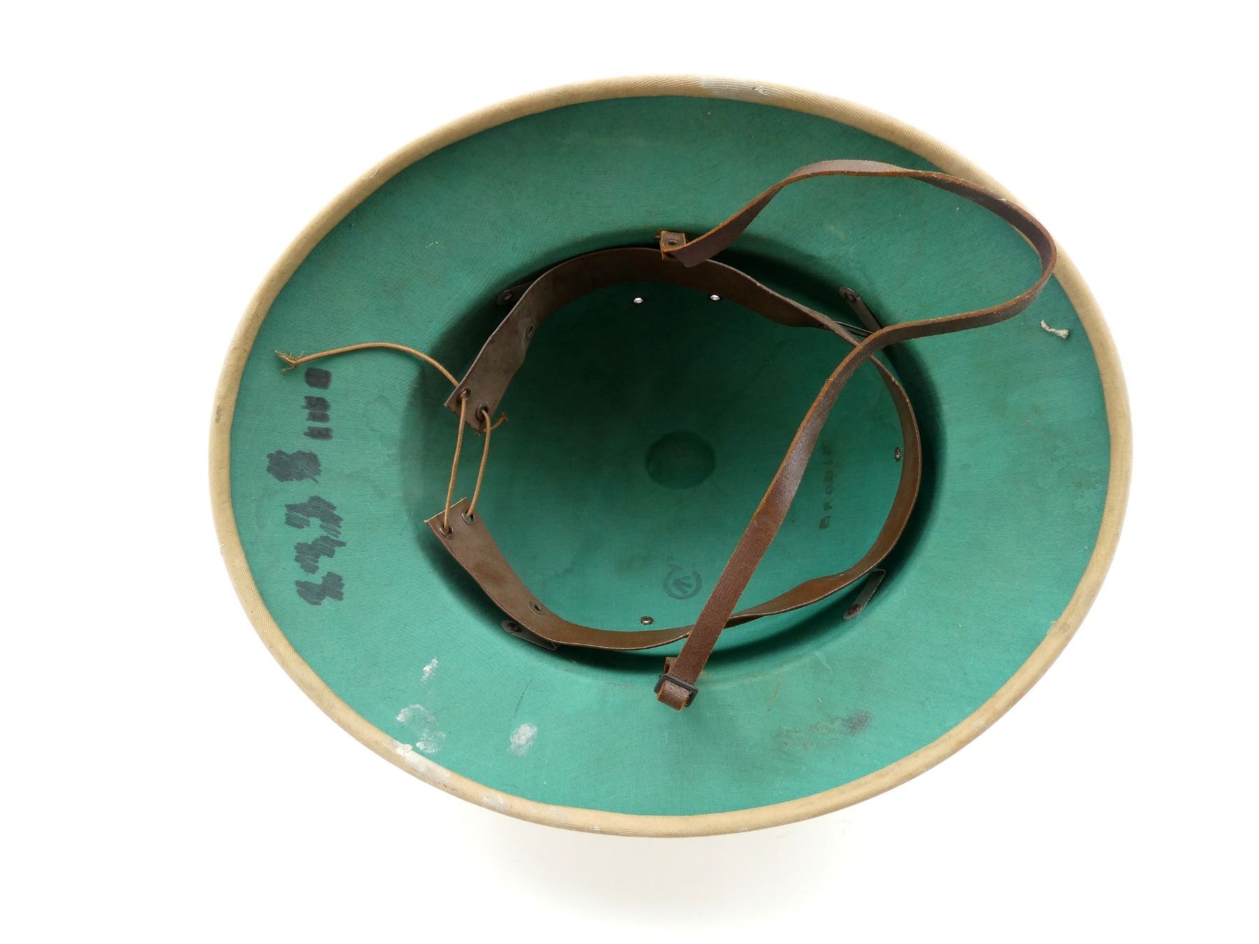 (1) KHAKI SUN HELMET WITH LEATHER HEAD BAND & CHIN STRAP, GREEN INTERIOR, HAT MARKED WITH C-BROAD ARROW, HAND-WRITTEN MARKING: "BRODIE", VARIOUS OTHER HAND-WRITTEN MARKINGS CROSSED OUT. SEE PHOTOS.