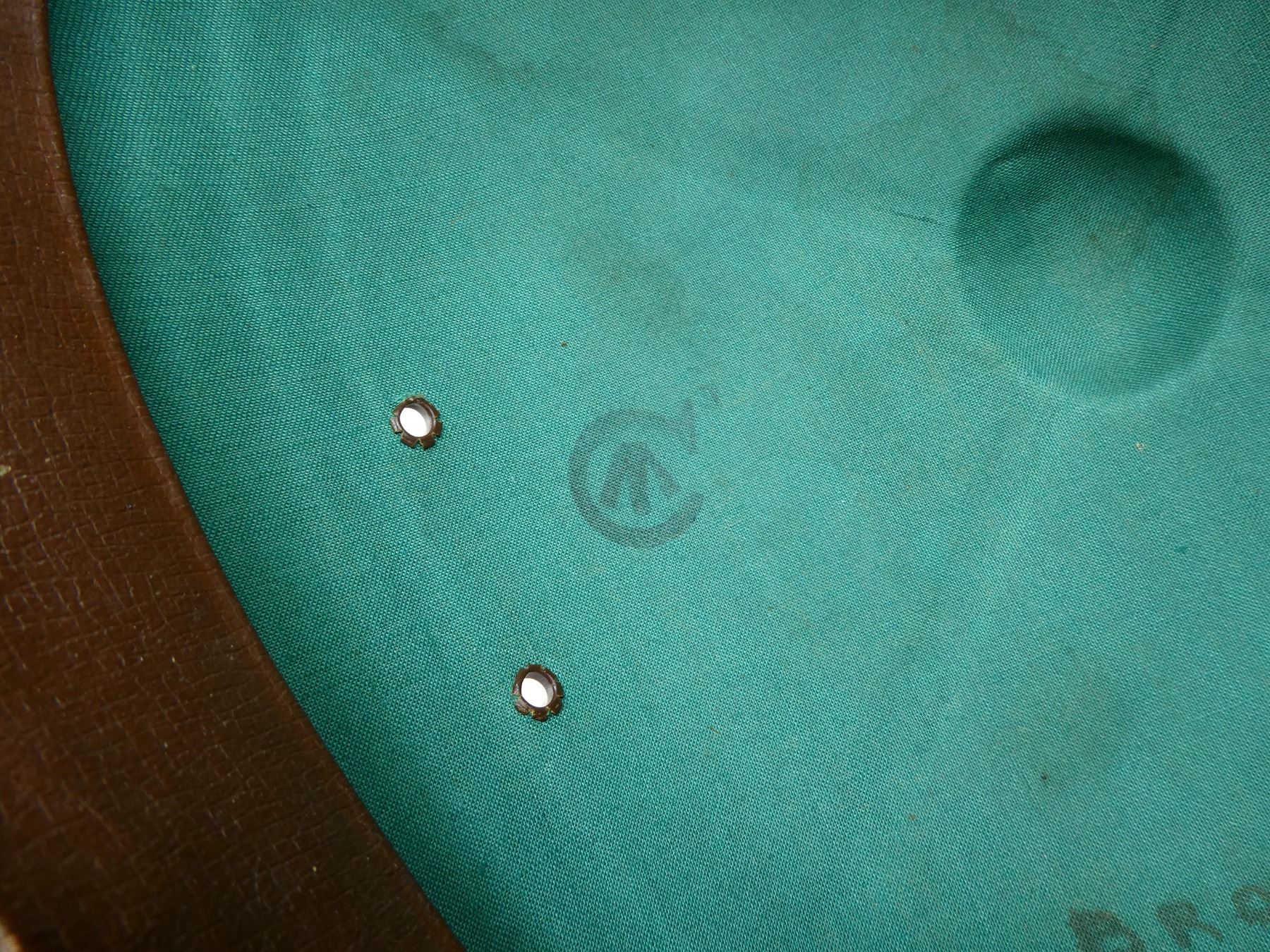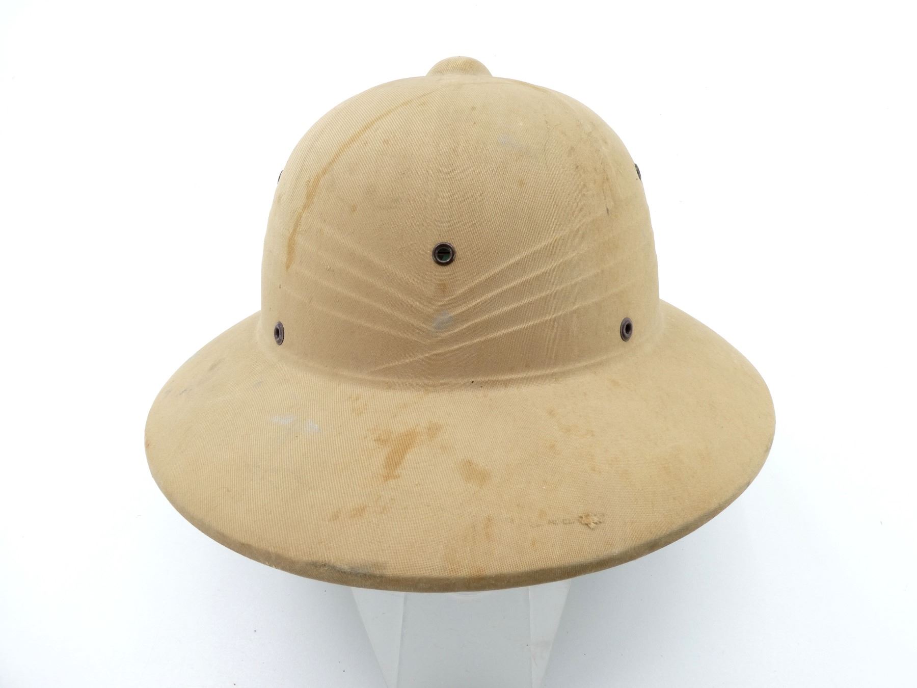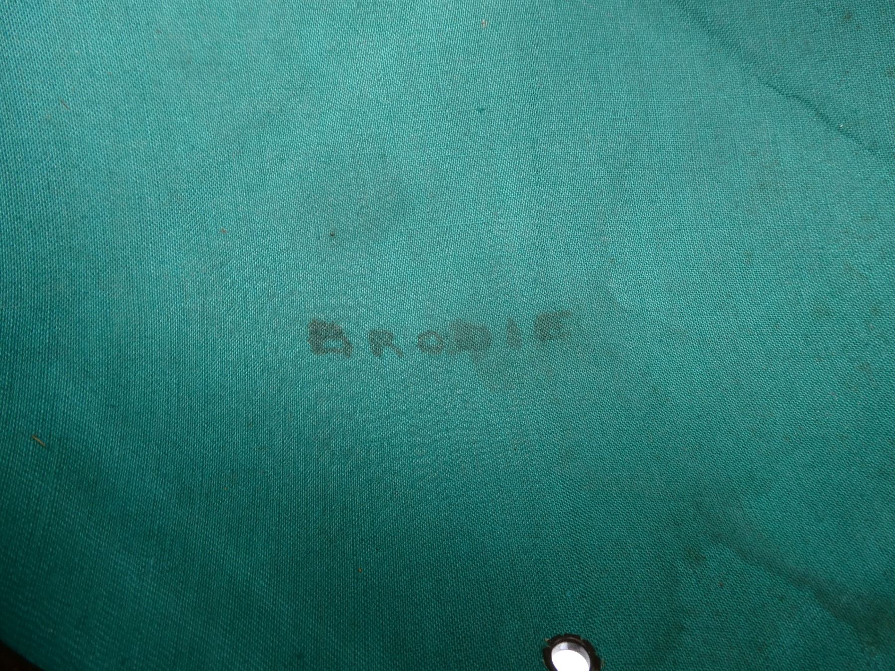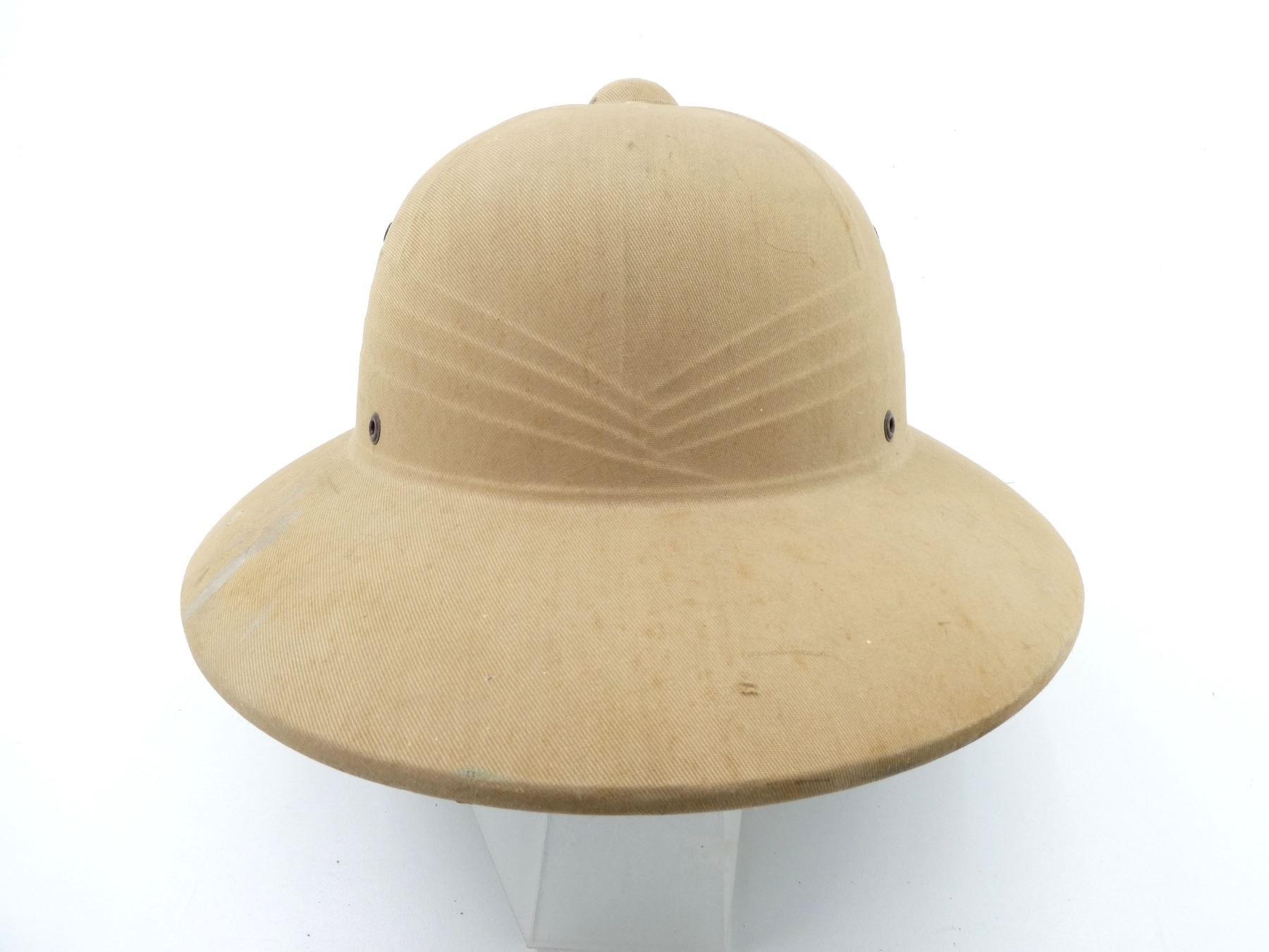 (1) KHAKI SUN HELMET WITH LEATHER HEAD BAND & CHIN STRAP, GREEN INTERIOR, HAT MARKED WITH C-BROAD ARROW, HAND-WRITTEN MARKING: "BRODIE", VARIOUS OTHER HAND-WRITTEN MARKINGS CROSSED OUT. SEE PHOTOS.
