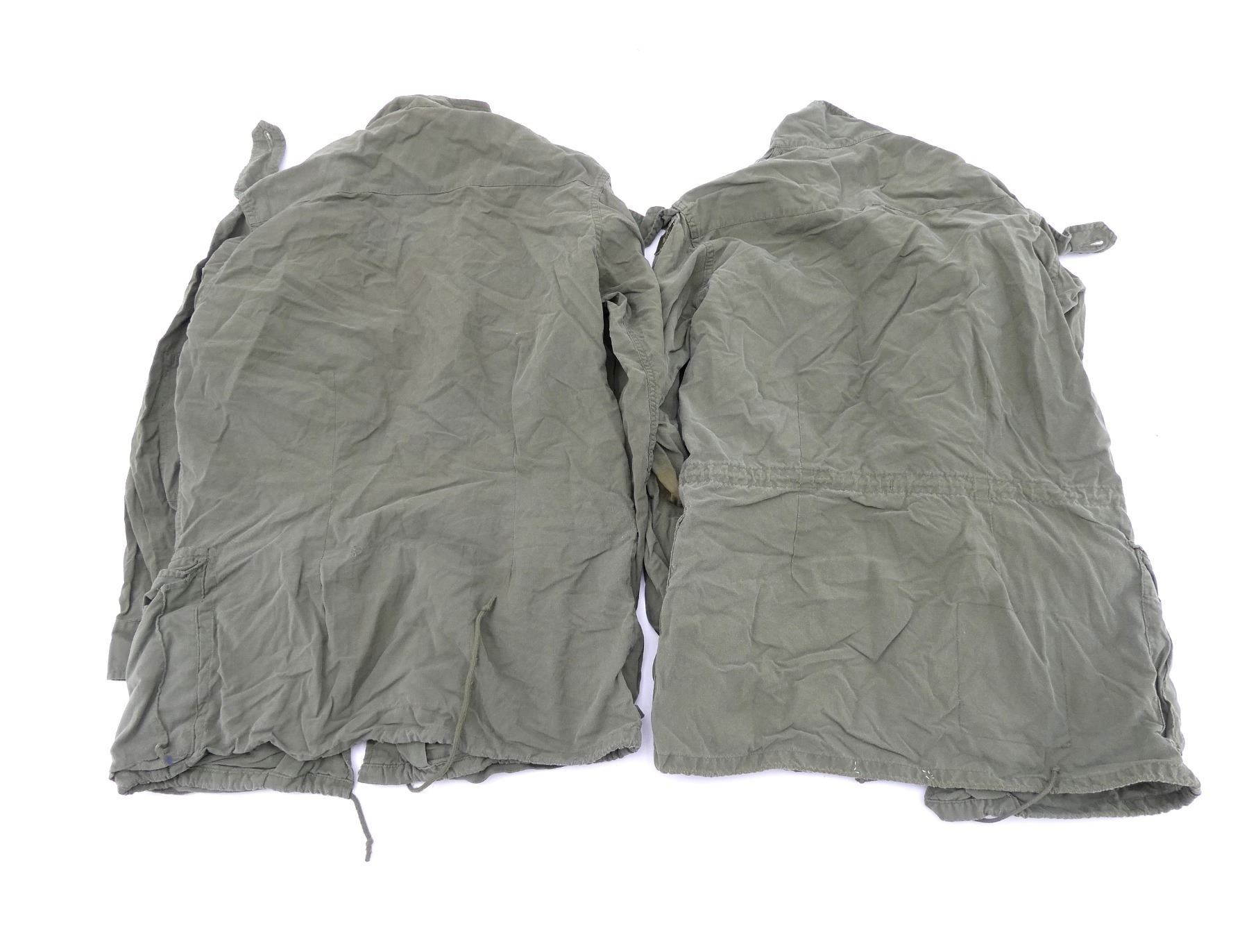 LOT INCLUDES; (4) GREEN CANVAS LIGHTWEIGHT COMBAT COATS, SIZE 4 REG-SMALL, VARIOUS LABELS / MARKINGS, SOME WITH CANADIAN FLAG SHOULDER BADGES, BUTTON-FRONTS, SHOWS AGE / WEAR / TEAR. SEE PHOTOS.