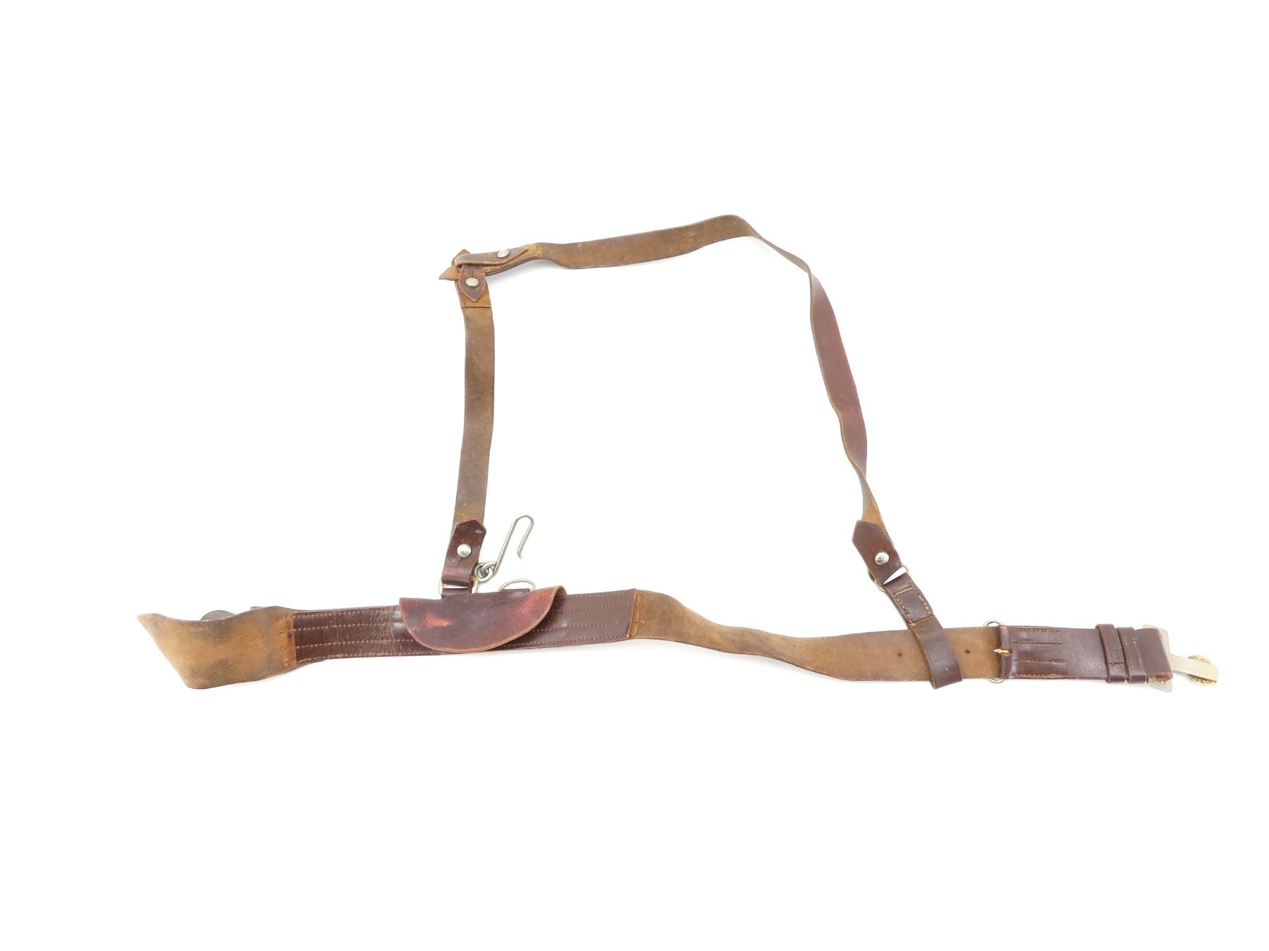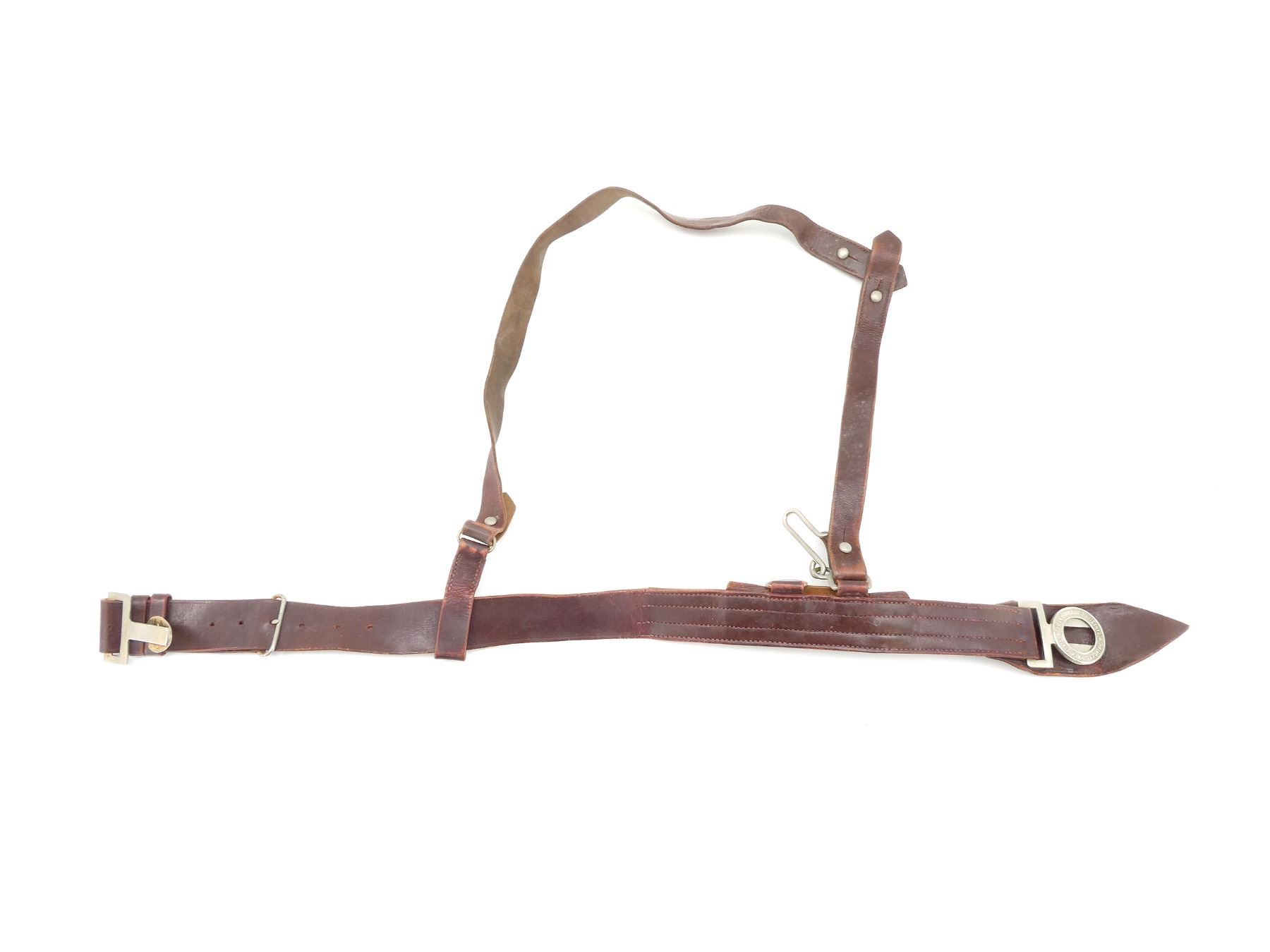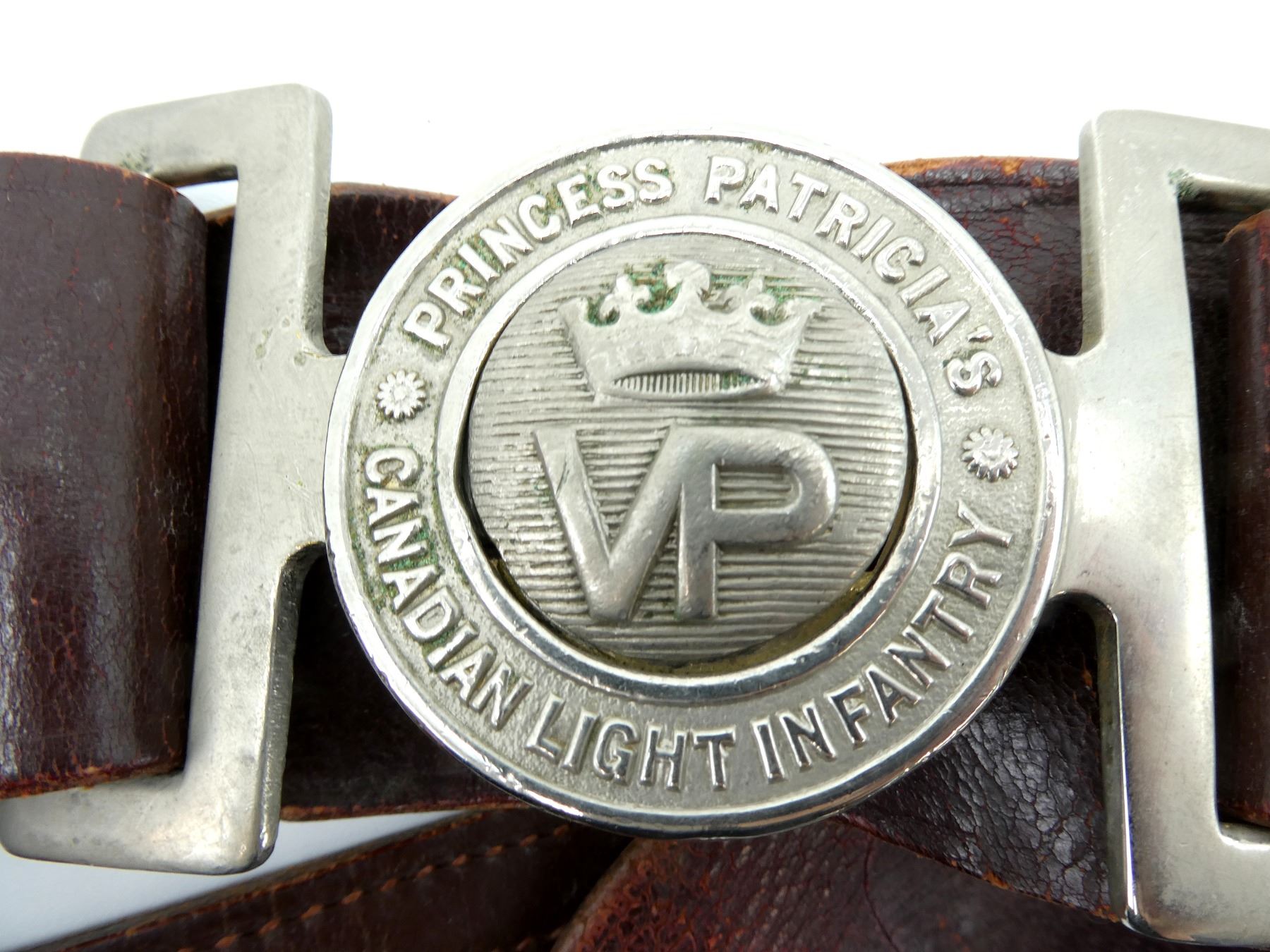 (1) BROWN LEATHER BELT WITH METAL PRINCESS PATRICIA'S CANADIAN LIGHT INFANTRY BELT BUCKLE, CROWN OVER "VP" IN CENTER OF BUCKLE, METAL FITTINGS, BROWN LEATHER SHOULDER STRAP, NO VISIBLE MARKINGS, OVERALL LENGTH APPROX. 38.5", ADJUSTABLE. SEE PHOTOS.