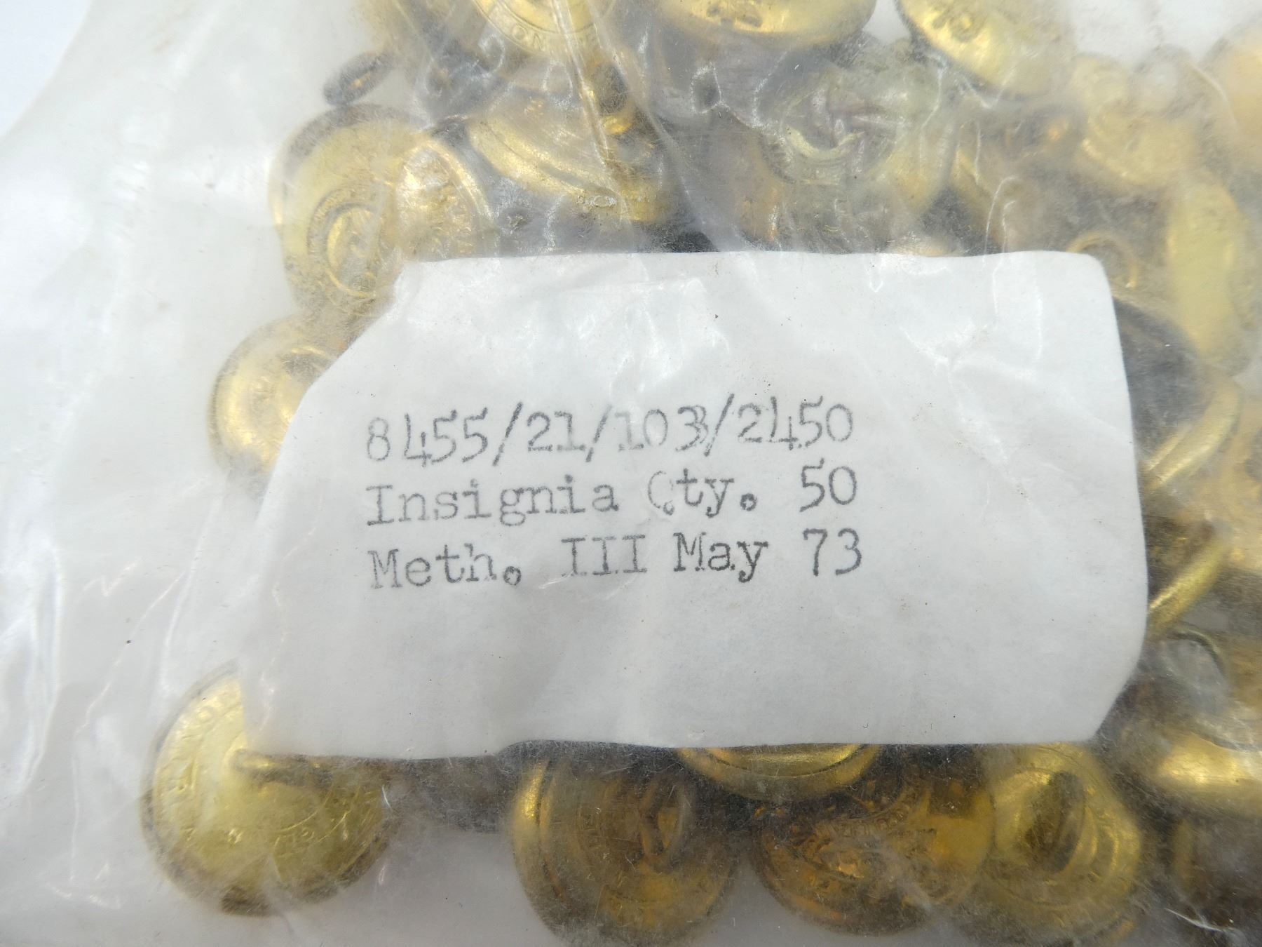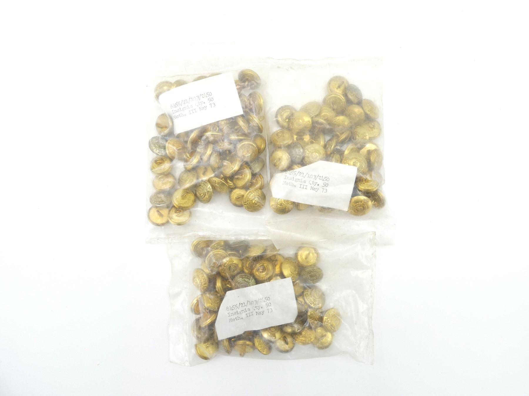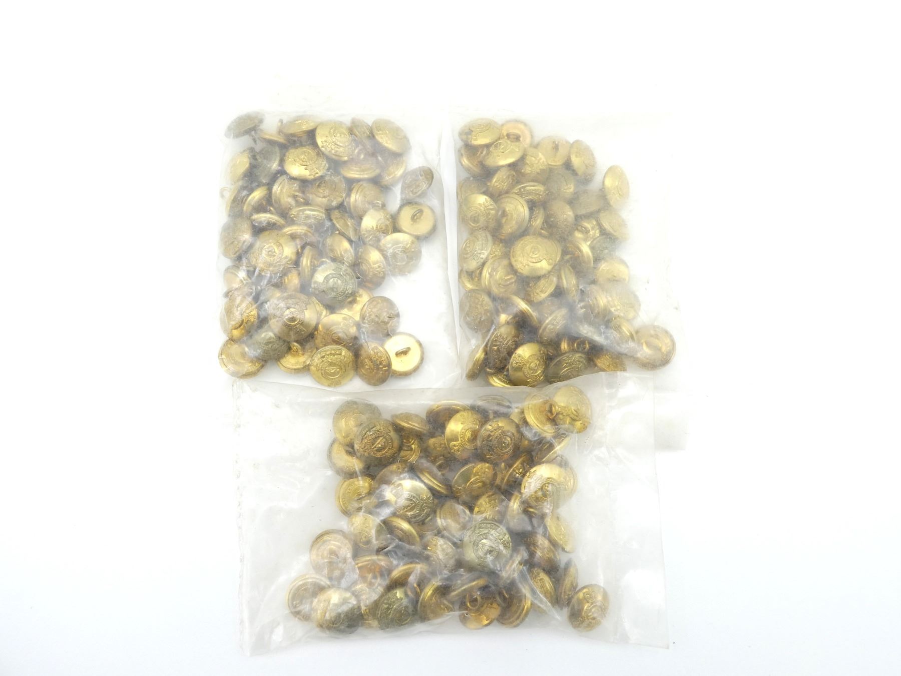 LOT INCLUDES; APPROX. (150) QUEEN'S CROWN BRASS ROYAL CANADIAN ARMY PAY CORPS (R.C.A.P.C.) BUTTONS, SMALL SIZE, NEW OLD STOCK, IN ORIGINAL UN-OPENED PACKAGING. SEE PHOTOS.