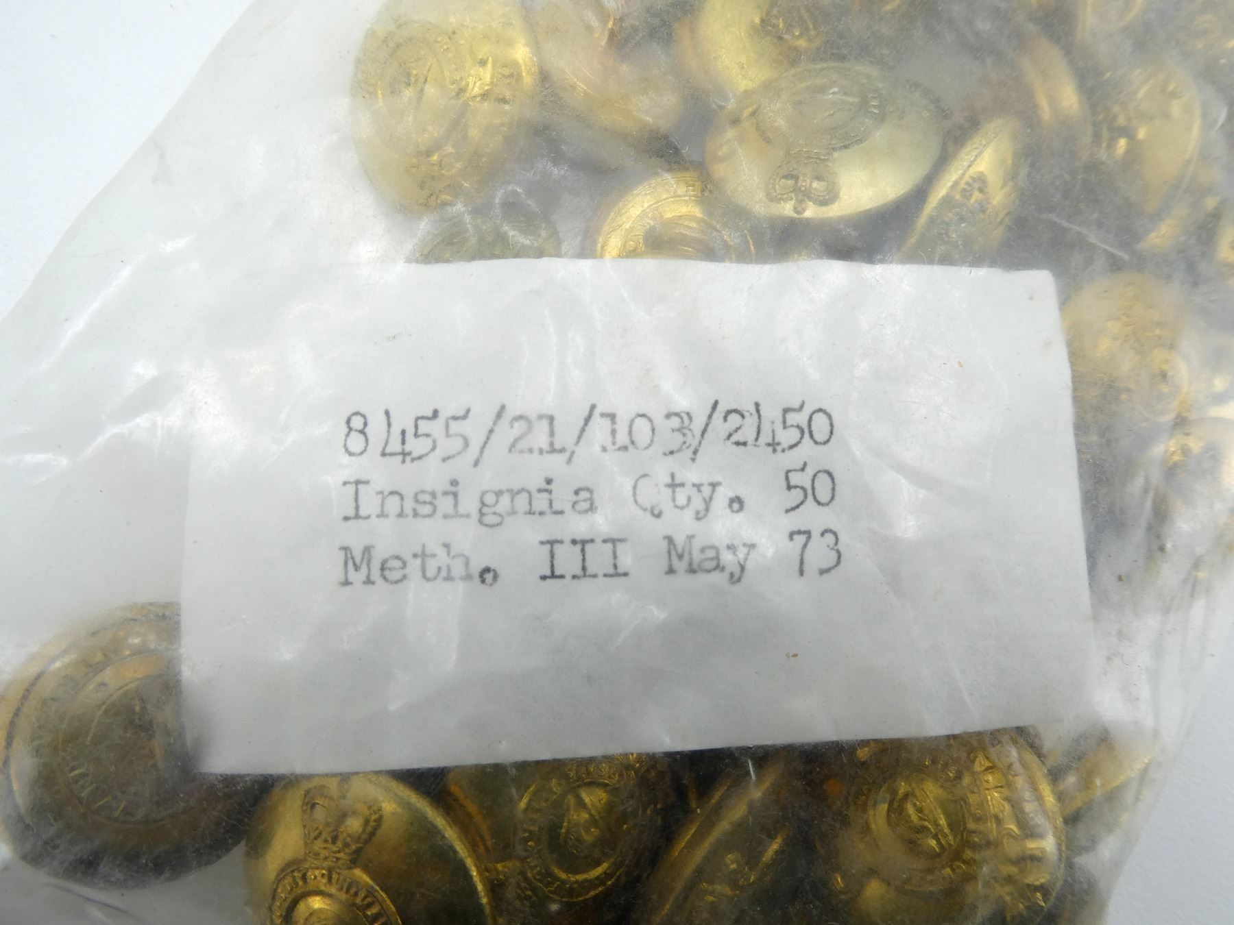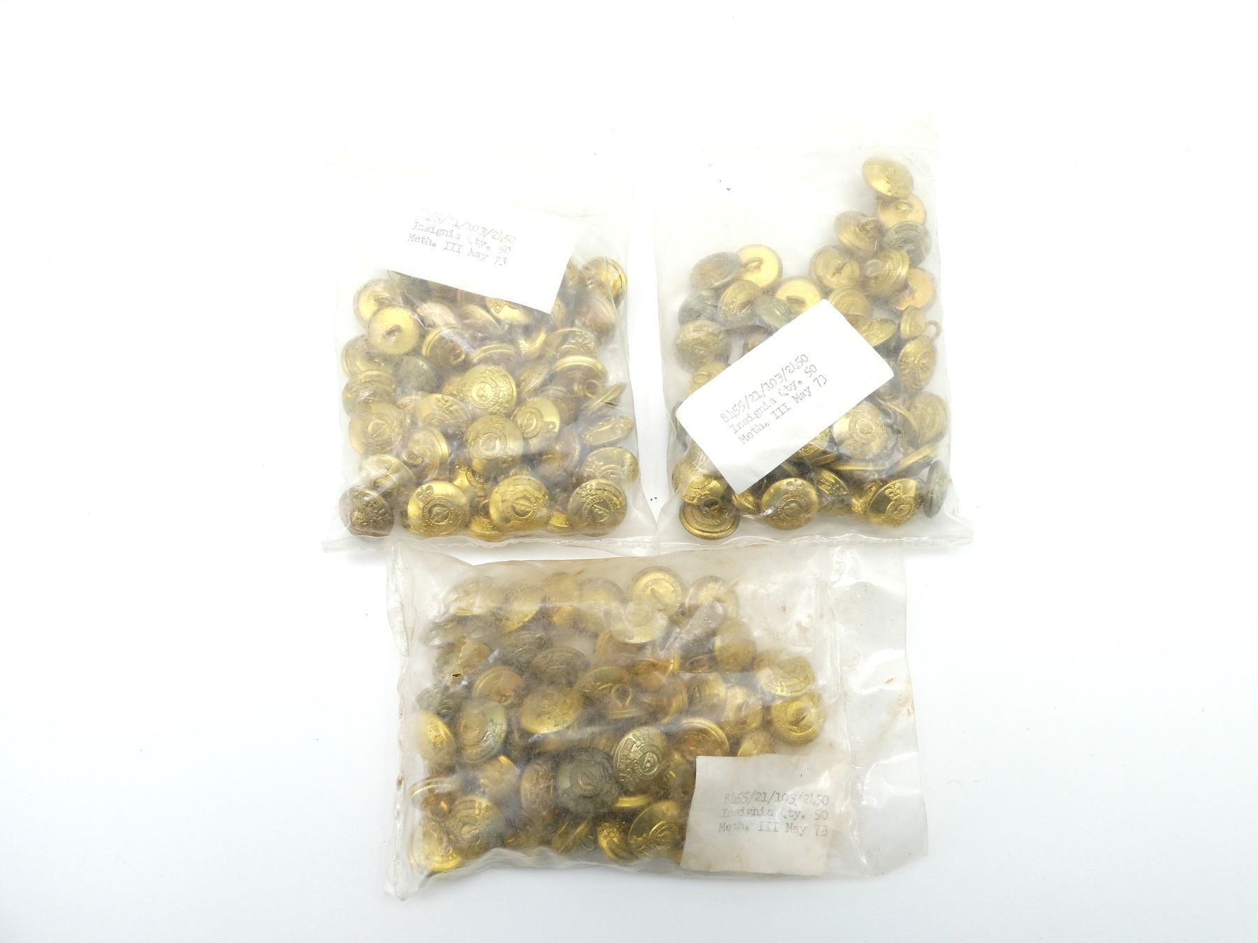 LOT INCLUDES; APPROX. (150) QUEEN'S CROWN BRASS ROYAL CANADIAN ARMY PAY CORPS (R.C.A.P.C.) BUTTONS, SMALL SIZE, NEW OLD STOCK, IN ORIGINAL UN-OPENED PACKAGING. SEE PHOTOS.