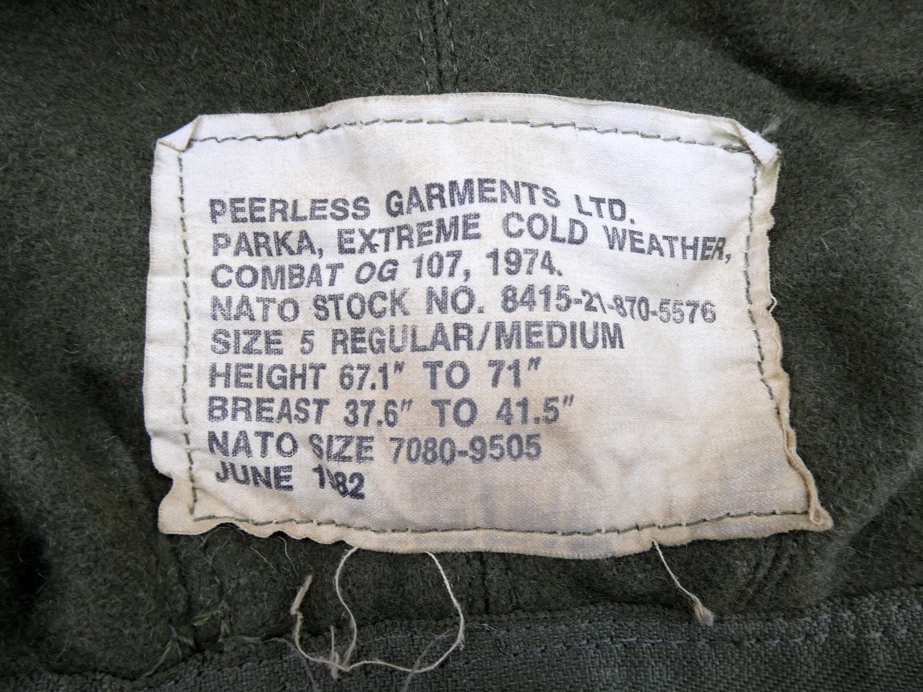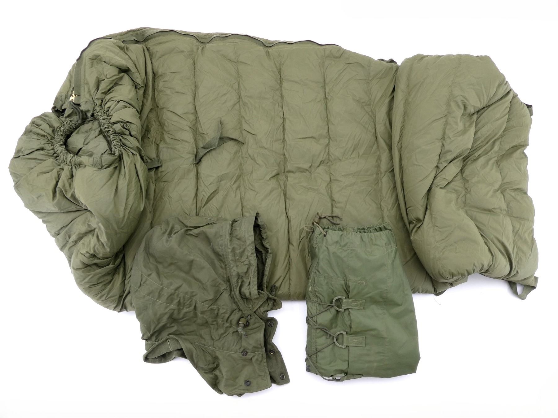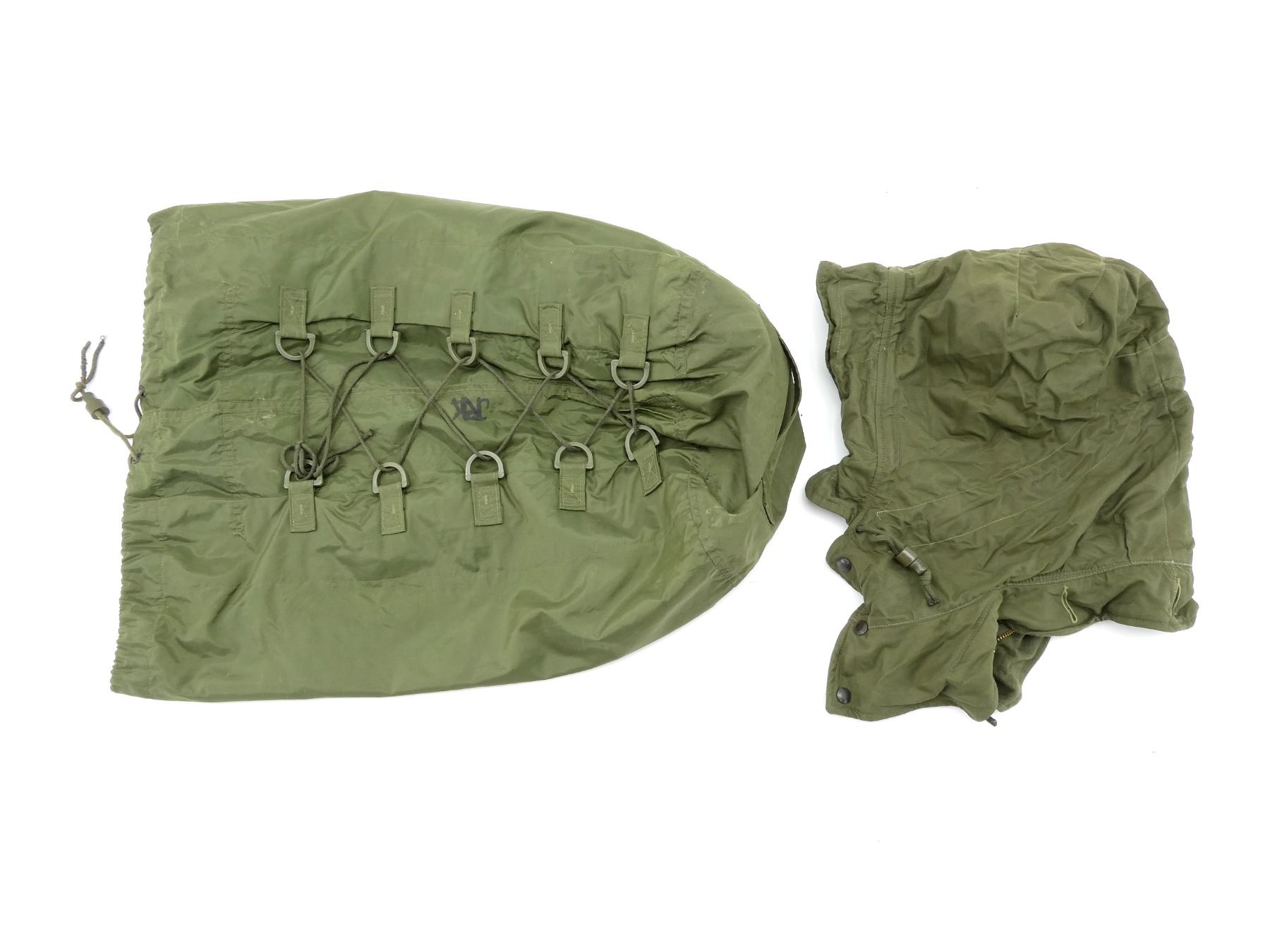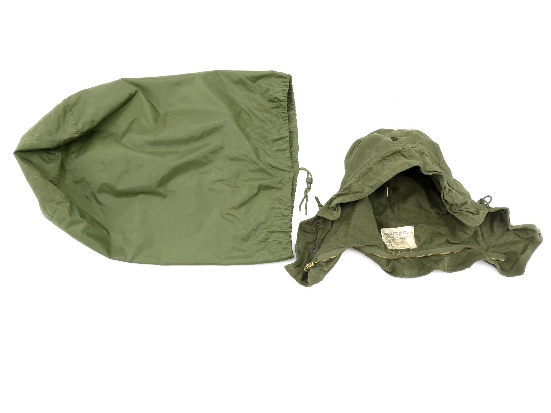 LOT INCLUDES; (1) GREEN NYLON SLEEPING BAG WITH GREEN NYLON CARRIER, CARRIER BAG IS RUBBERIZED INSIDE, VARIOUS HAND-WRITTEN MARKINGS ON BAG, DOWN FILLED SLEEPING BAG MARKED: "NSN 8465-21-842-6079, SLEEPING BAG, INNER, COLD WEATHER, IMPERIAL FEATHER CORP. LTD., 03 1992" ETC., ZIPPERED (WORKS), APPROX. 70" L X 30" W & (1) GREEN CANVAS EXTREME COLD WEATHER PARKA HOOD, MARKED: "PEERLESS GARMENTS LTD., PARKA, EXTREME COLD WEATHER, COMBAT OG 107, 1974, 8415-21-870-5576, SIZE 5 REGULAR / MEDIUM" ETC. SEE PHOTOS.