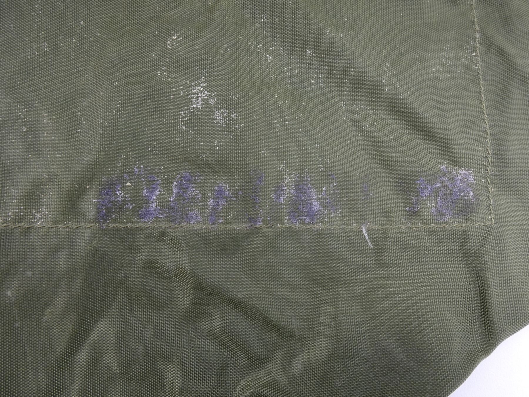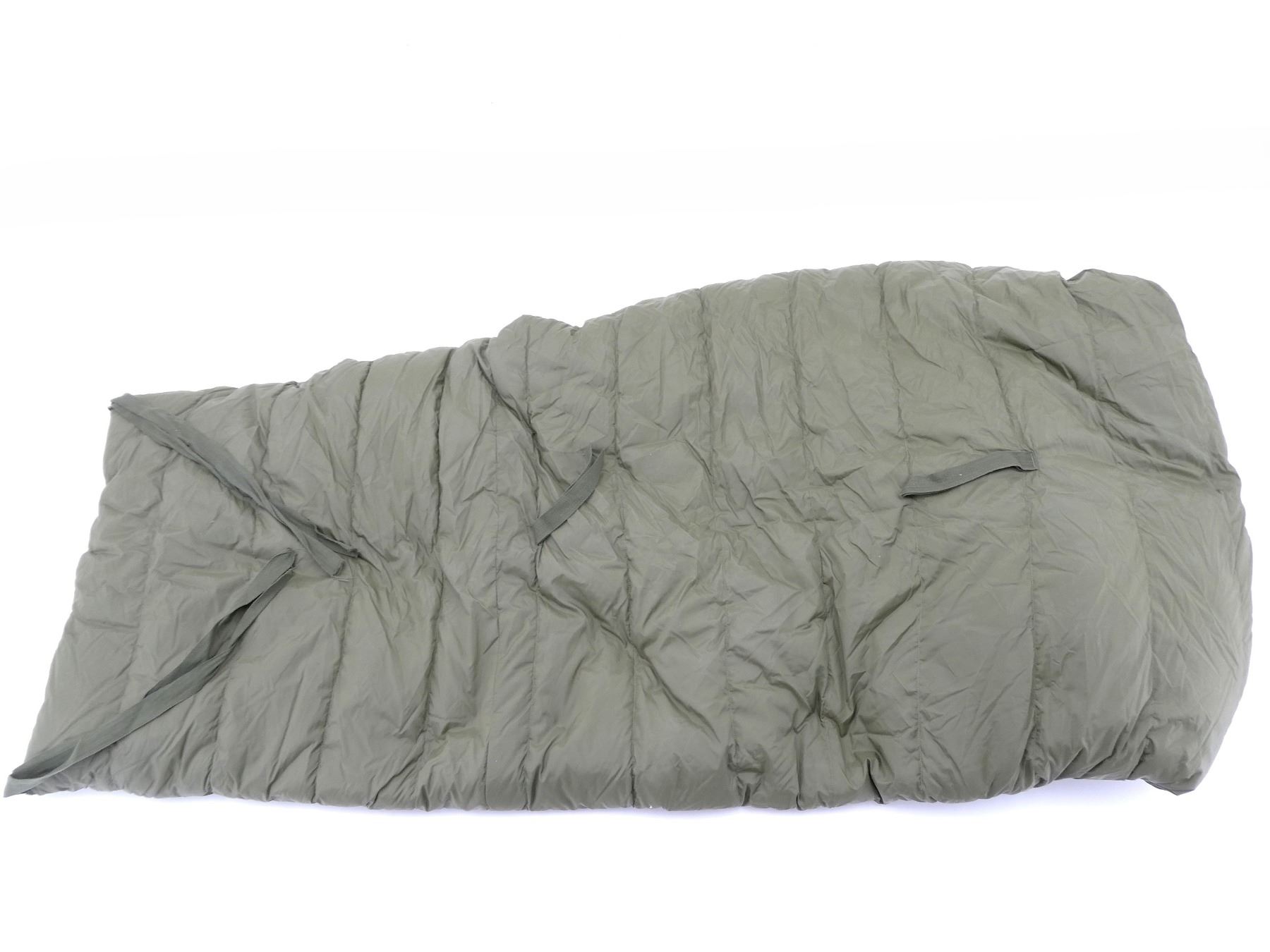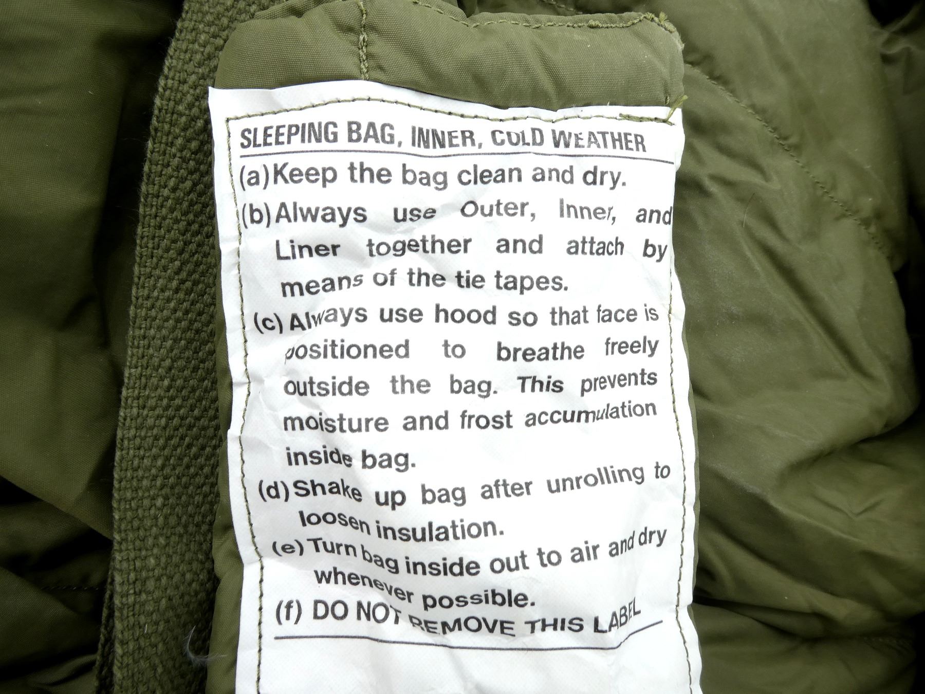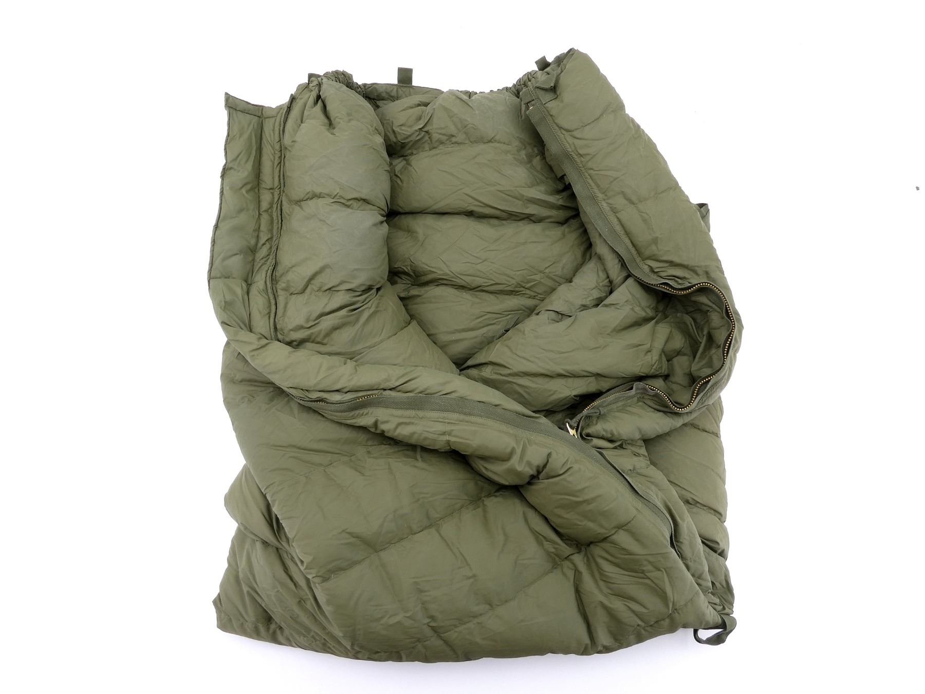 LOT INCLUDES; (1) GREEN NYLON SLEEPING BAG WITH GREEN NYLON CARRIER, CARRIER BAG IS RUBBERIZED INSIDE, VARIOUS HAND-WRITTEN MARKINGS ON BAG, DOWN FILLED SLEEPING BAG MARKED: "NSN 8465-21-842-6079, SLEEPING BAG, INNER, COLD WEATHER, IMPERIAL FEATHER CORP. LTD., 03 1992" ETC., ZIPPERED (WORKS), APPROX. 70" L X 30" W & (1) GREEN CANVAS EXTREME COLD WEATHER PARKA HOOD, MARKED: "PEERLESS GARMENTS LTD., PARKA, EXTREME COLD WEATHER, COMBAT OG 107, 1974, 8415-21-870-5576, SIZE 5 REGULAR / MEDIUM" ETC. SEE PHOTOS.