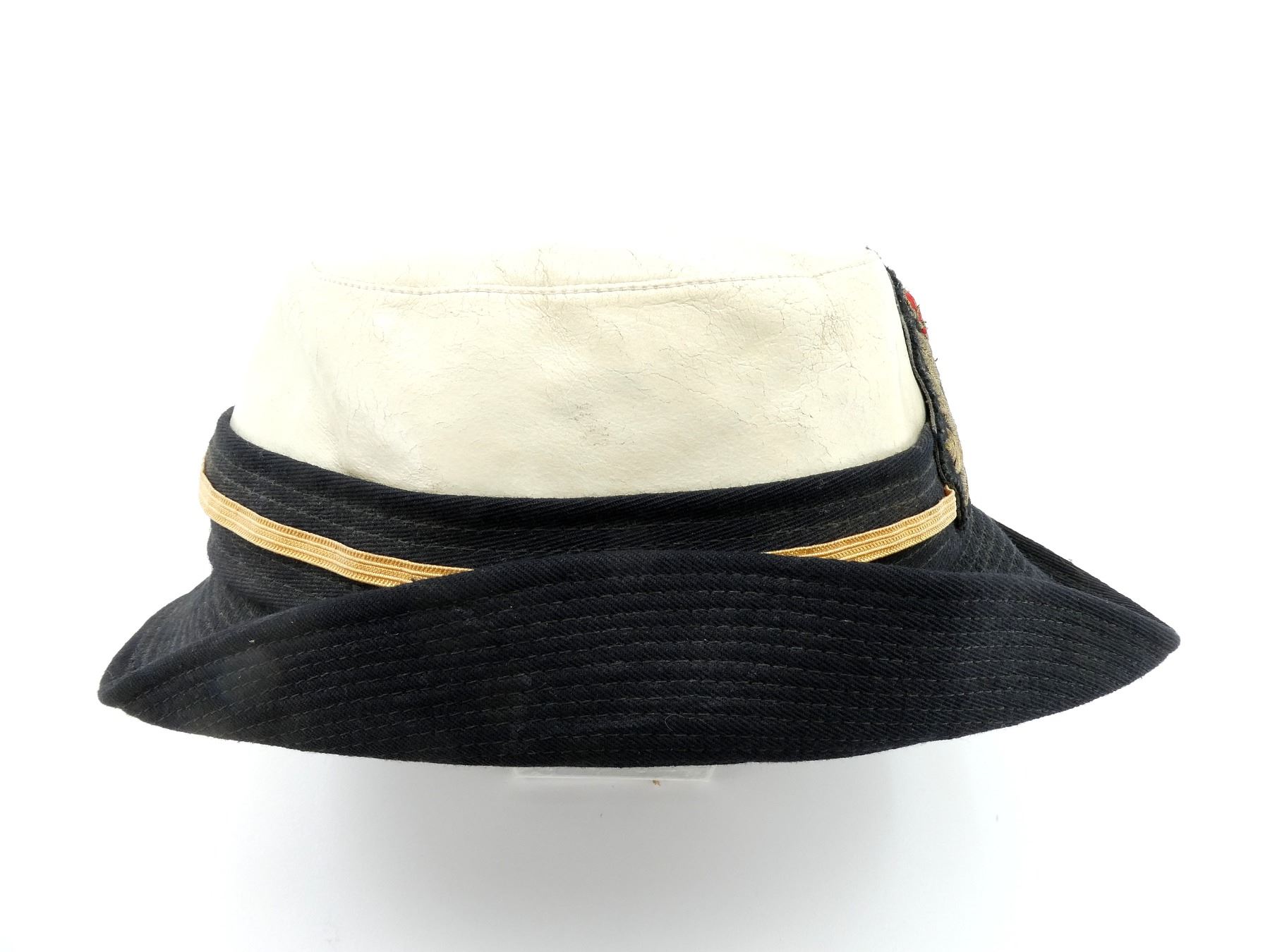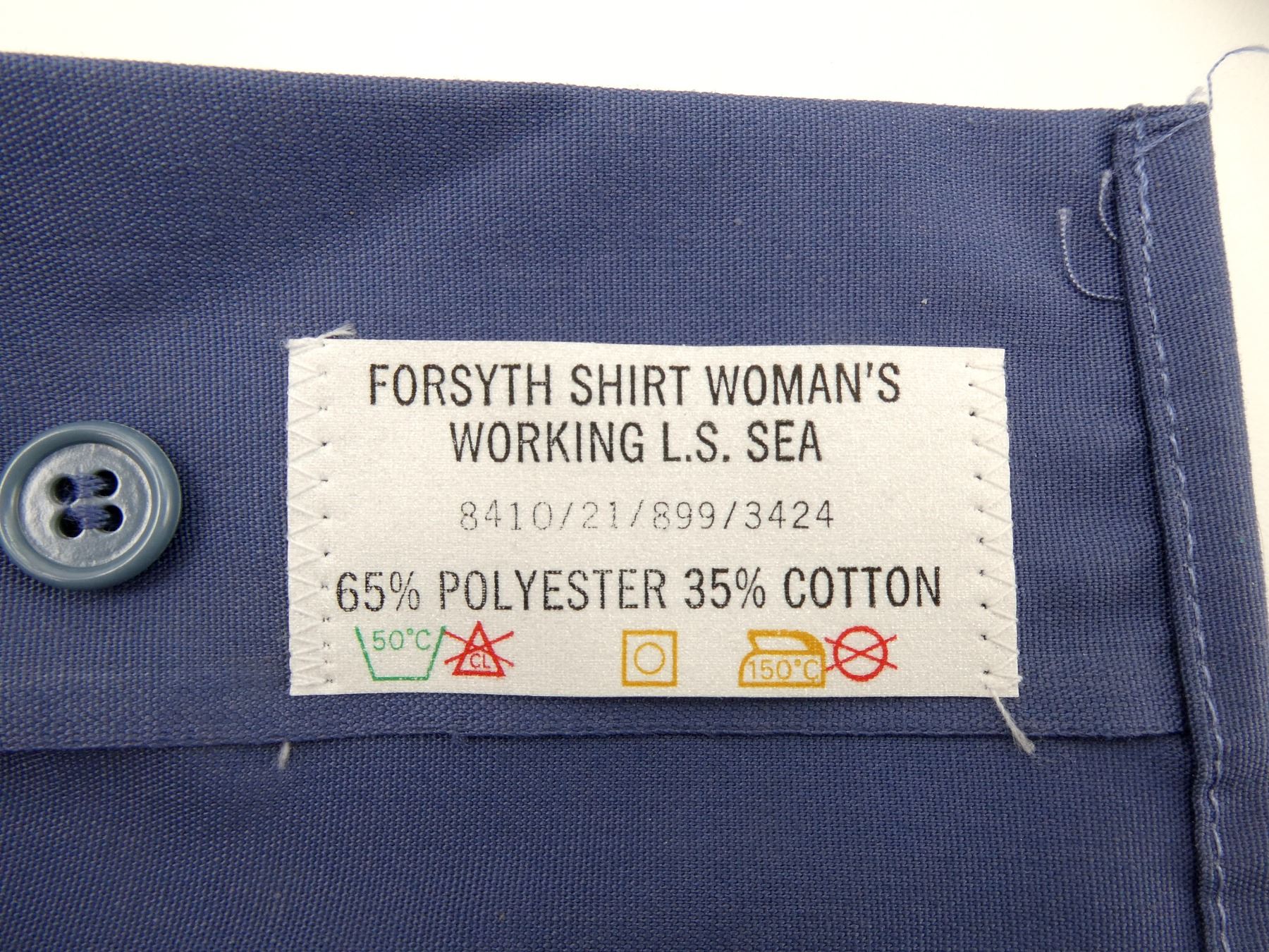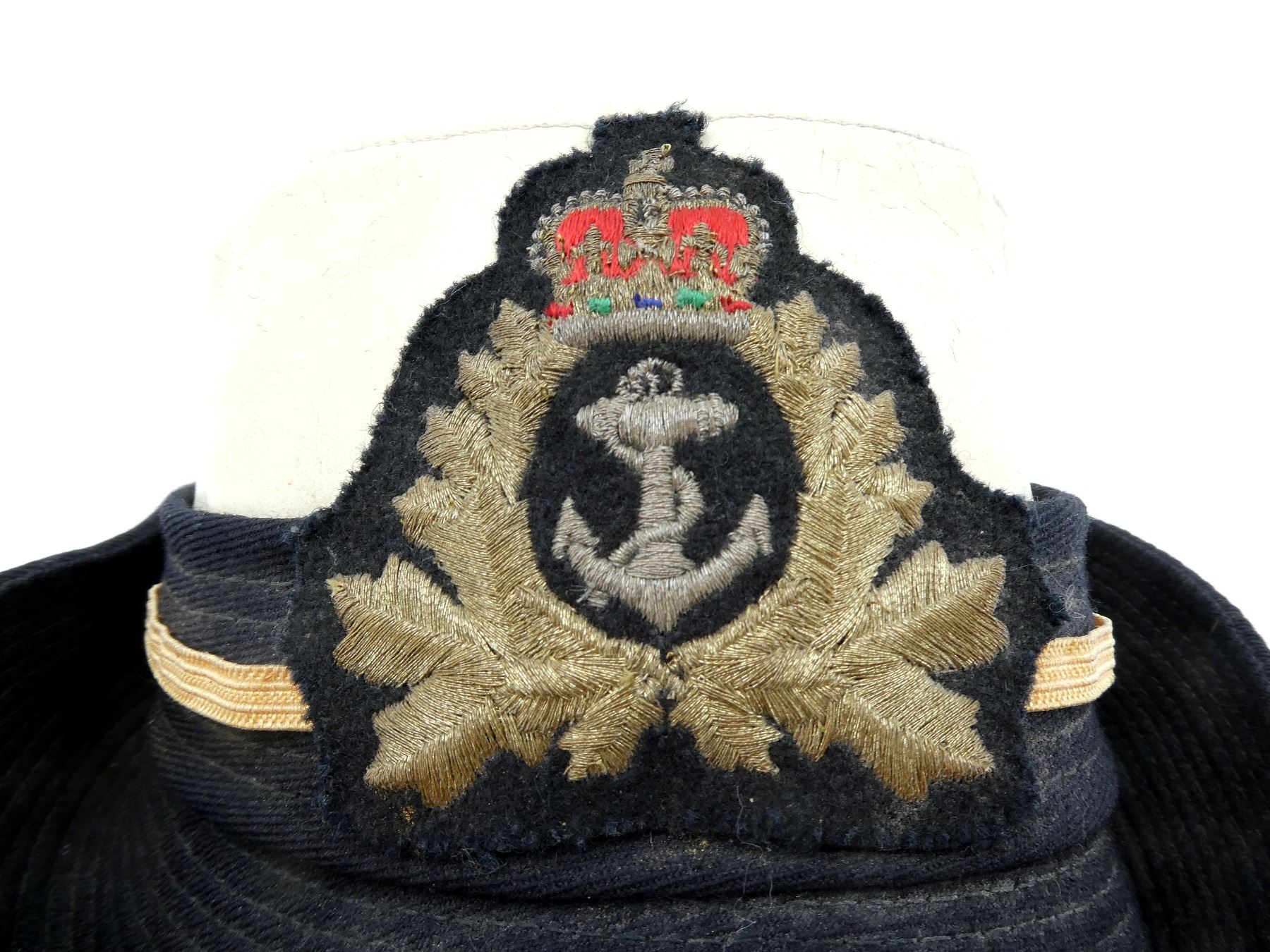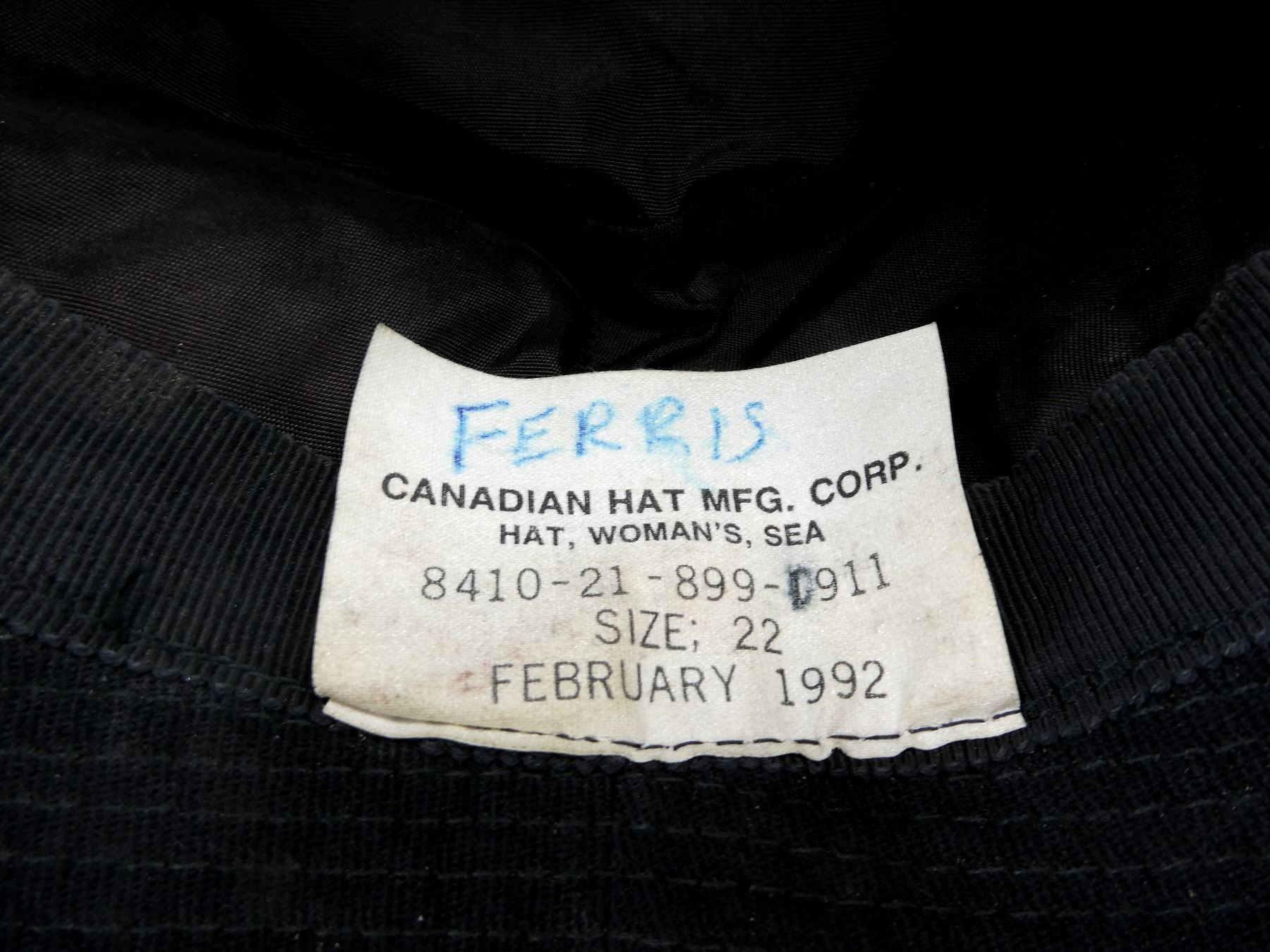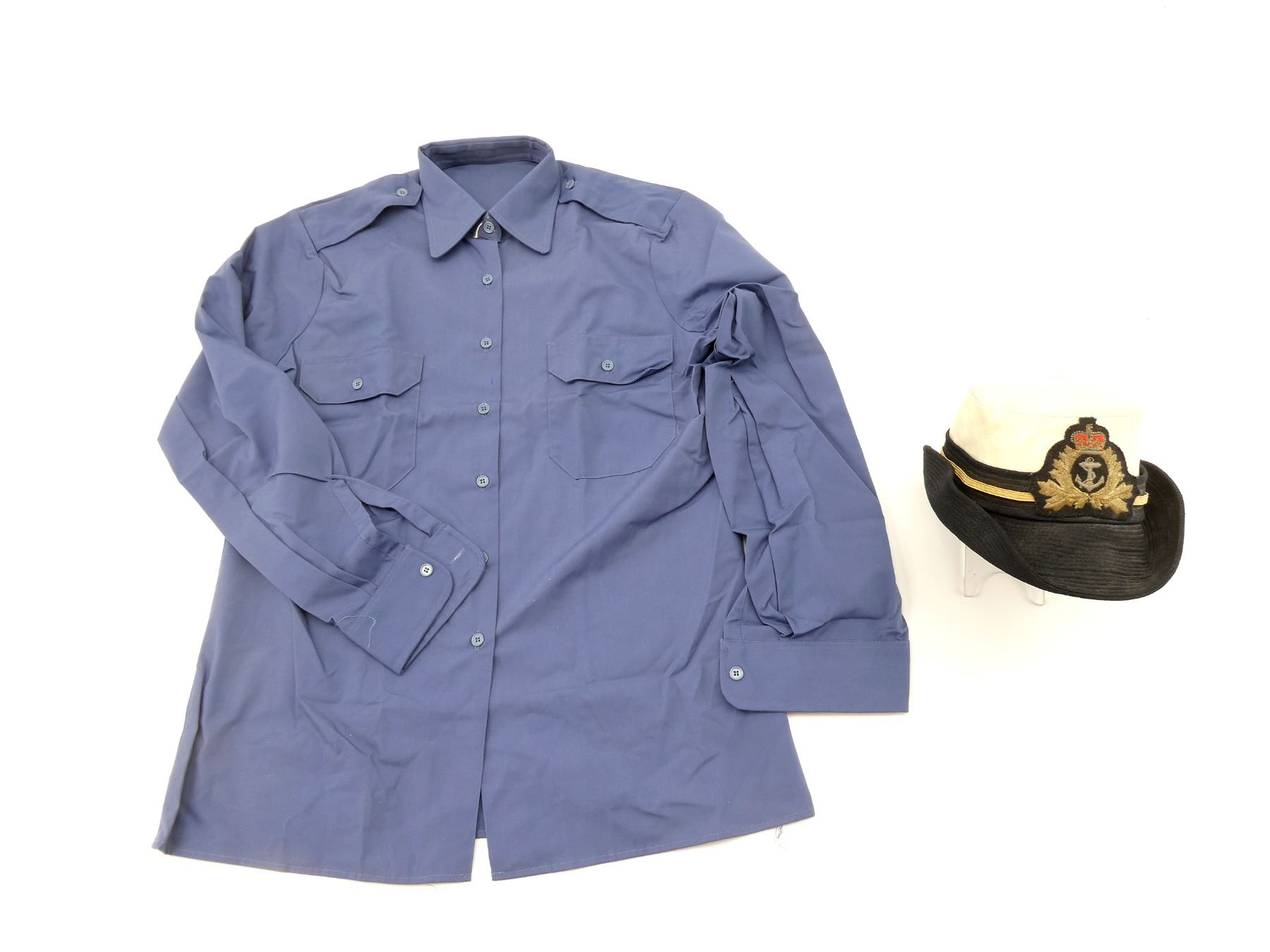 LOT INCLUDES; (1) WHITE LEATHER / CLOTH OFFICERS HAT WITH CLOTH QUEEN'S CROWN NAVAL CAP BADGE, LABEL MARKED: "CANADIAN HAT MFG. CORP., HAT, WOMAN'S, SEA, 8410-21-899-1911, SIZE; 22, FEBRUARY 1992", HAND-WRITTEN NAME: "FERRIS", SHOWS AGE / WEAR & (1) BLUE LONG-SLEEVED SHIRT, LABEL MARKED: "FORSYTH SHIRT WOMAN'S WORKING L.S. SEA, 8410/21/899/3424" ETC., COLLAR MARKED: "M16-32, 11-87", BUTTON-FRONT, APPEARS NEW OLD STOCK. SEE PHOTOS.