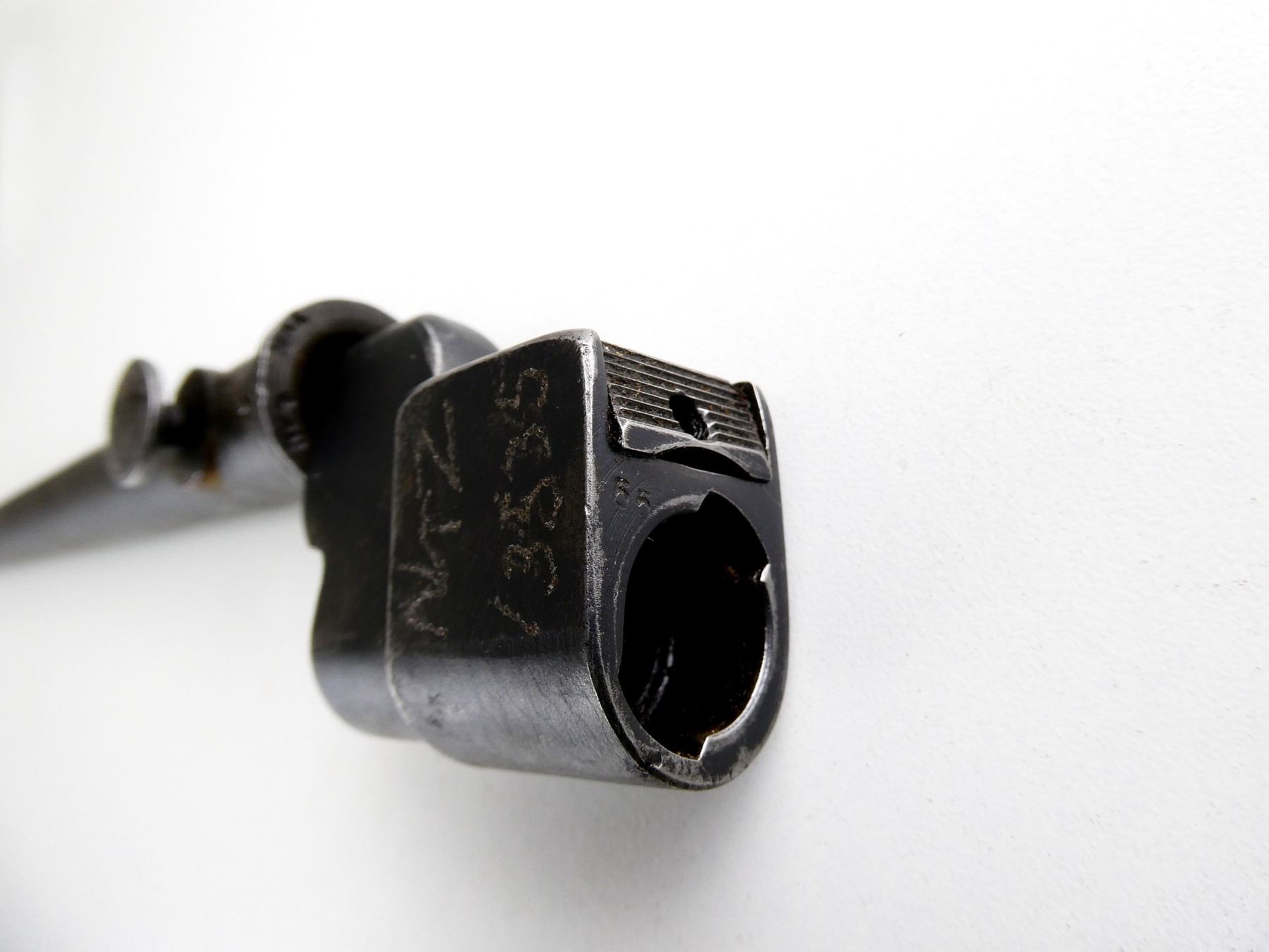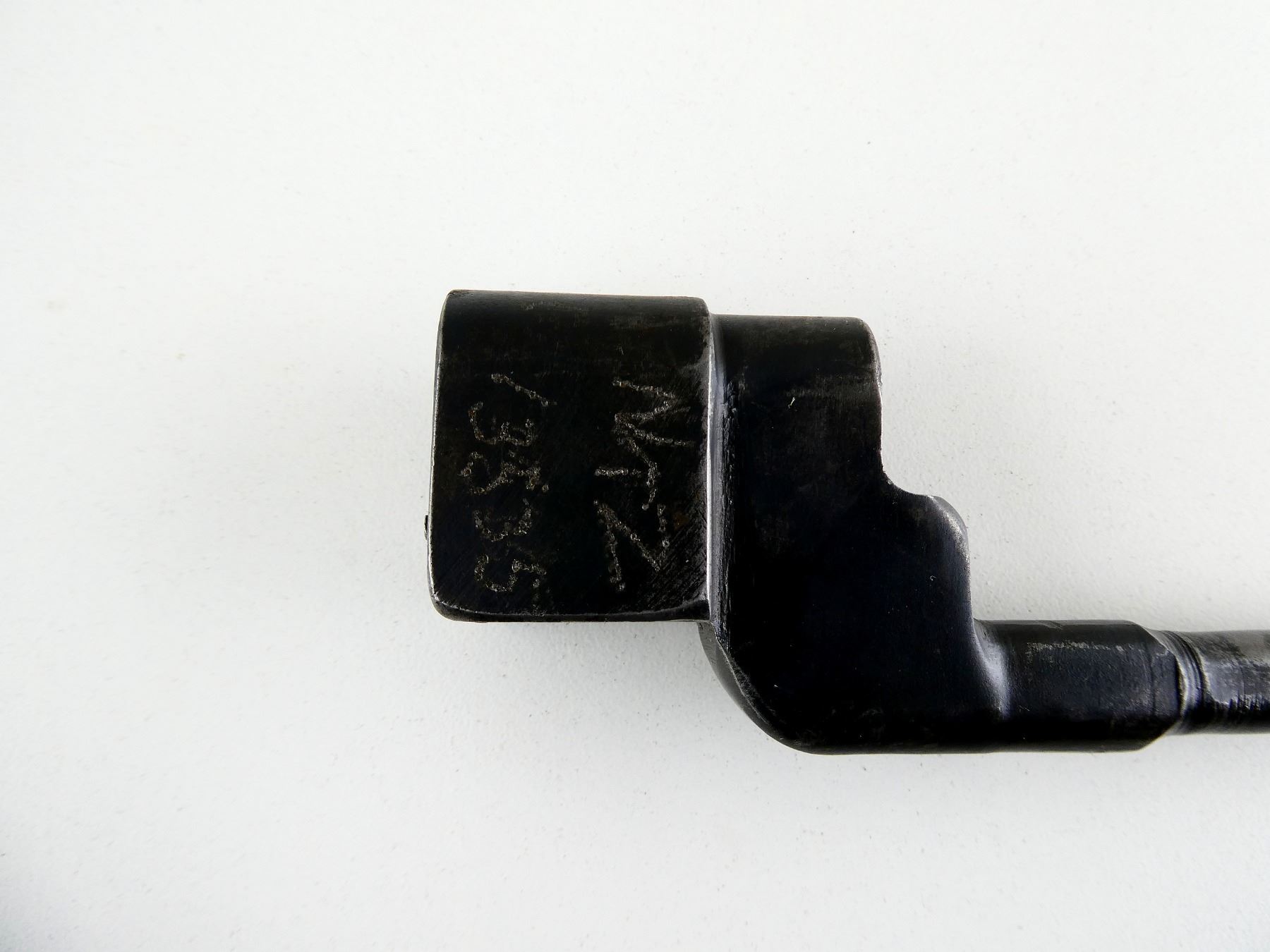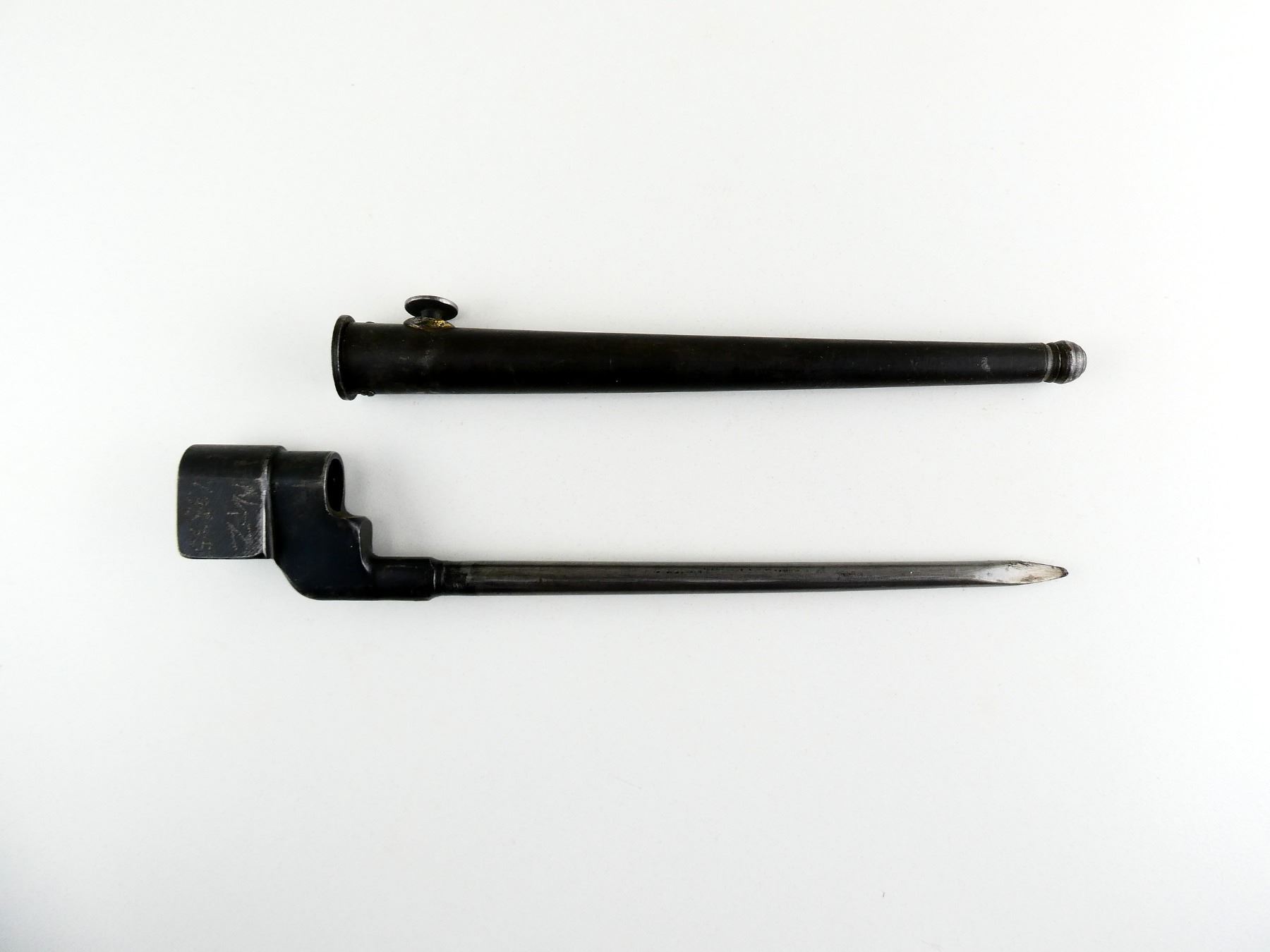 (1) FITS LEE ENFIELD NO.4 MKI & MKII SERIES RIFLES, SOCKET MARKED: "NO4 MKII", "LB (LONG BRANCH)", "55", ETCHED: "N", BROAD ARROW, "Z", "/3535", METAL MKI SCABBARD, THROAT MARKED: "NO4 MK1", BROAD ARROW WITH VARIOUS OTHER FAINT / UN-CLEAR MARKINGS, BLADE APPROX. 8" & OVERALL LENGTH APPROX. 9 7/8". SEE PHOTOS.