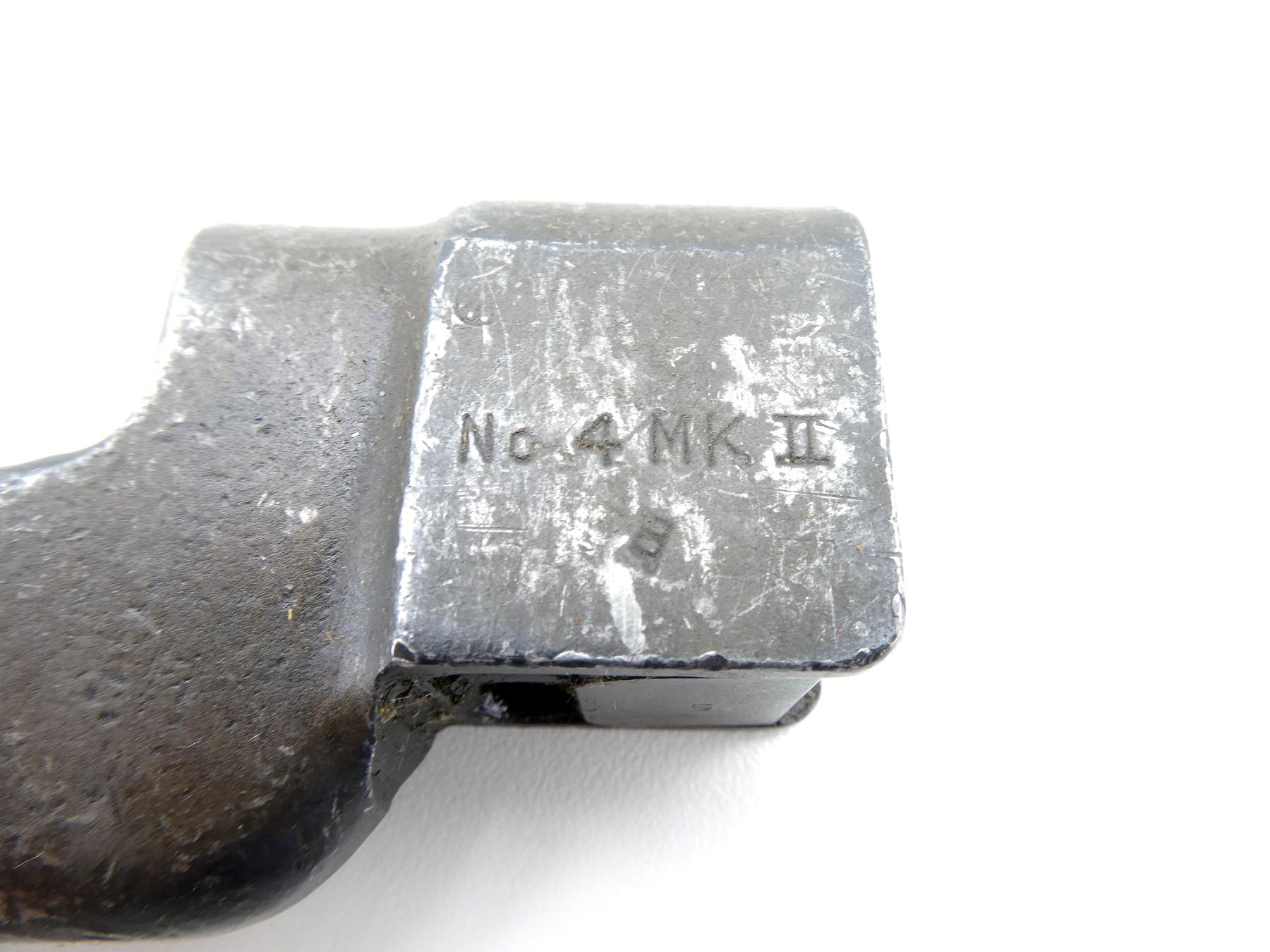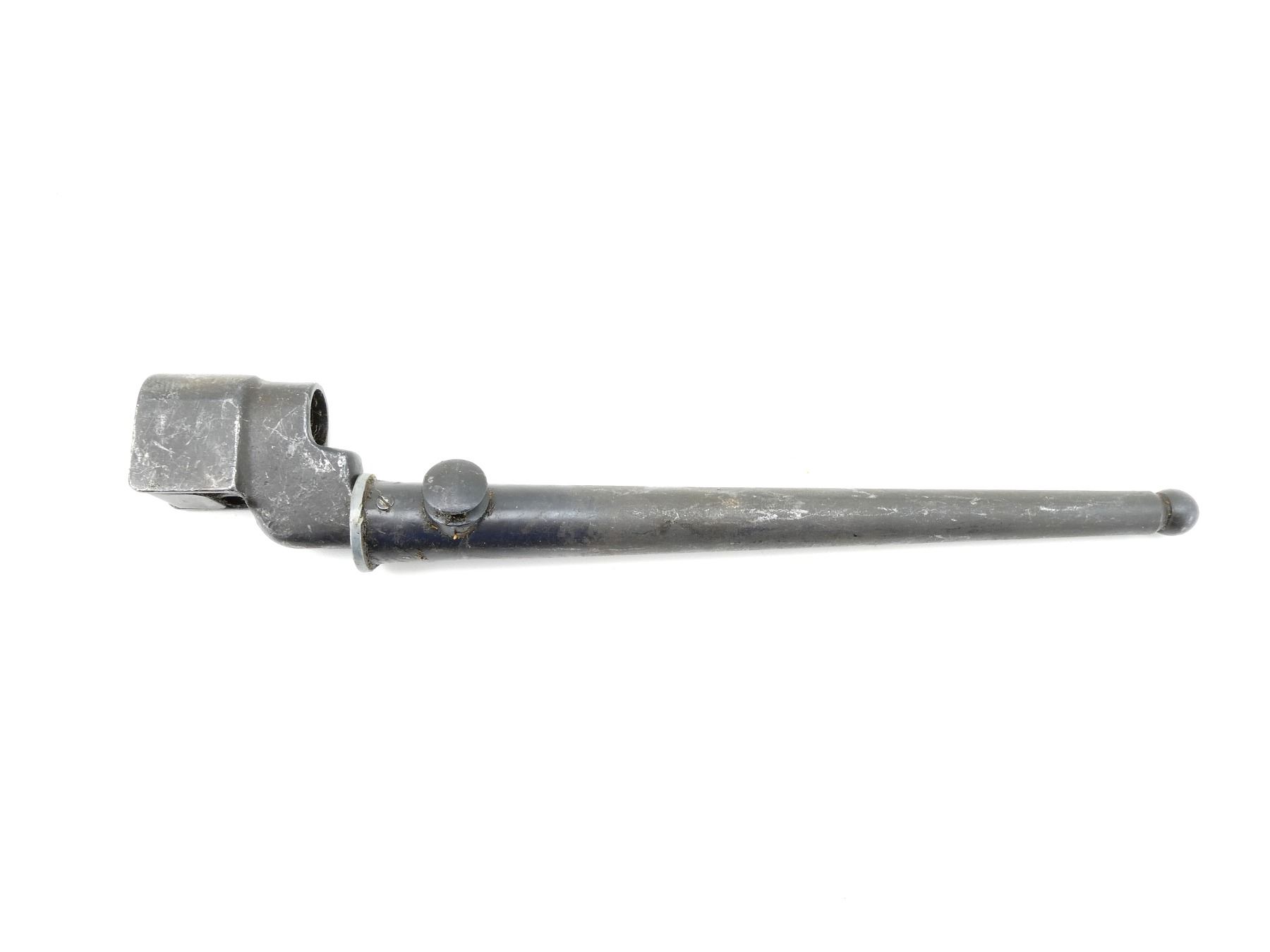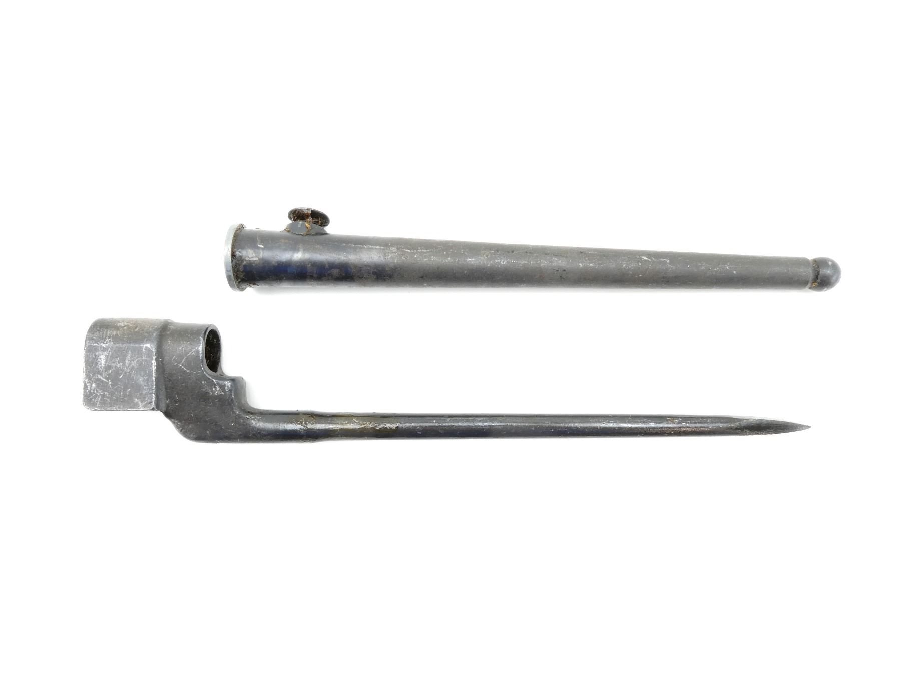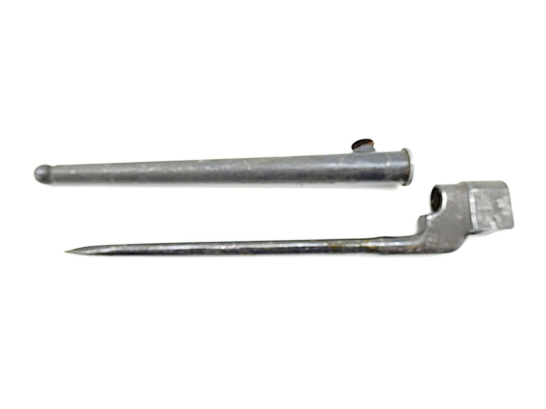 (1) FITS LEE ENFIELD NO.4 MKI & MKII SERIES RIFLES, SOCKET MARKED: "NO 4 MK II", "LB (LONG BRANCH)", "S", METAL MKI SCABBARD, THROAT MARKED: "NO4 MKI S286", BROAD ARROW, PROOF MARK, BLADE APPROX. 7 7/8" & OVERALL LENGTH APPROX. 9 7/8". SEE PHOTOS.