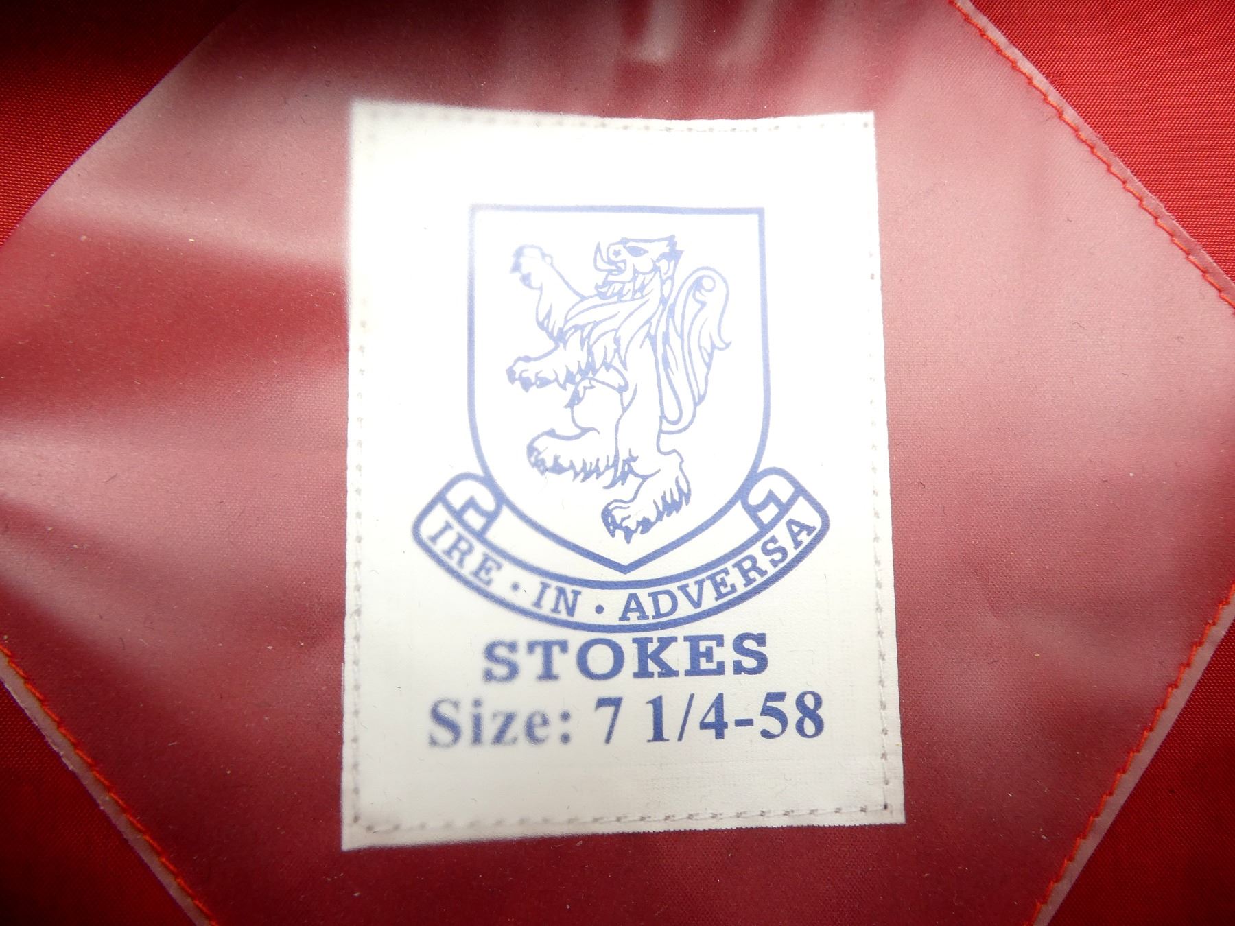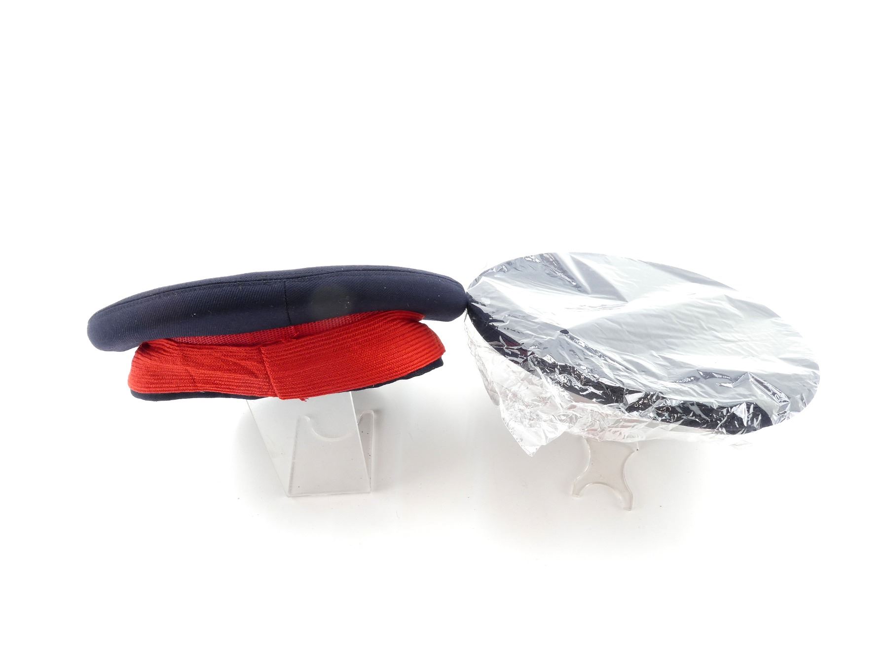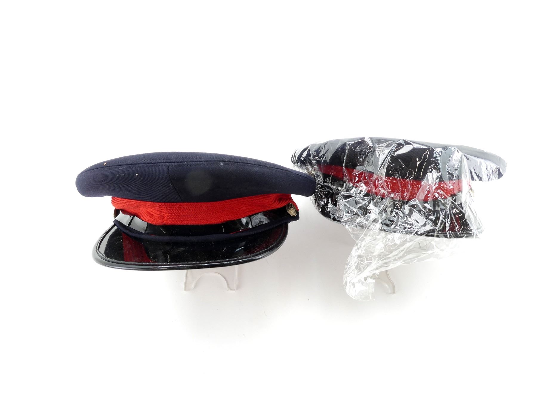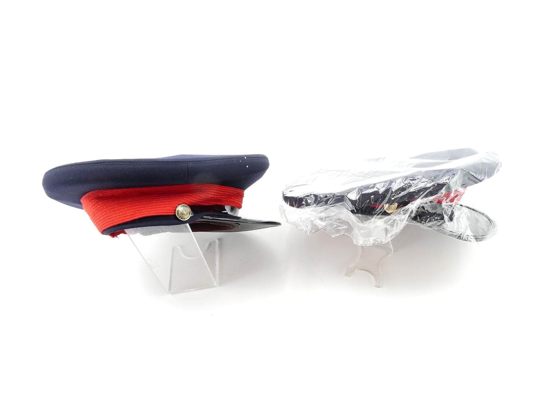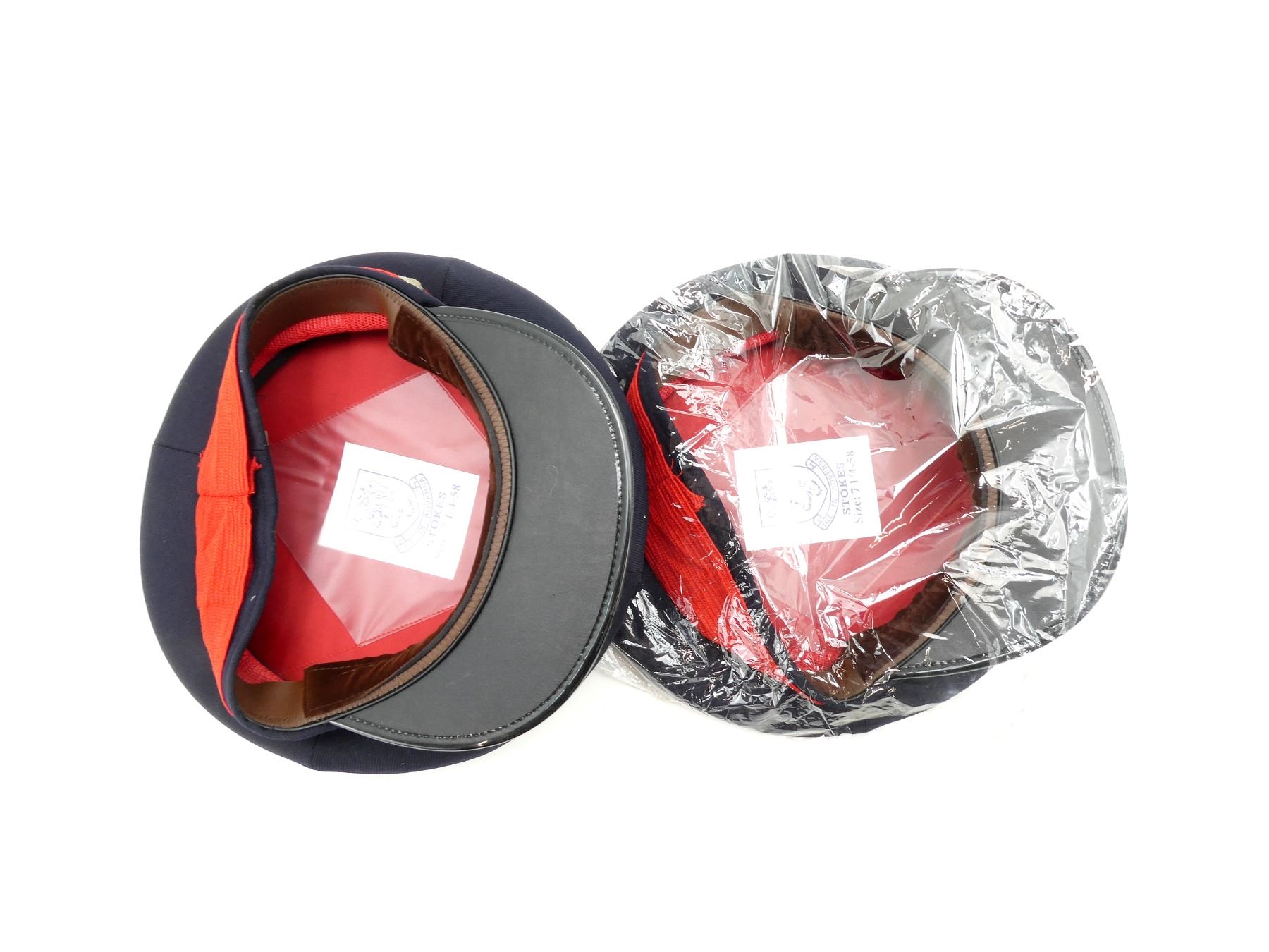 LOT INCLUDES; (2) NAVY BLUE WOOL PEAKED CAPS WITH RED BANDS, LABEL INSIDE MARKED: "STOKES, SIZE: 7 1/4-58" ETC., BRASS BUTTONS MARKED: "POLICE SERVICE" WITH QUEEN'S CROWN, APPEARS NEW OLD STOCK, IN PLASTIC PACKAGING. SEE PHOTOS.