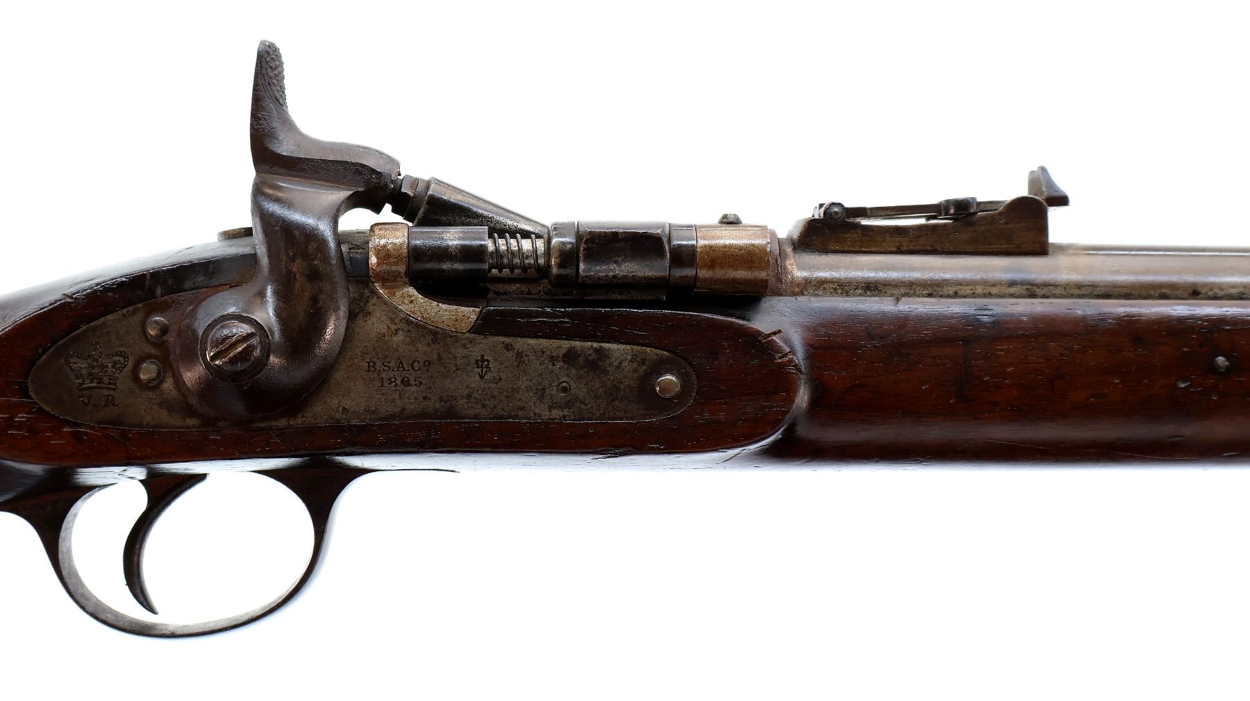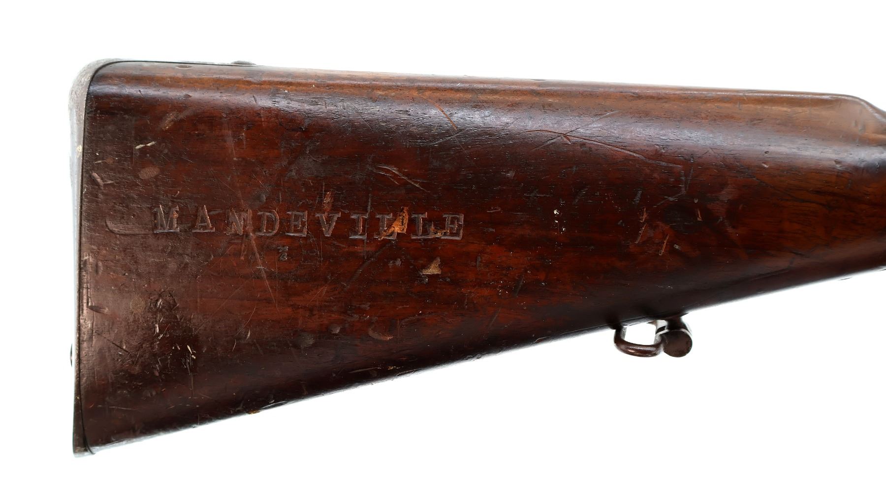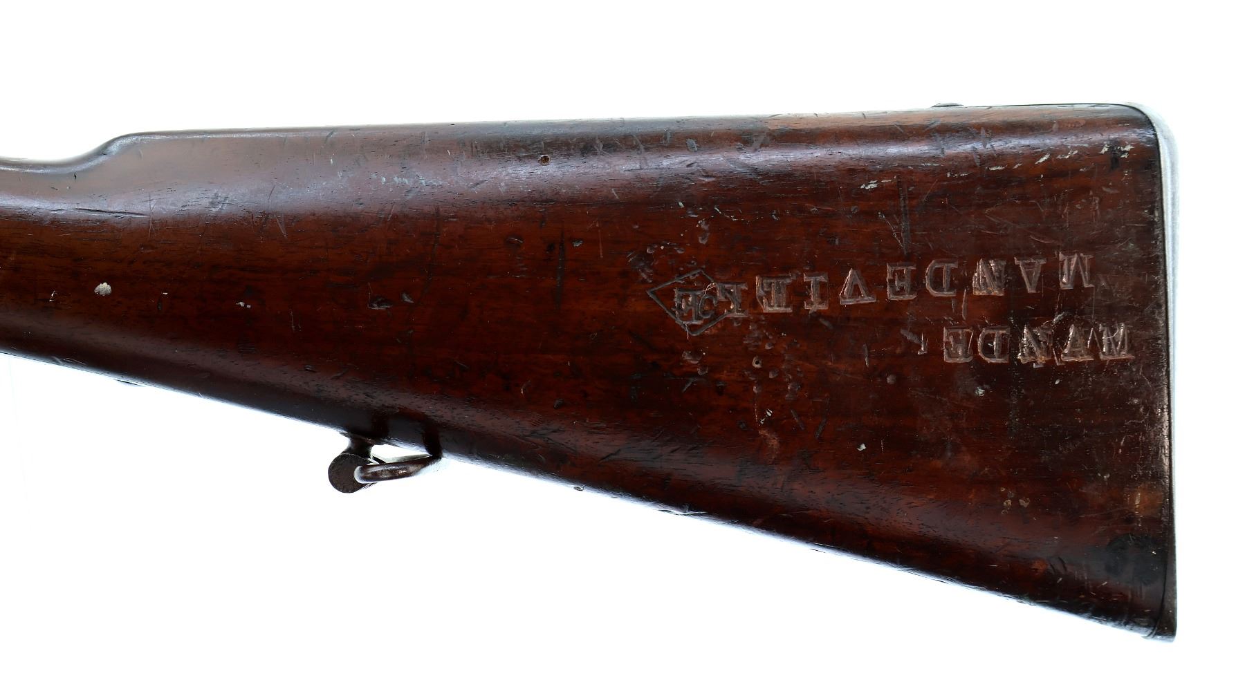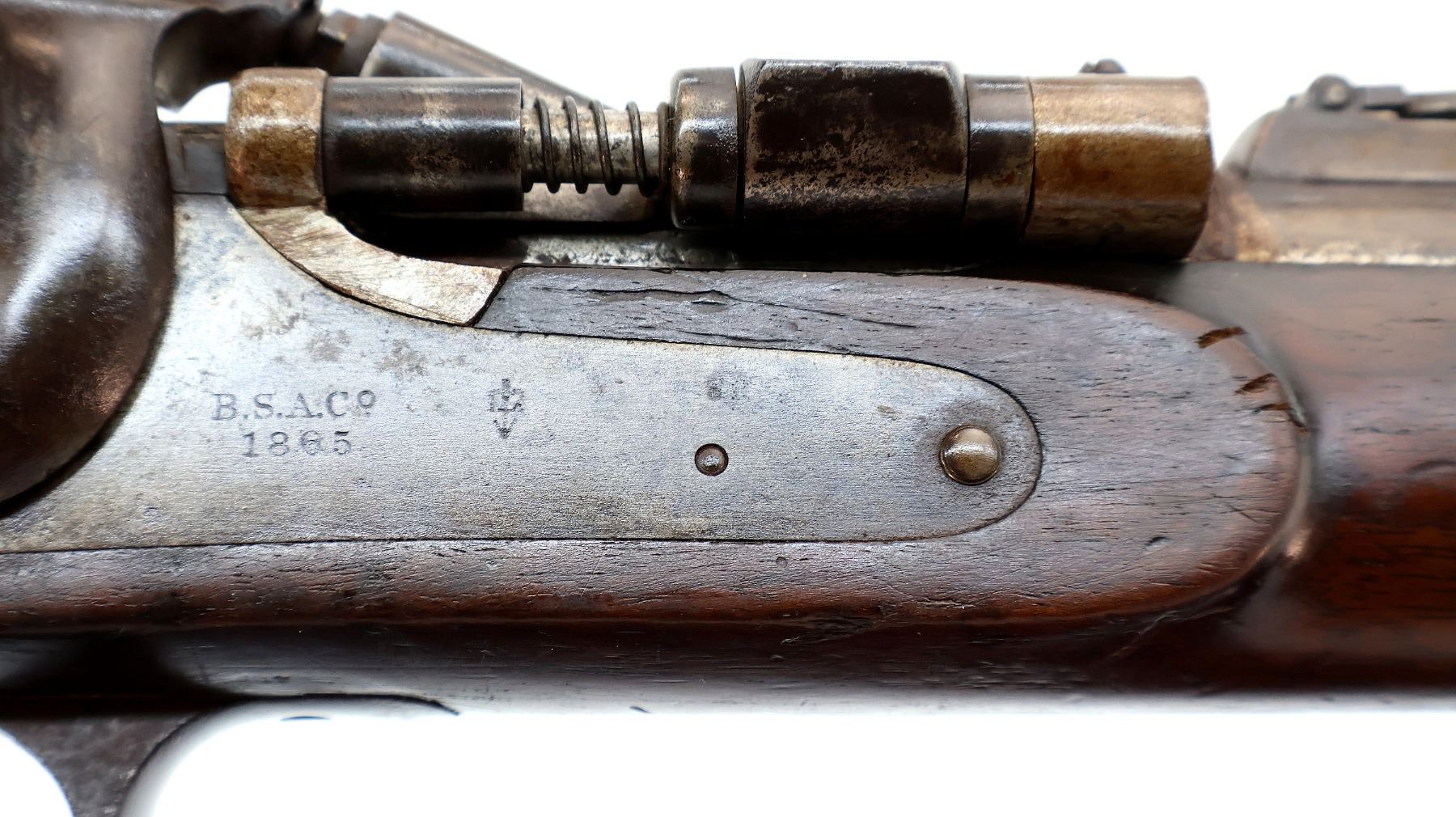 Main Description: Manufactured by BSA Co 1865, Blade front sight with ramp, adjustable u notched ladder rear sight, lock marked Crown VR with checkered spur hammer that functions, missing nipple protector. One piece full military wood stock, straight grip, smooth steel butt plate, tang marked 30 497 (Wellington Battalion of Rifles), right side of stock stamped Mandeville, left side stamped Mandeville/Mande with DC in a diamond indicating Dominion of Canada issue. Rear sling swivel only, bayonet lug, missing front band and ramrod.