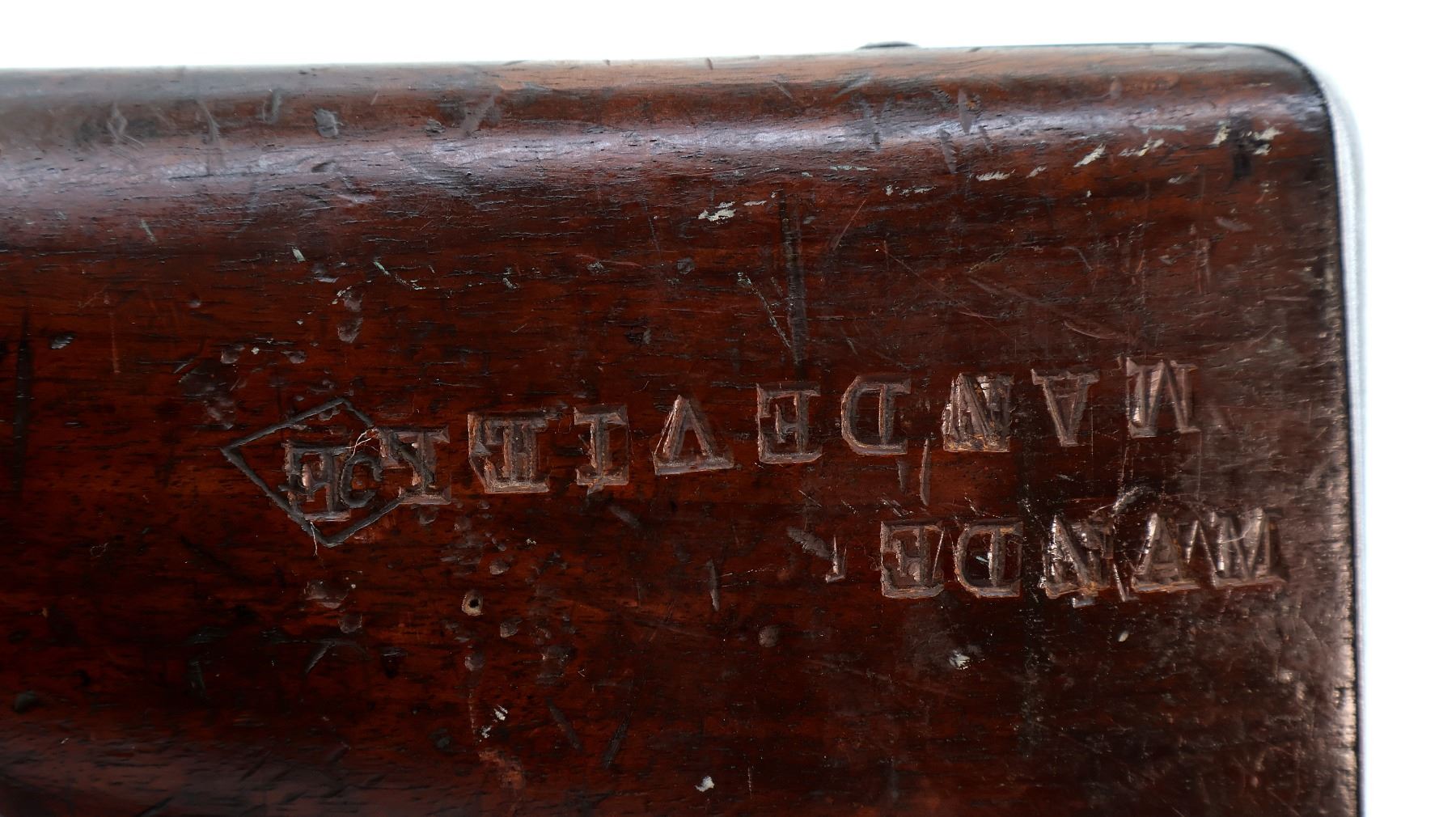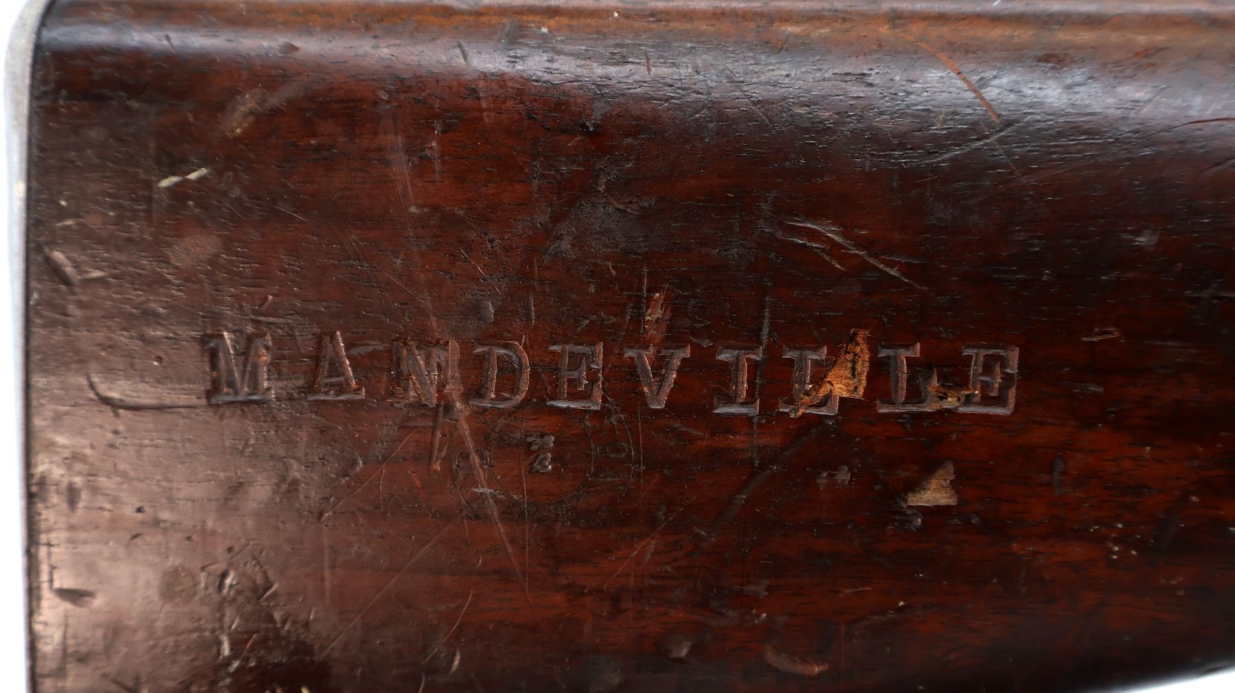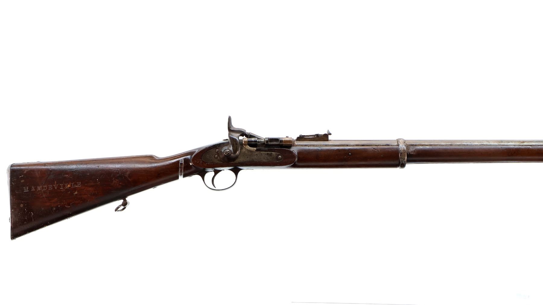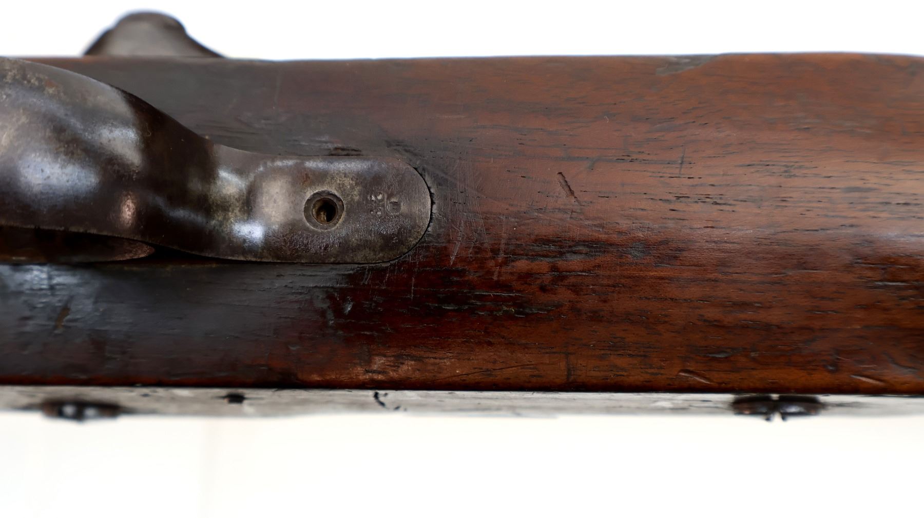Main Description: Manufactured by BSA Co 1865, Blade front sight with ramp, adjustable u notched ladder rear sight, lock marked Crown VR with checkered spur hammer that functions, missing nipple protector. One piece full military wood stock, straight grip, smooth steel butt plate, tang marked 30 497 (Wellington Battalion of Rifles), right side of stock stamped Mandeville, left side stamped Mandeville/Mande with DC in a diamond indicating Dominion of Canada issue. Rear sling swivel only, bayonet lug, missing front band and ramrod.