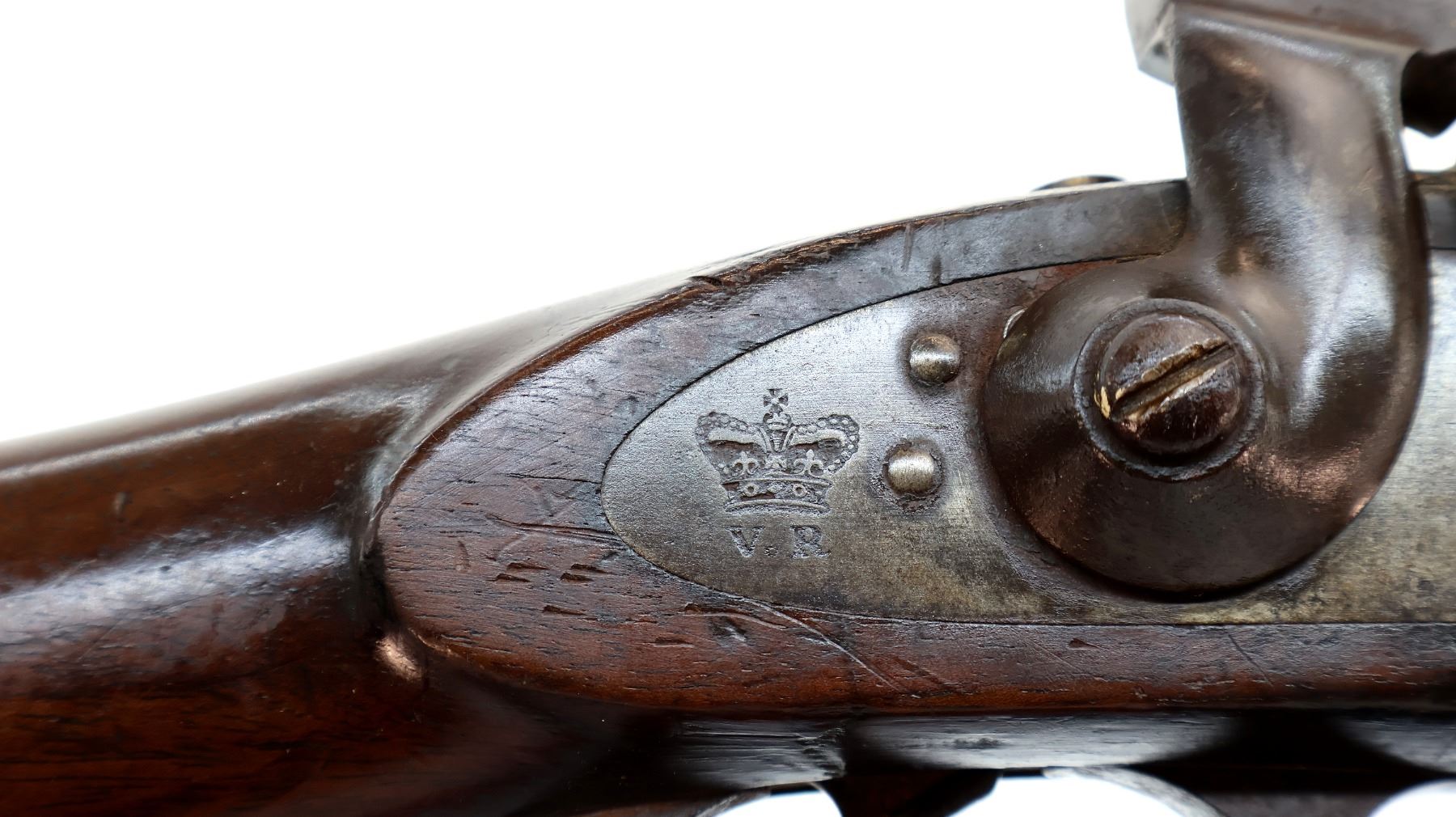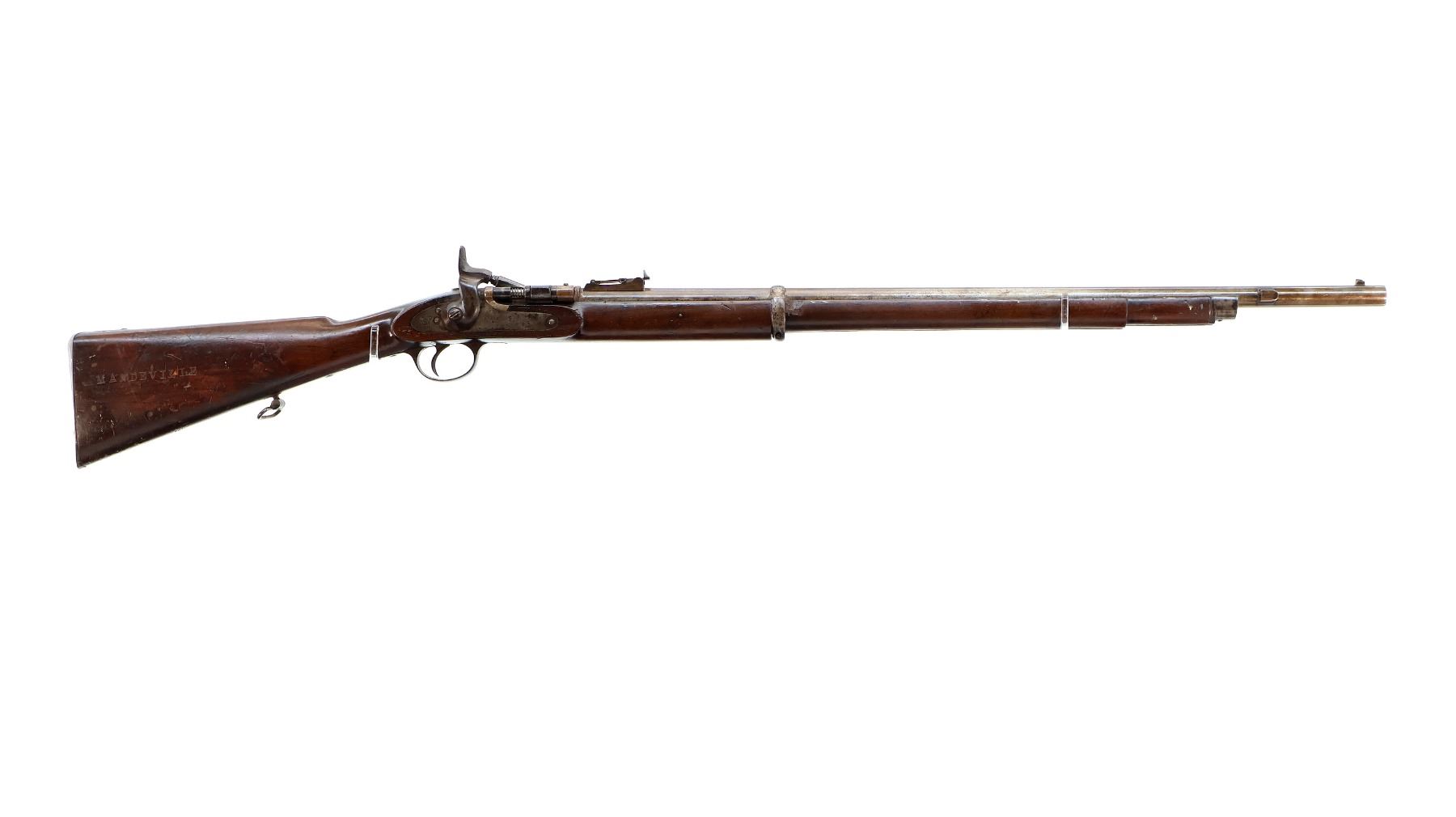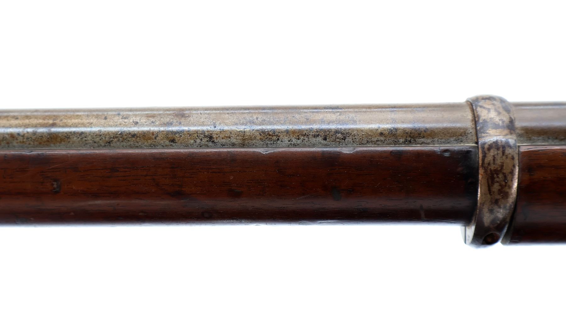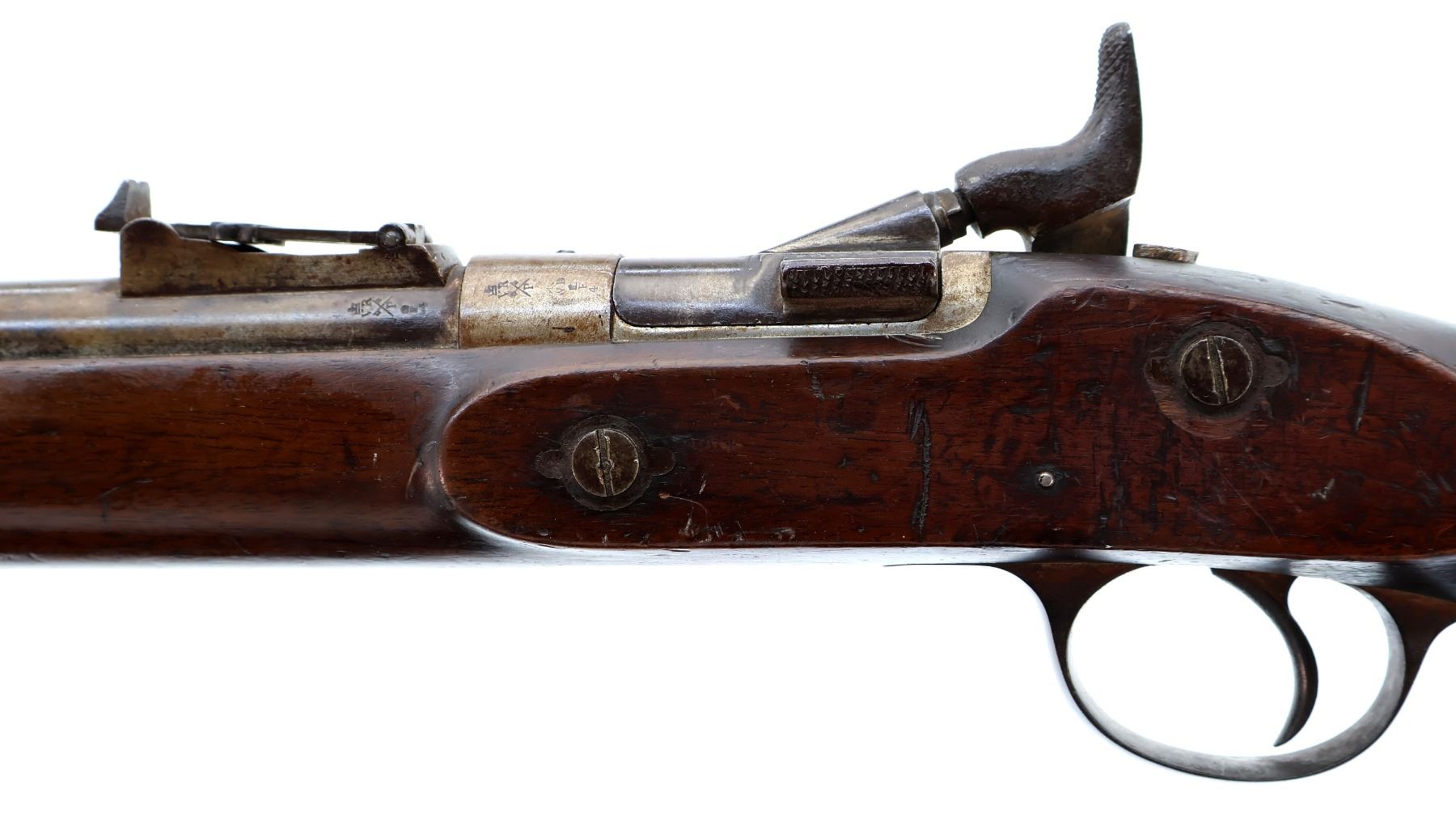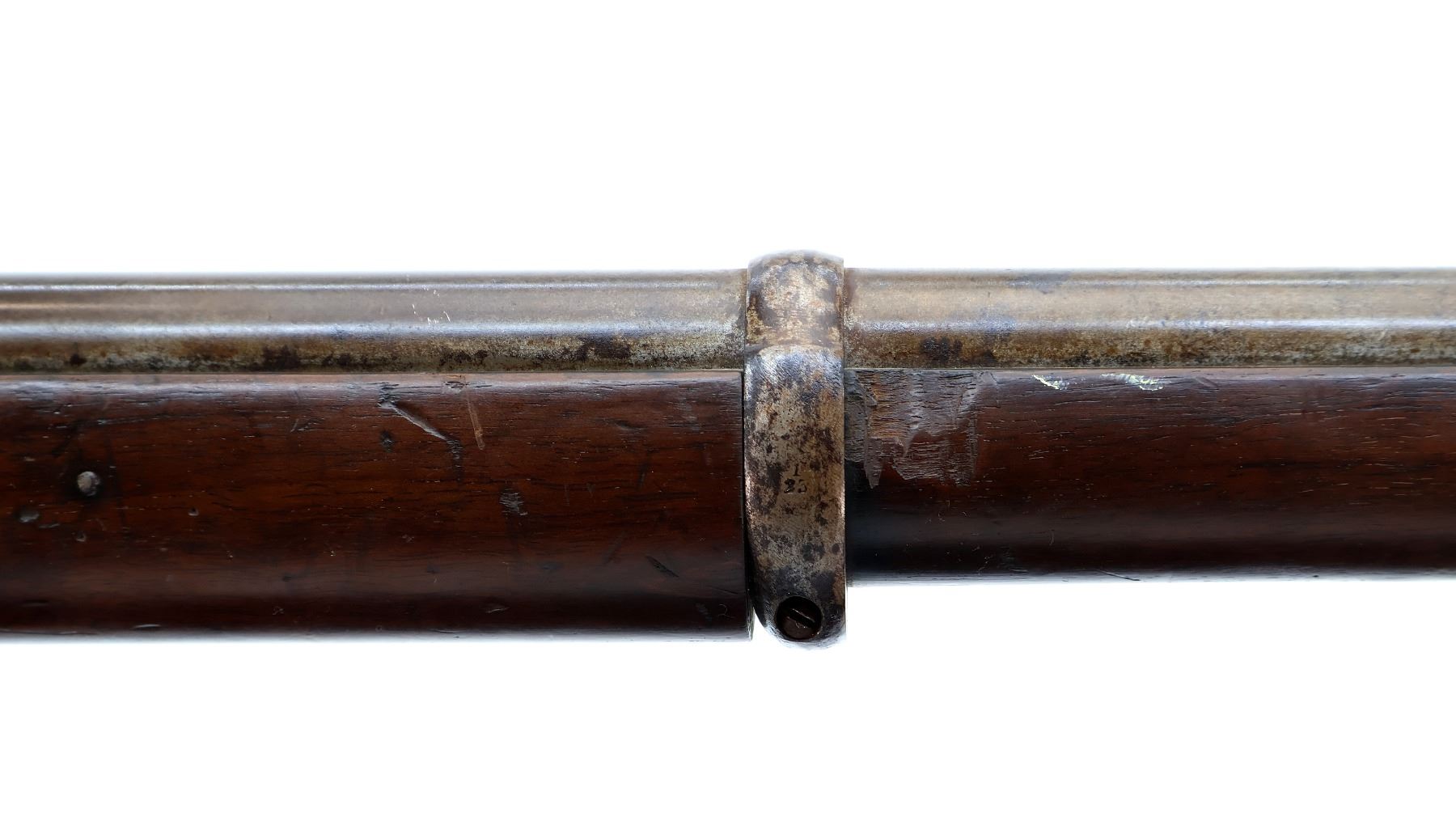 Main Description: Manufactured by BSA Co 1865, Blade front sight with ramp, adjustable u notched ladder rear sight, lock marked Crown VR with checkered spur hammer that functions, missing nipple protector. One piece full military wood stock, straight grip, smooth steel butt plate, tang marked 30 497 (Wellington Battalion of Rifles), right side of stock stamped Mandeville, left side stamped Mandeville/Mande with DC in a diamond indicating Dominion of Canada issue. Rear sling swivel only, bayonet lug, missing front band and ramrod.