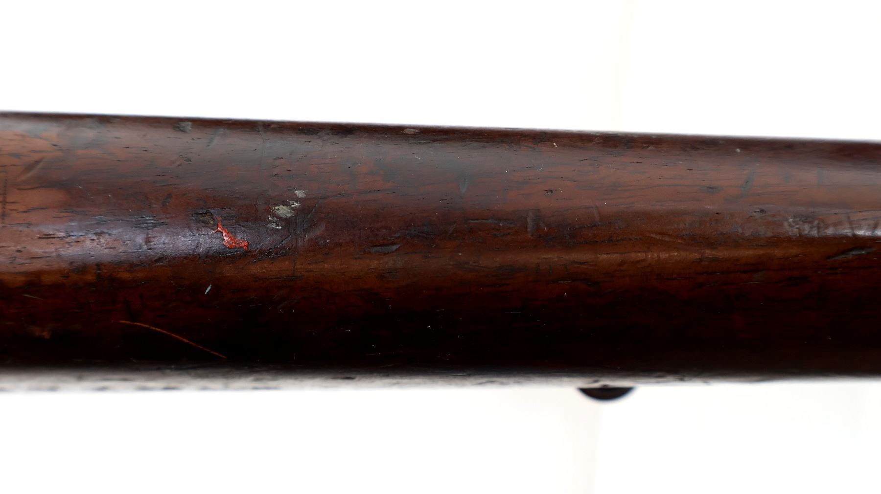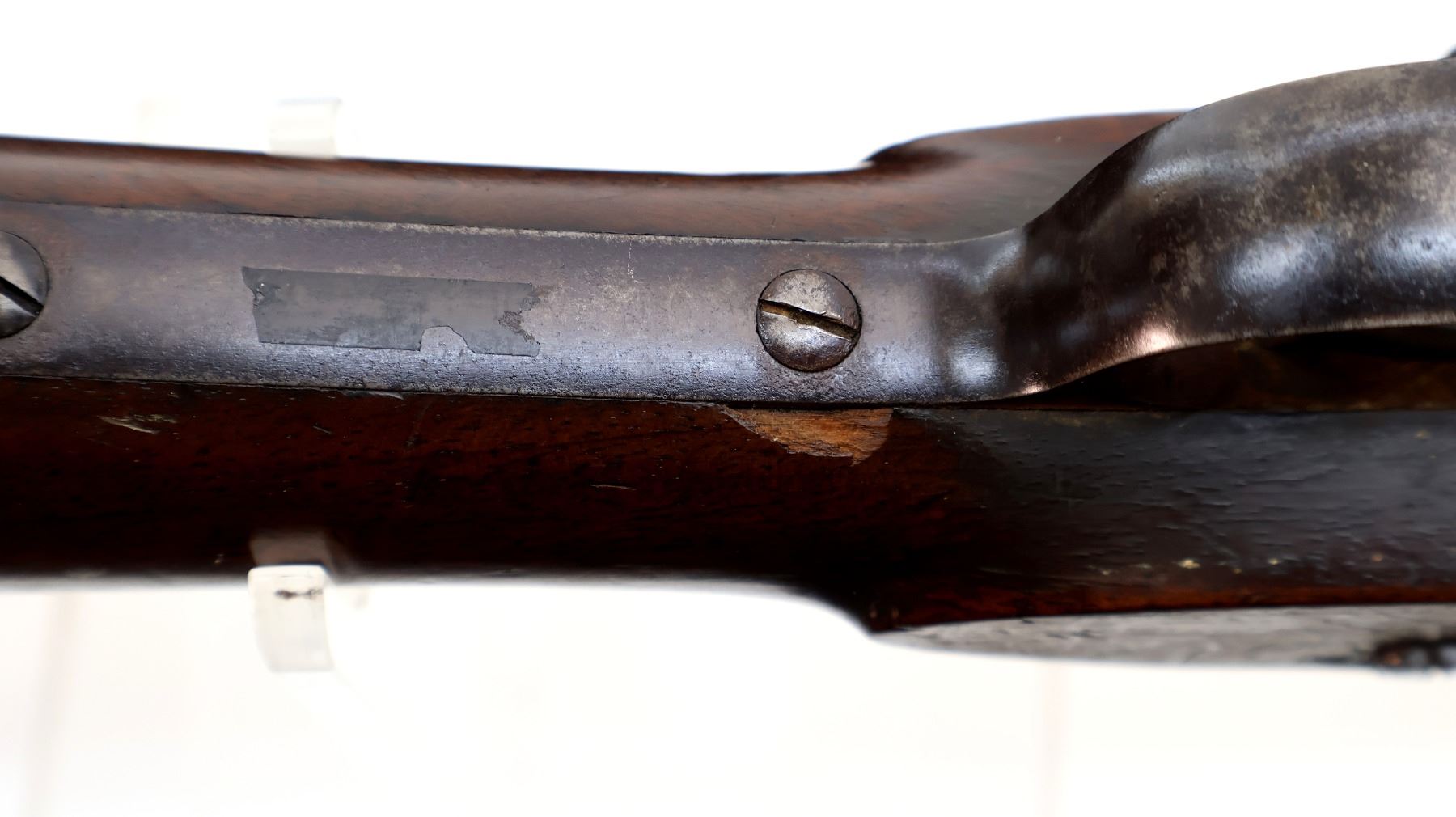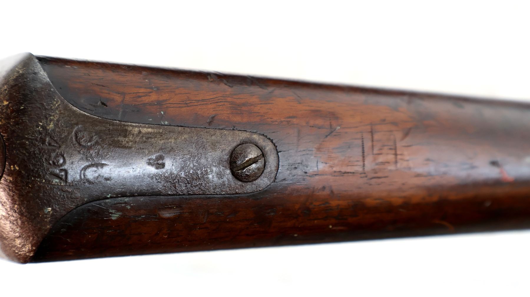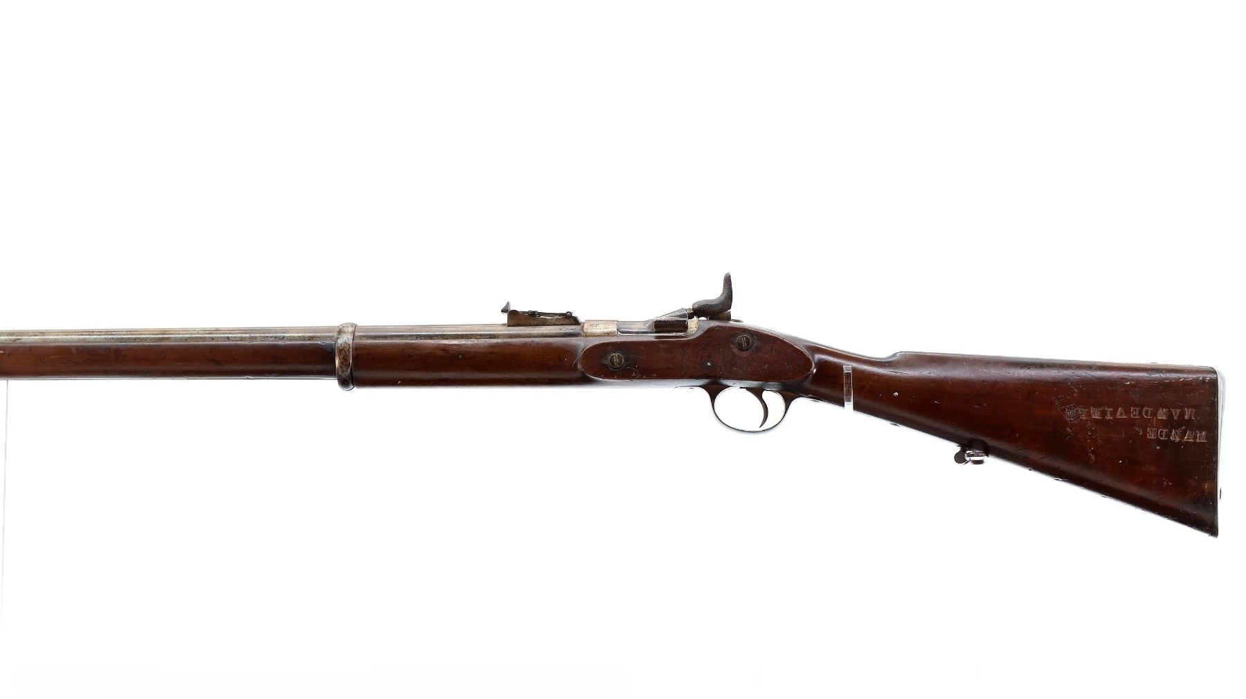 Main Description: Manufactured by BSA Co 1865, Blade front sight with ramp, adjustable u notched ladder rear sight, lock marked Crown VR with checkered spur hammer that functions, missing nipple protector. One piece full military wood stock, straight grip, smooth steel butt plate, tang marked 30 497 (Wellington Battalion of Rifles), right side of stock stamped Mandeville, left side stamped Mandeville/Mande with DC in a diamond indicating Dominion of Canada issue. Rear sling swivel only, bayonet lug, missing front band and ramrod.