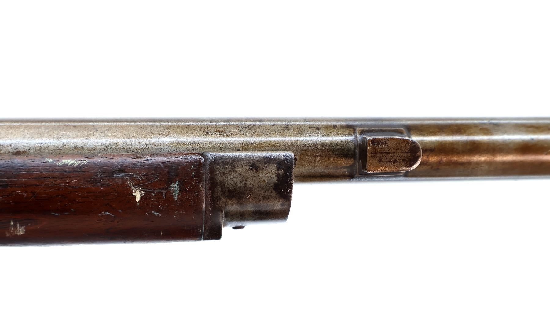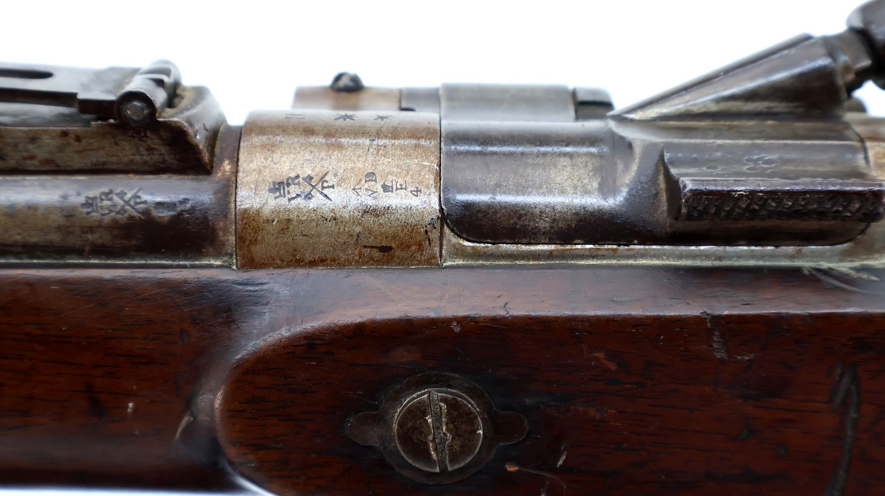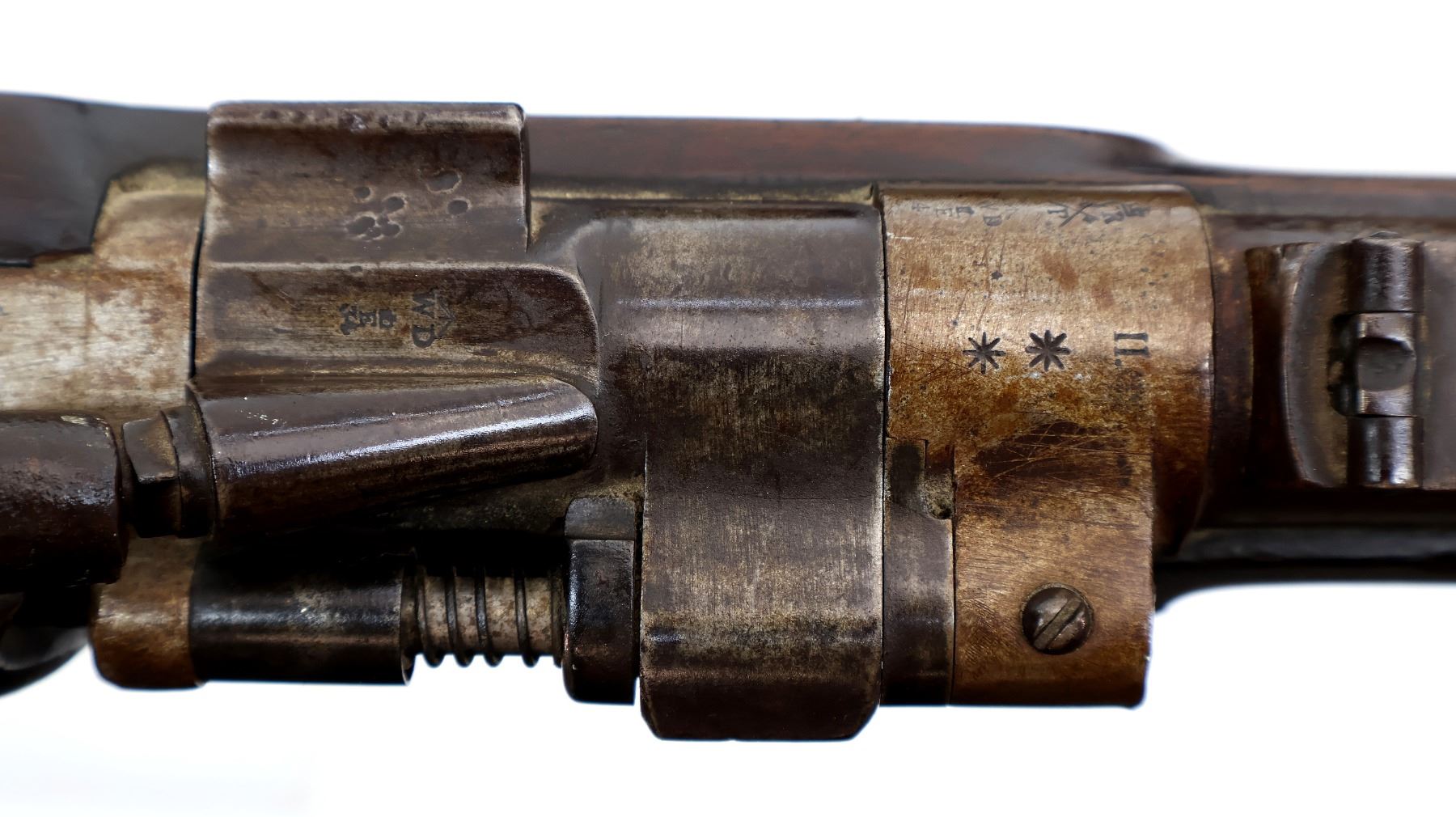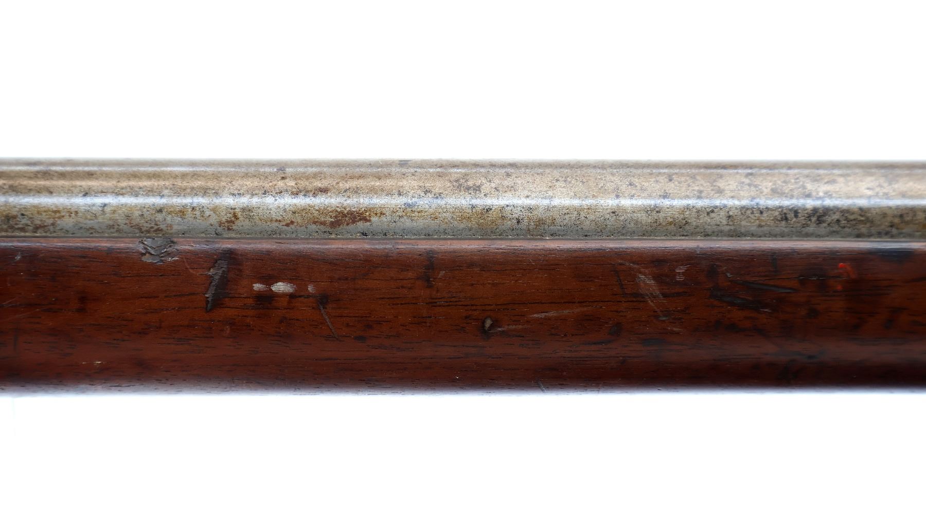 Main Description: Manufactured by BSA Co 1865, Blade front sight with ramp, adjustable u notched ladder rear sight, lock marked Crown VR with checkered spur hammer that functions, missing nipple protector. One piece full military wood stock, straight grip, smooth steel butt plate, tang marked 30 497 (Wellington Battalion of Rifles), right side of stock stamped Mandeville, left side stamped Mandeville/Mande with DC in a diamond indicating Dominion of Canada issue. Rear sling swivel only, bayonet lug, missing front band and ramrod.