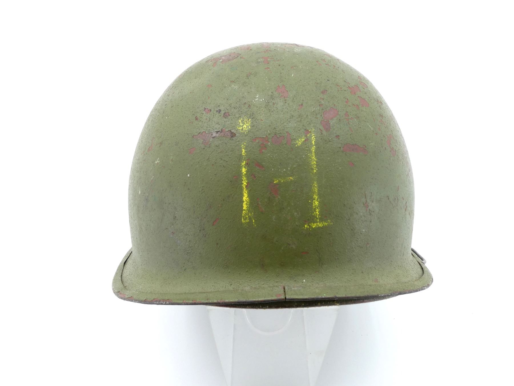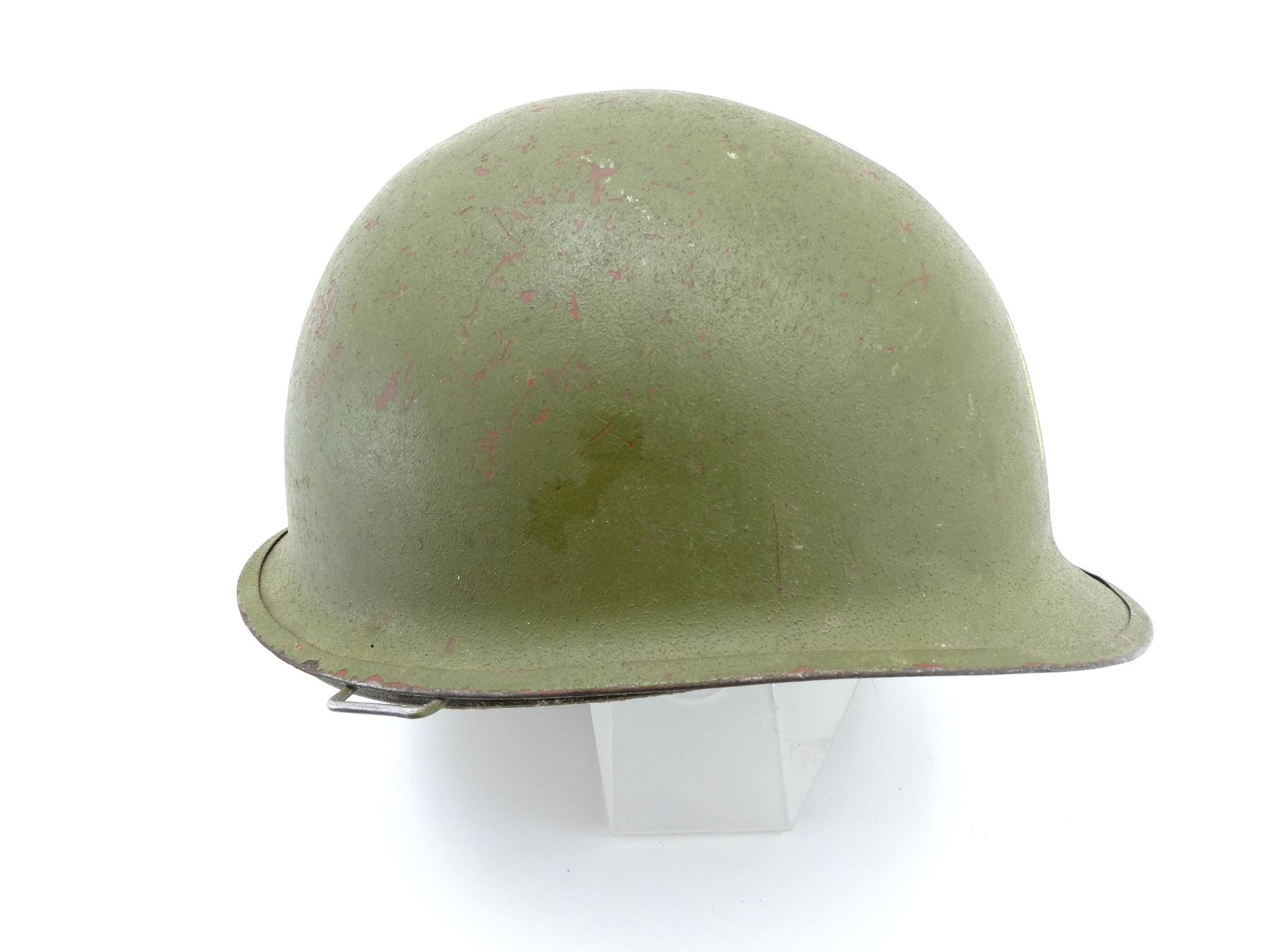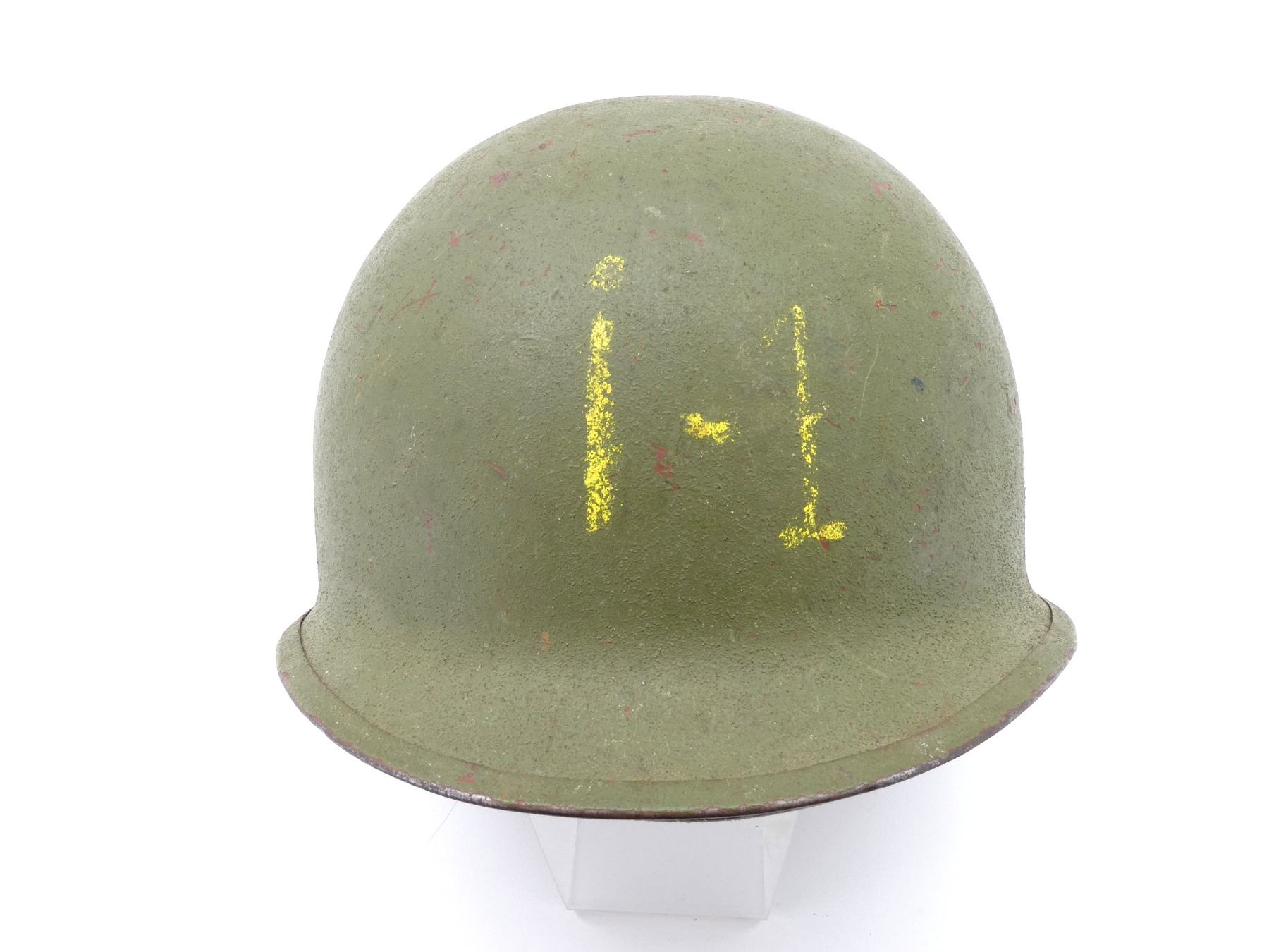 (1) GREEN PAINTED STEEL SHELL, SHELL MARKED: "9633" NEAR FRONT, FIBER HELMET LINER WITH GREEN CANVAS & BROWN LEATHER HEAD LINER, MISSING CHIN STRAP, GREEN CANVAS NECKBAND, VARIOUS FAINT / UN-CLEAR MARKINGS ON HEADBAND. SEE PHOTOS.
