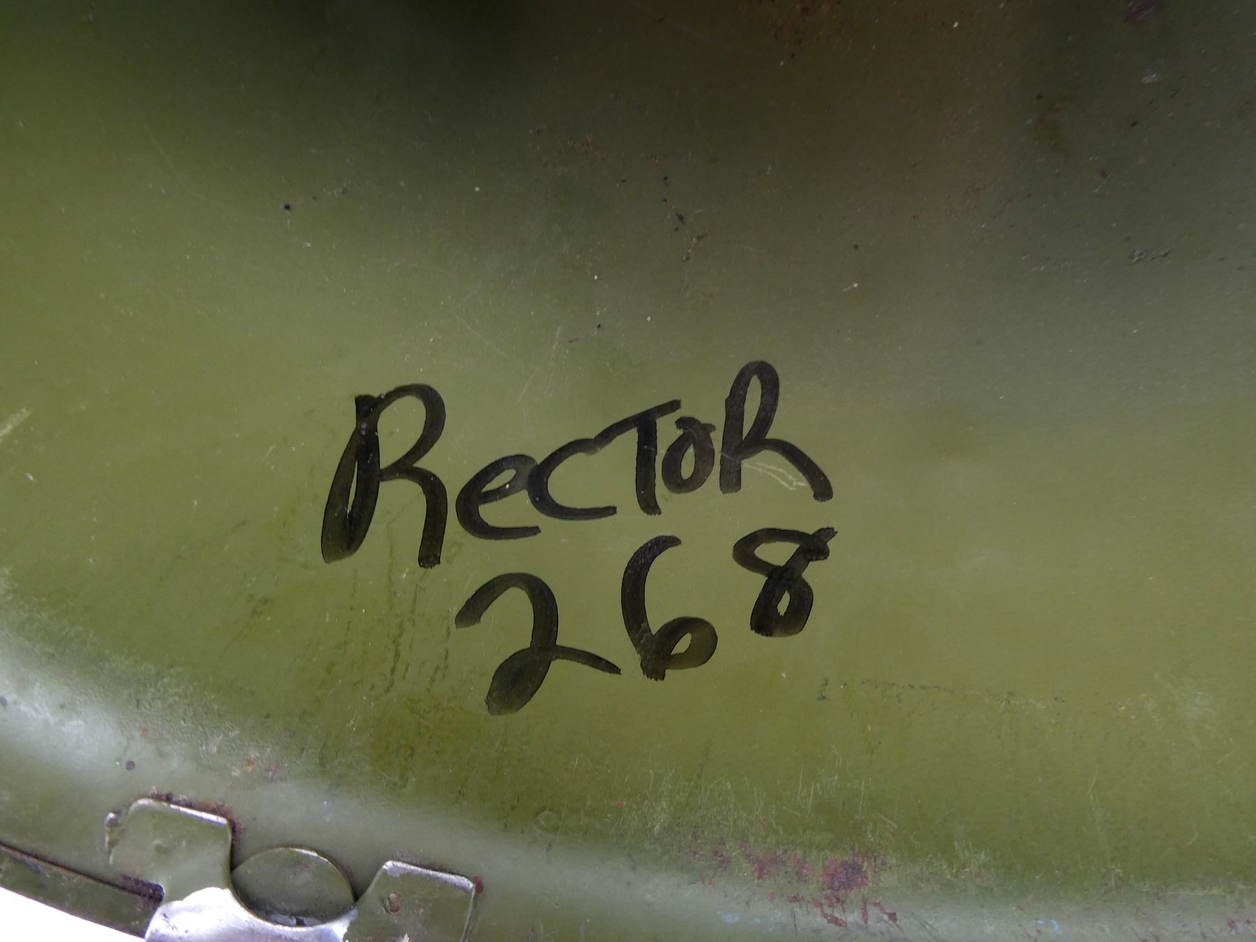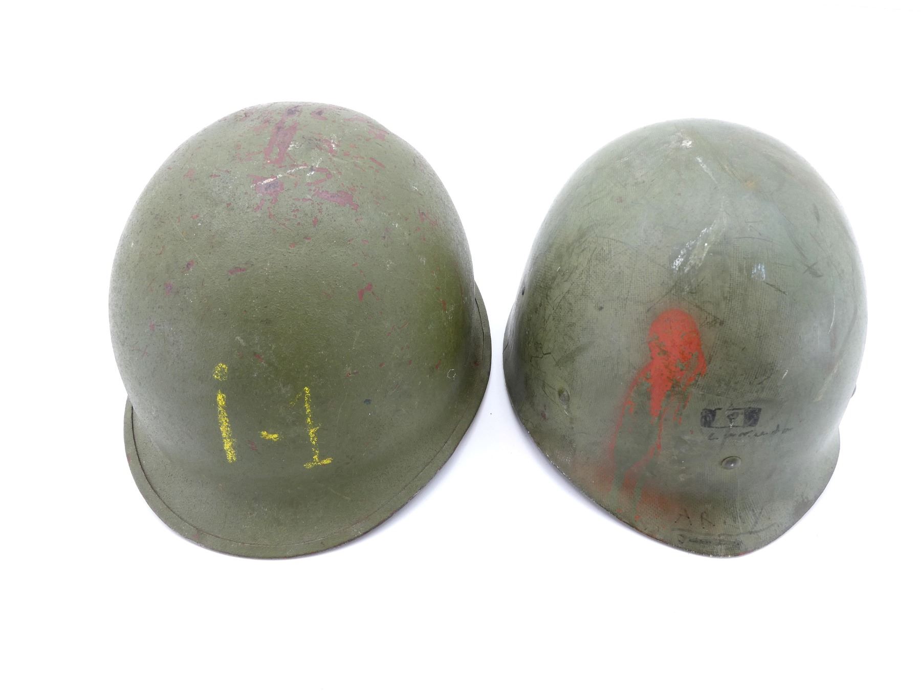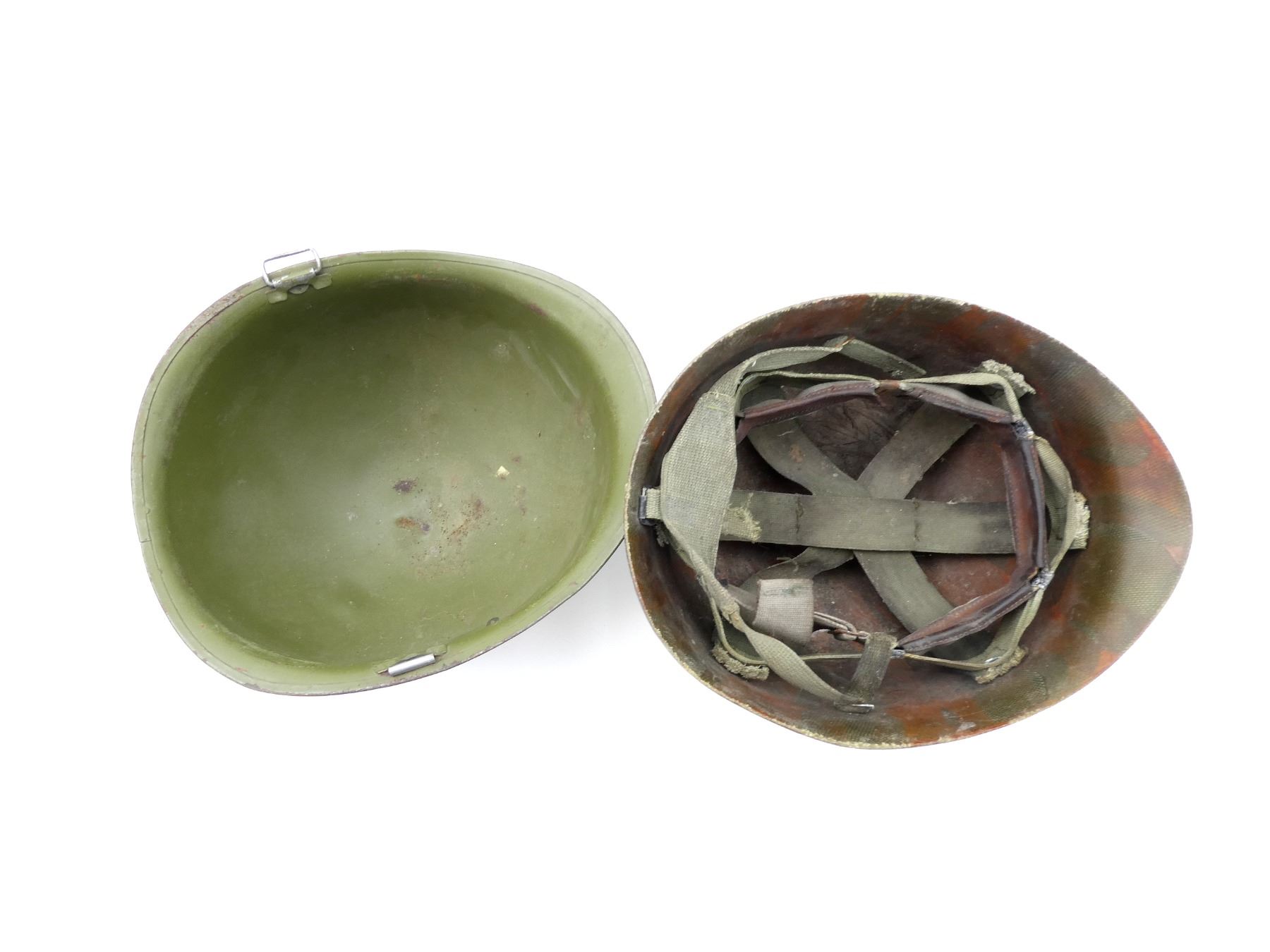 (1) GREEN PAINTED STEEL SHELL, SHELL MARKED: "9633" NEAR FRONT, FIBER HELMET LINER WITH GREEN CANVAS & BROWN LEATHER HEAD LINER, MISSING CHIN STRAP, GREEN CANVAS NECKBAND, VARIOUS FAINT / UN-CLEAR MARKINGS ON HEADBAND. SEE PHOTOS.