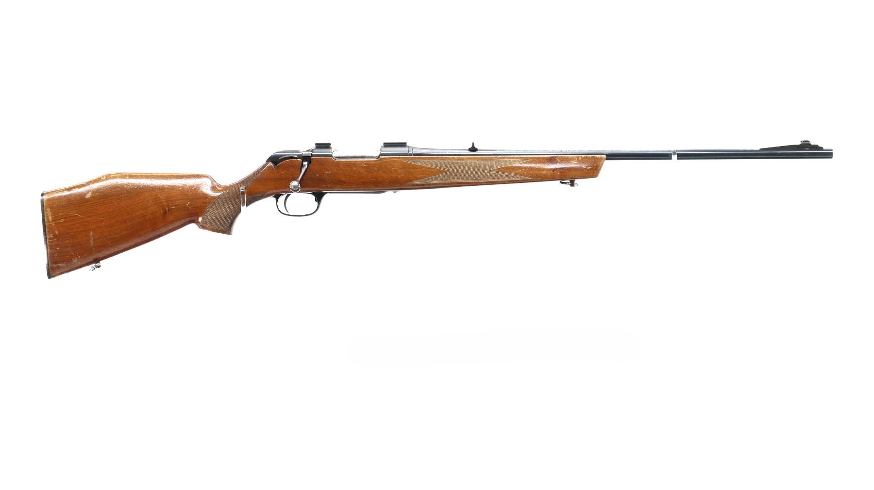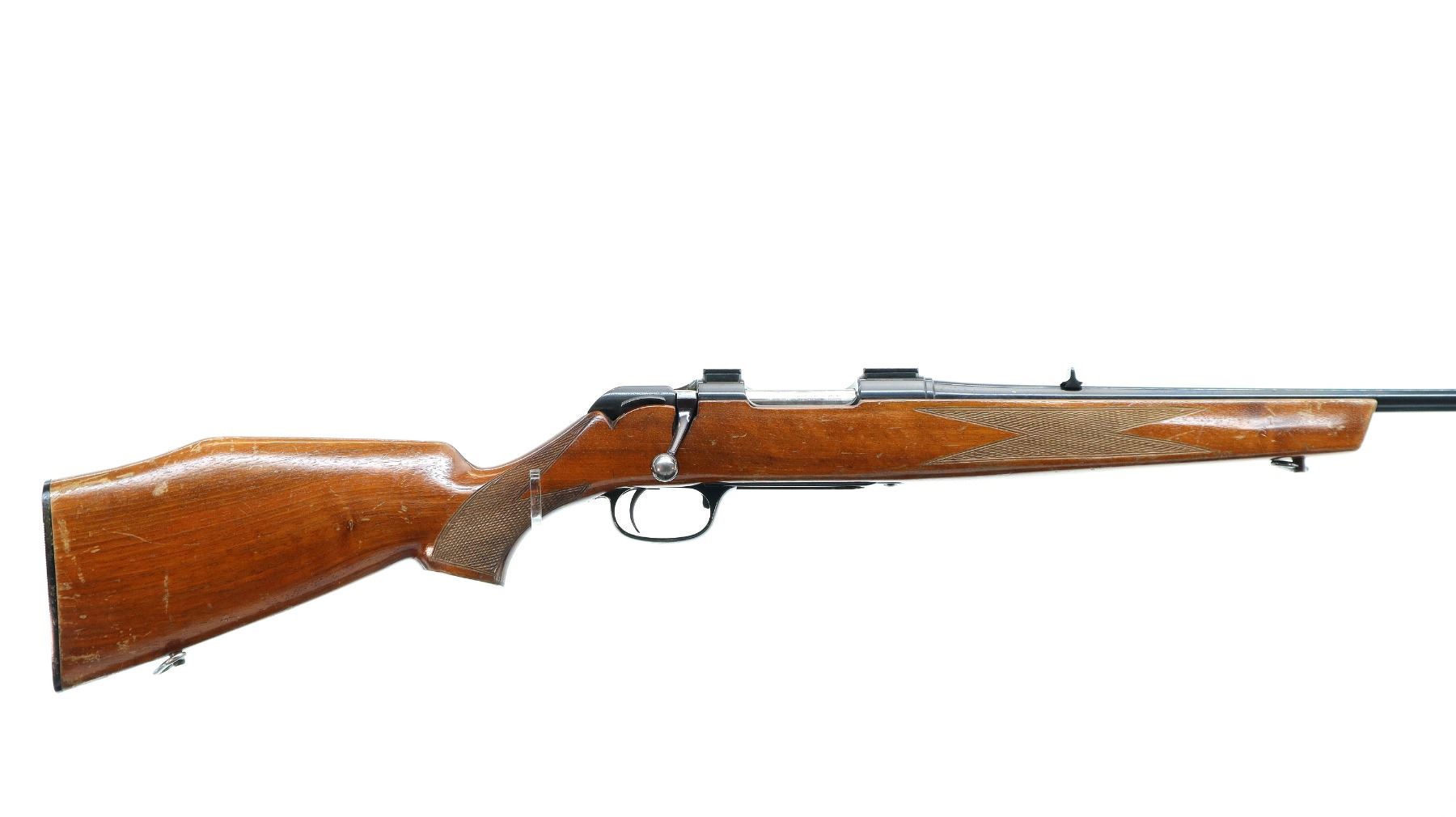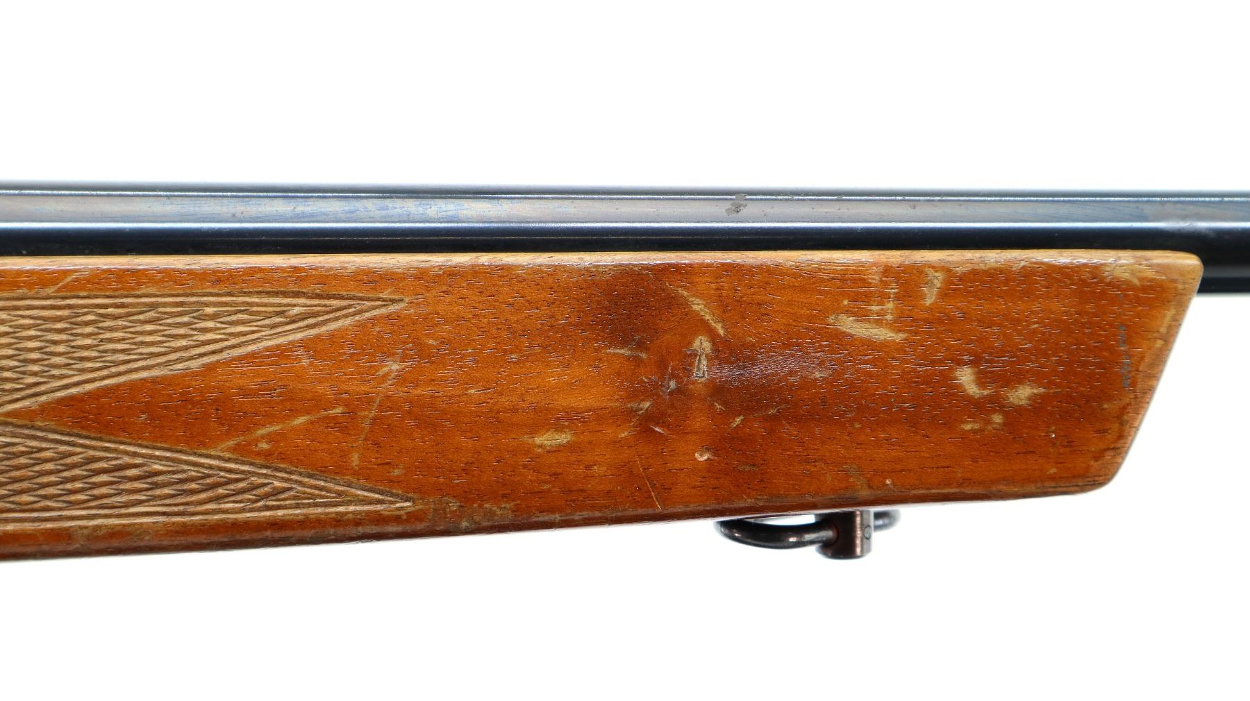 Main Description: Blade front sight with ramp, u notched rear sight, blued finish, receiver drilled and tapped with two piece scope bases installed, smooth bolt knob. One piece wood stock, checkered forearm and pistol grip, cheek rest, grooved black polymer butt plate, 13.75" LOP, sling swivels.