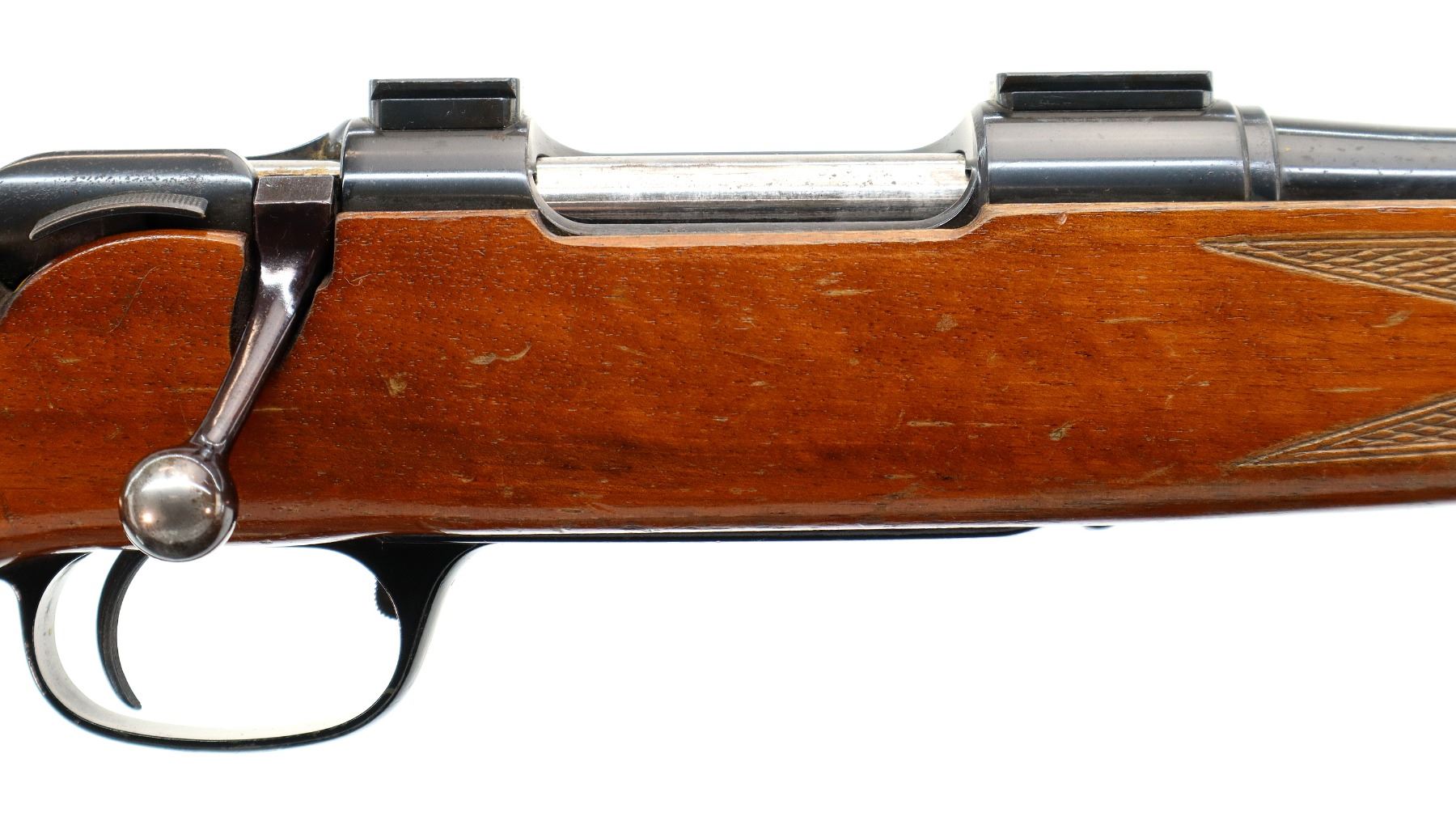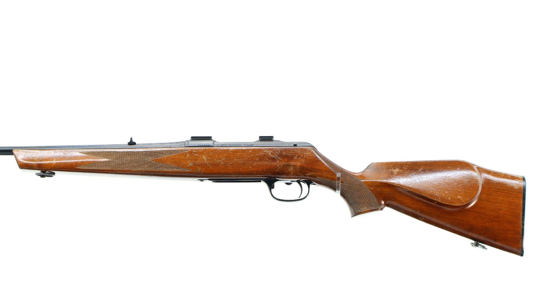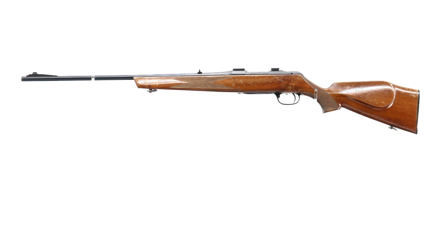 Main Description: Blade front sight with ramp, u notched rear sight, blued finish, receiver drilled and tapped with two piece scope bases installed, smooth bolt knob. One piece wood stock, checkered forearm and pistol grip, cheek rest, grooved black polymer butt plate, 13.75" LOP, sling swivels.