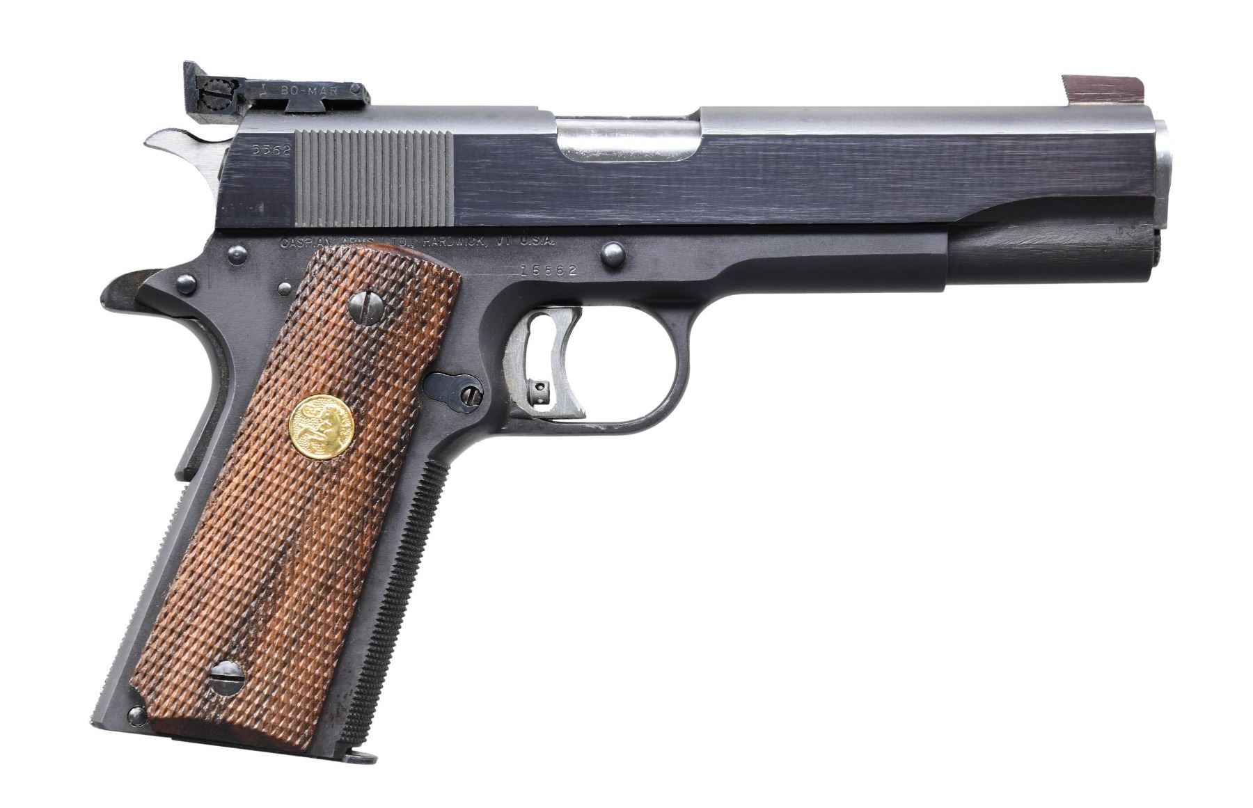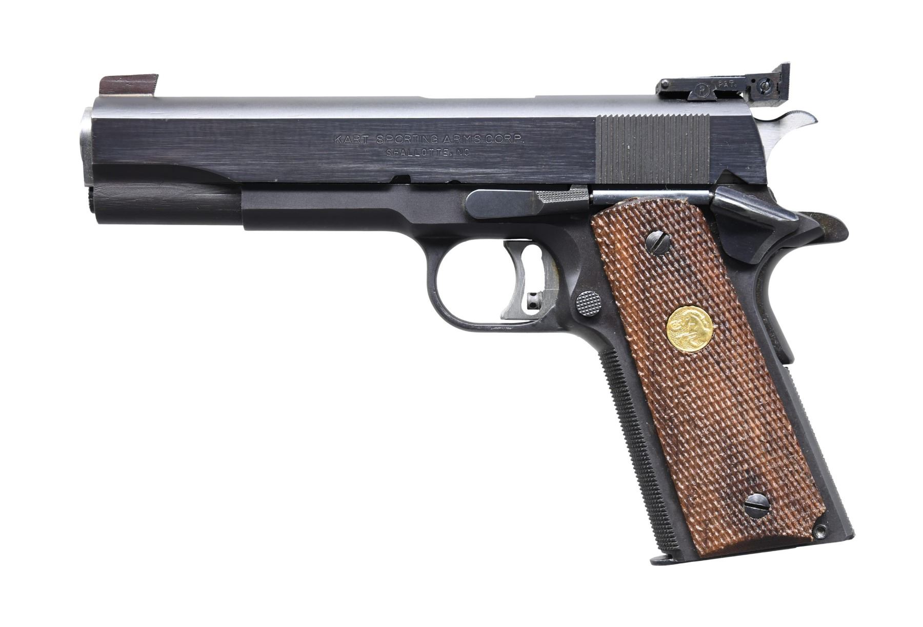 PISTOL WITH KART SLIDE & BARREL. Cal. 45 ACP. S# 15562. Top quality 5" throated Kart Match stainless barrel and NM marked stainless bushing; both zero tolerance fitted. Kart slide (numbered 5362) and frame by Caspian Arms of Wolcott, VT; both components hand fitted and match tight plus noticeably smooth. Slide has undercut serrated front sight with squared face plus Bo-Mar adjustable target sight at rear. Ejection port is not flared. Fitting of barrel and bushing are very tight and likely will require a break in period for complete reliability. Front grip strap is checkered for non slip grip as is mainspring housing. Wide Colt Gold Cup trigger with overtravel adjustment; balance of frame parts have standard Government or commercial appearance. Fully checkered walnut grips with slotted grip screws and gold Colt medallions. Magazine well is lightly flared to facilitate magazine insertion. MAGS: 1 Shooting Star 7 rd. with noticeable relief polishing at midpoint near mag. latch area plus base pre-drilled for bumper pad. CONDITION: all aspects near excellent with new, unfired appearance. Thumb safety functions on safe position, but if trigger is pulled while on safe and then if safety is moved to the fire position, the hammer falls to its "safe" position rather than properly staying fully cocked; recommend gunsmith attention. Near excellent bore. Extremely tight and smooth fit overall that appears ready for a couple hundred break in rounds. (25-3304/NW). MODERN. $650-900.