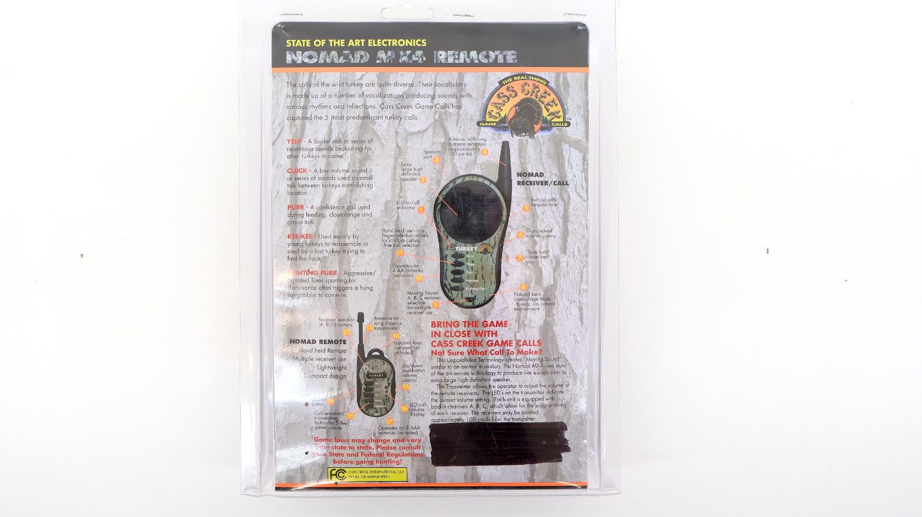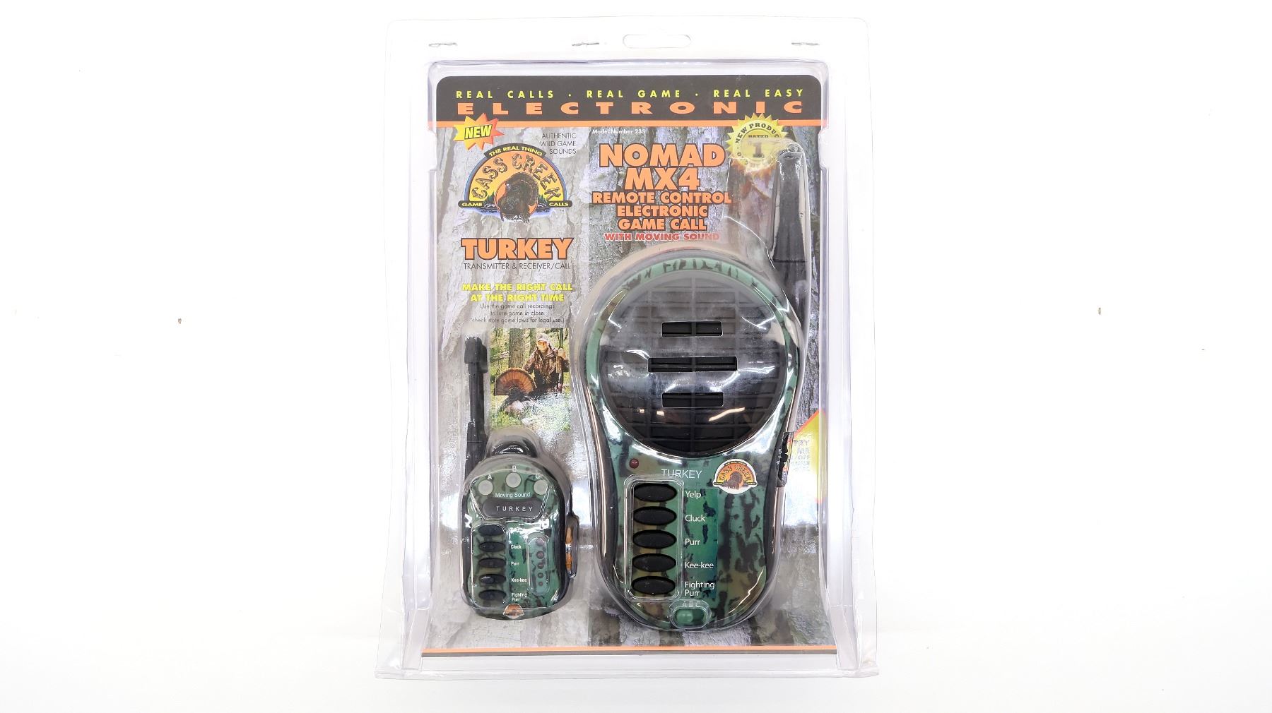 (1) NOMAD MX4 REMOTE CONTROL CALL WITH MOVING SOUND, WITH CLUCK, YELP, PURR, KEE-KEE & FIGHTING PURR OPTIONS, VOLUME CONTROL DIAL, NEW OLD STOCK IN ORIGINAL SEALED PACKAGING. SEE PHOTOS.