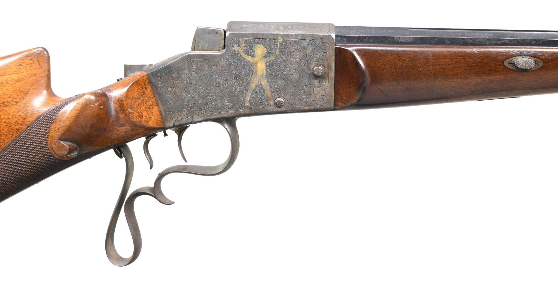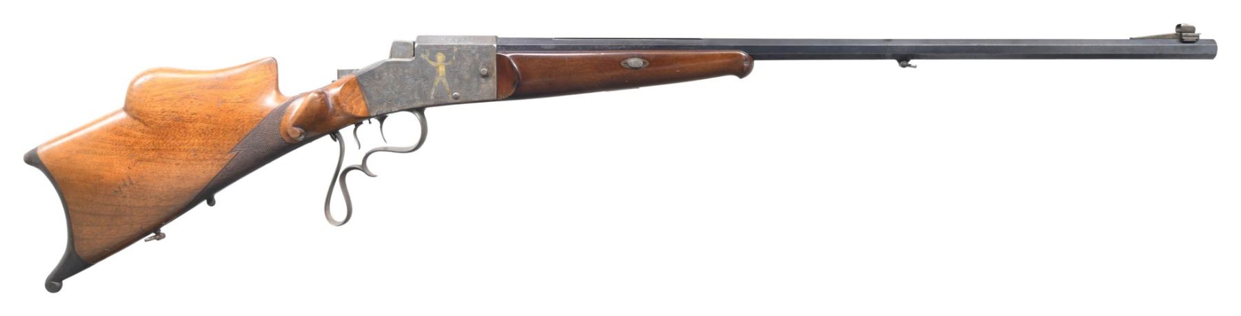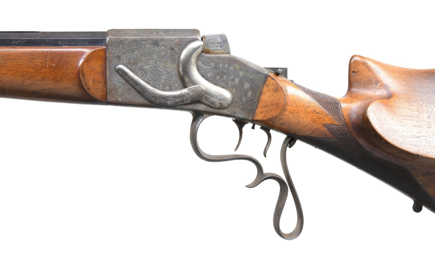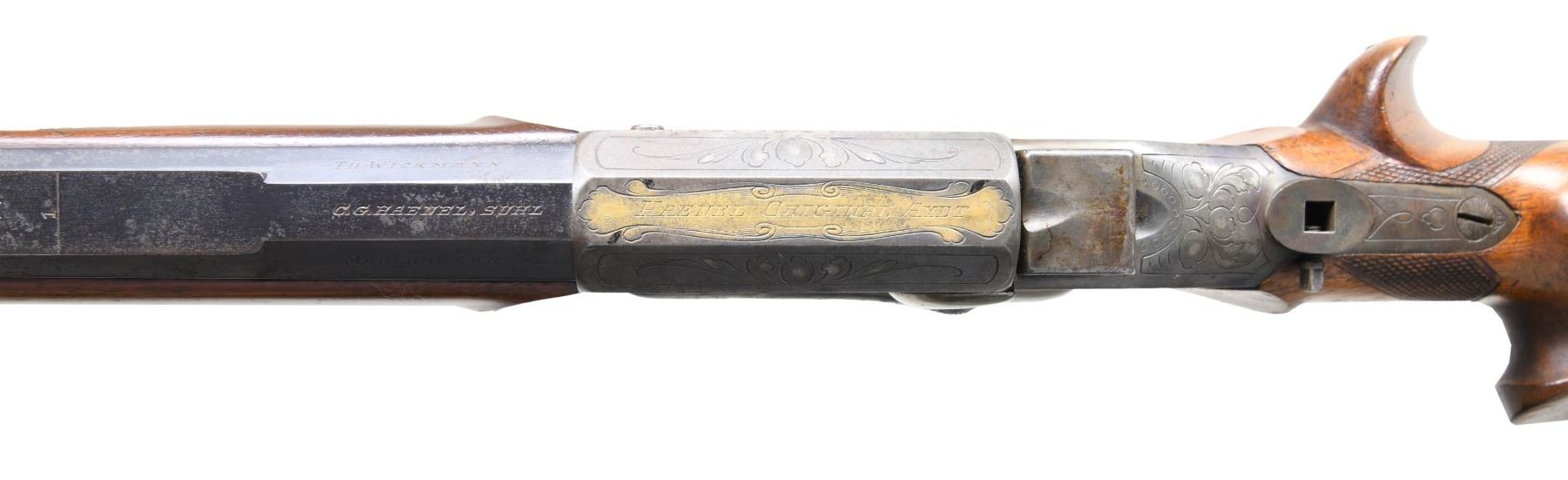 Cal. 8.14x46 Norm. NSN (# 20750 on breech block & barrel). Oct. 31.5" bbl. having German March 1925 proofs; cal. when originally proofed was "7,7mm". Ramp mounted protected blade front sight. Barrel markings on flats include " TH. WICKMANN / C.G.HAENEL, SUHL / MUHLHAUSEN". Bottom of bbl. has sling swivel. Falling block action w/ scroll engraving throughout. Top of receiver has gold inlaid "HAENEL ORIGINAL AYDT". Right side of receiver gold inlaid Cherub surrounded with stippled background. Dbl. set triggers, ornate finger rest triggerguard bow acts as lever for breech block & target sight base on top tang. Wedge fastened walnut schnabel forearm w/ brass plate on bottom engraved "E KAISER". Walnut stock w/ point pattern checkering, right side thumb rest, left side large offset cheek rest, toeline sling swivel & Scheutzen buttplate. CONDITION: fair barrel blue missing with brown patina showing marks, peppery oxidation & 1 large dent on left side. Faded case colors on receiver showing patina & peppery oxidation. Good wood finish with marks. Good bore with light fouling, wear to rifling forward of chamber & showing pinprick pitting near muzzle. (25-2014/MD). CURIO. $800-1,200.